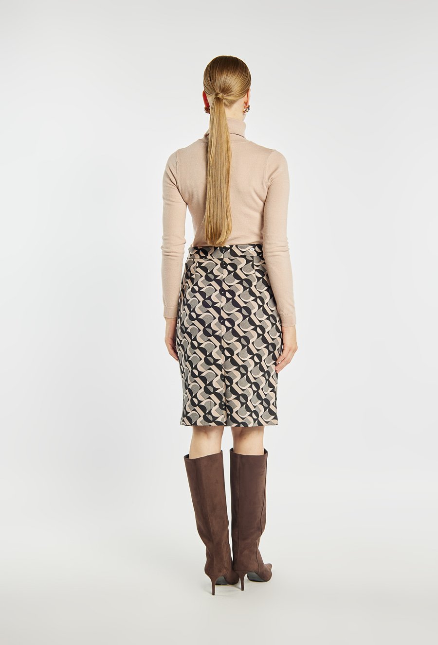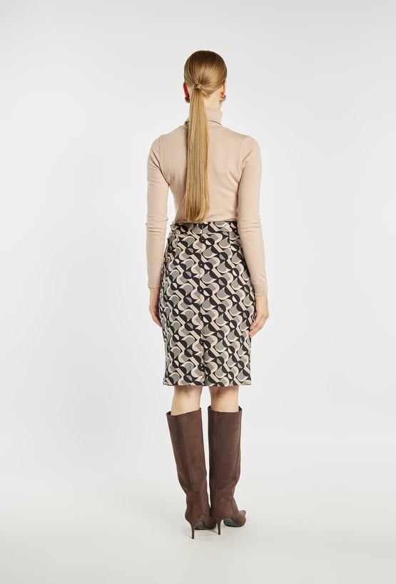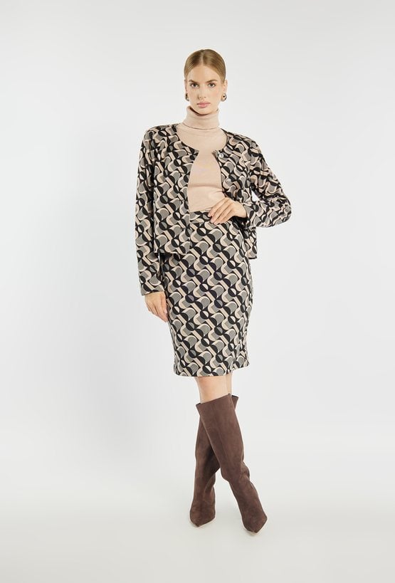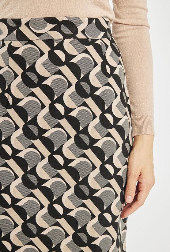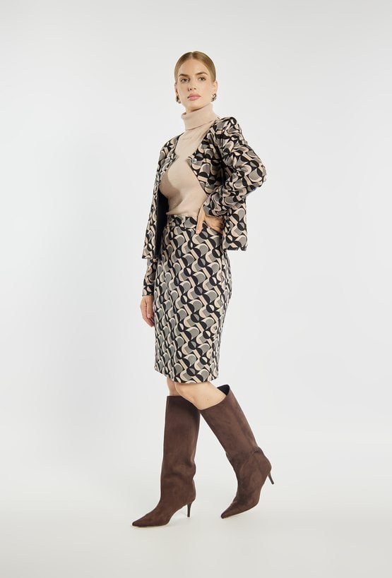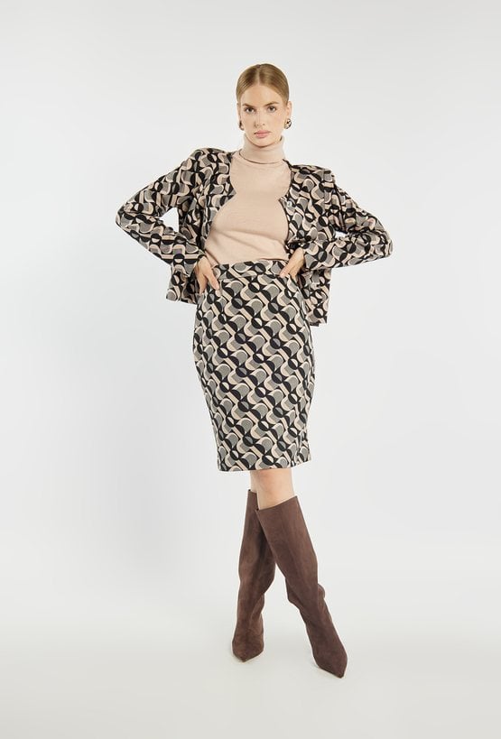 Elegancka spódnica ołówkowa z geometrycznym wzorem. Model o dopasowanym kroju pięknie podkreśla sylwetkę, a elastyczny materiał zapewnia komfort noszenia. Idealna do biura lub na spotkania. Spódnica świetnie komponuje się z żakietem z tej samej kolekcji, tworząc spójny, stylowy zestaw. Kod do żakiety 25Z-BZR0790. Modelka na zdjęciu ma 177 cm wzrostu i prezentuje rozmiar 36.