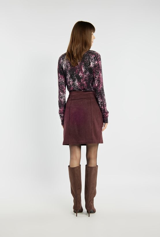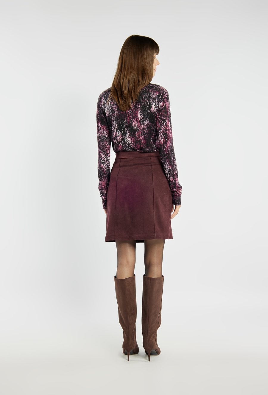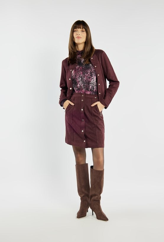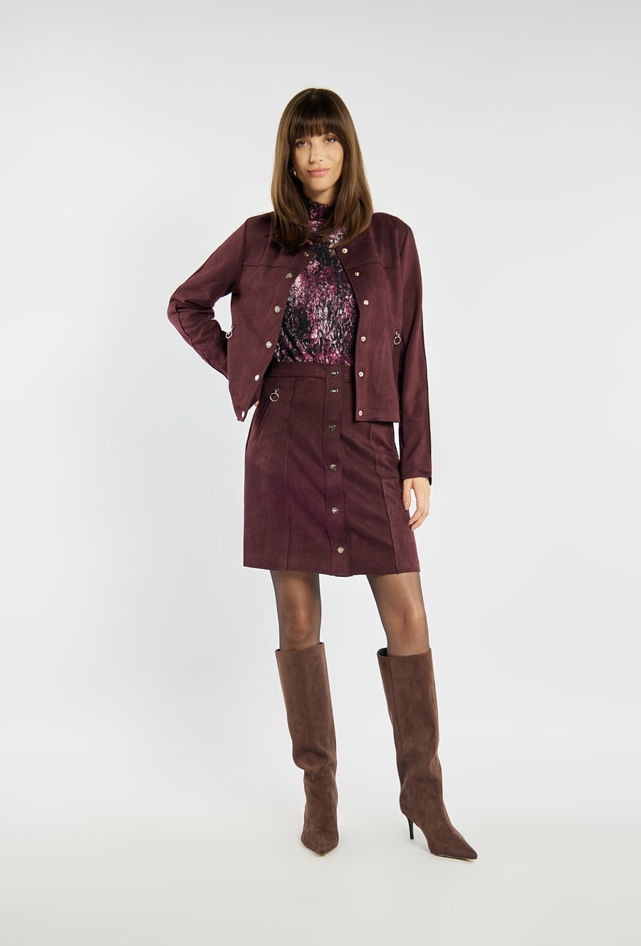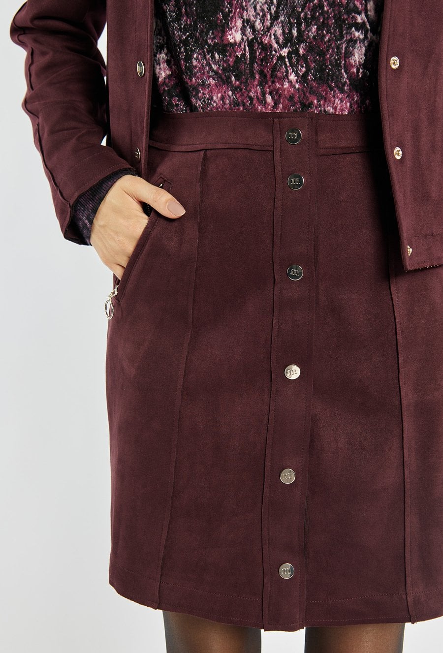 Damska spódnica o klasycznym kroju, zapinana z przodu na napy. Minimalistyczny fason sprawia, że świetnie komponuje się zarówno z koszulą, jak i swetrem, tworząc stylizacje na różne okazje – od codziennych po bardziej wyjściowe. Można ją skompletować z dopasowanym żakietem, tworząc spójny i szykowny zestaw.