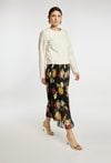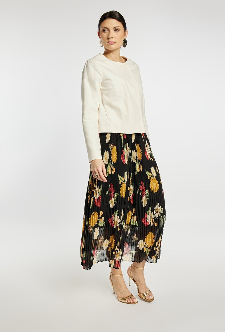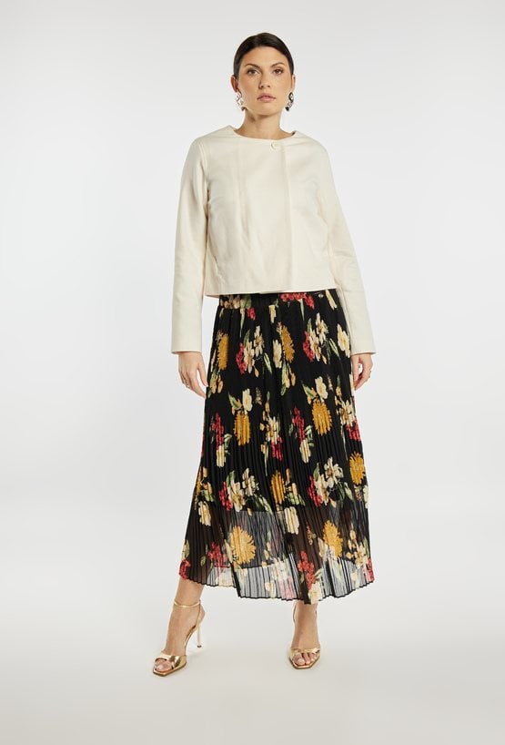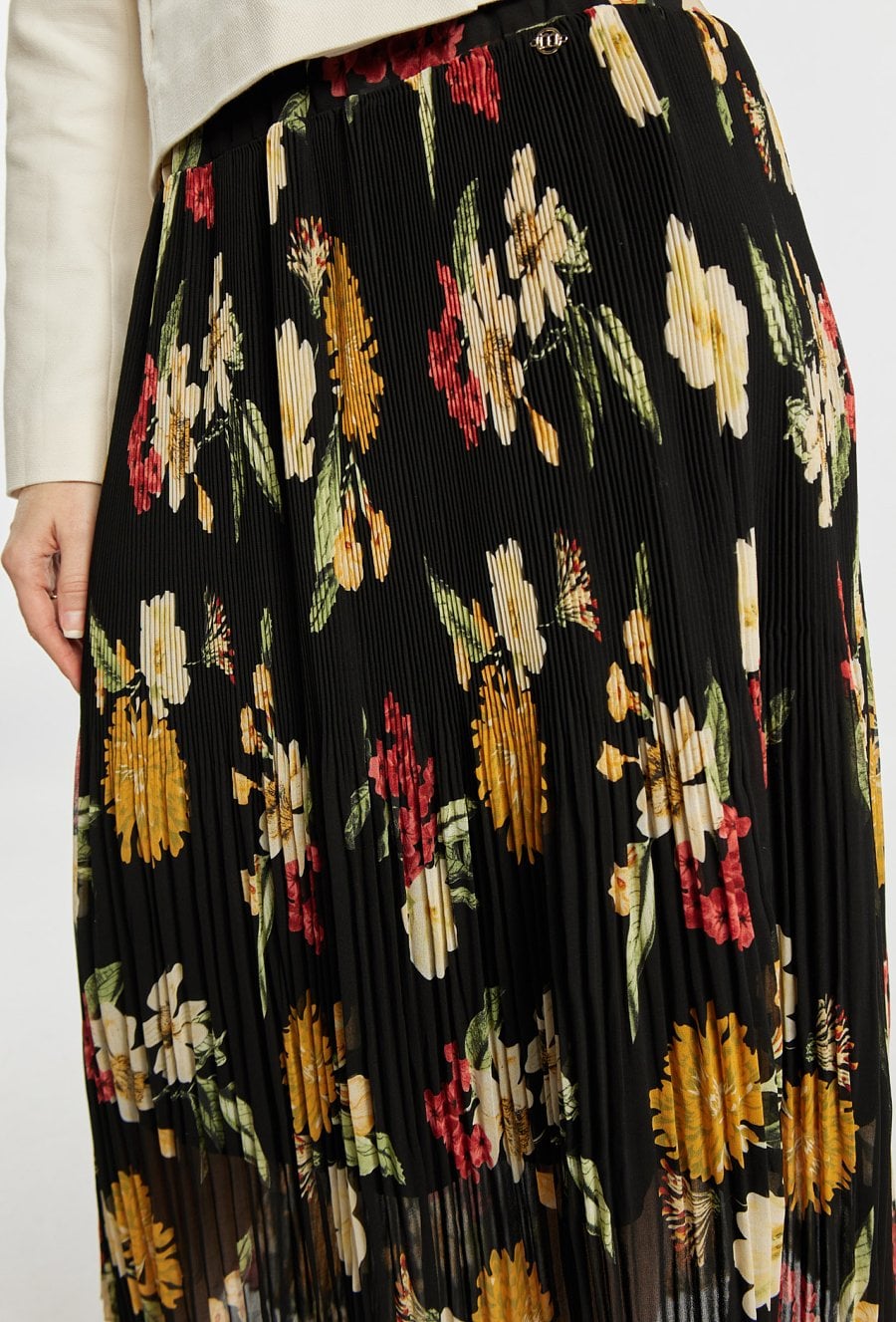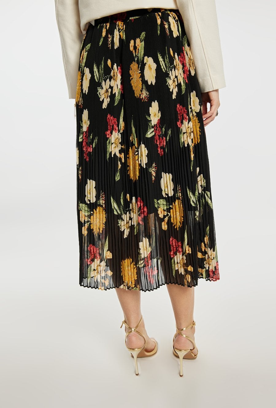 Elegancka spódnica damska o długości midi z plisowanego materiału. Model z delikatnym wzorem oraz elastycznym pasem zapewnia komfort noszenia i pięknie układa się na sylwetce. Spódnica doskonale sprawdzi się w eleganckich stylizacjach na spotkania, przyjęcia oraz różne uroczystości. Modelka na zdjęciu ma 177 cm wzrostu i prezentuje rozmiar 36.