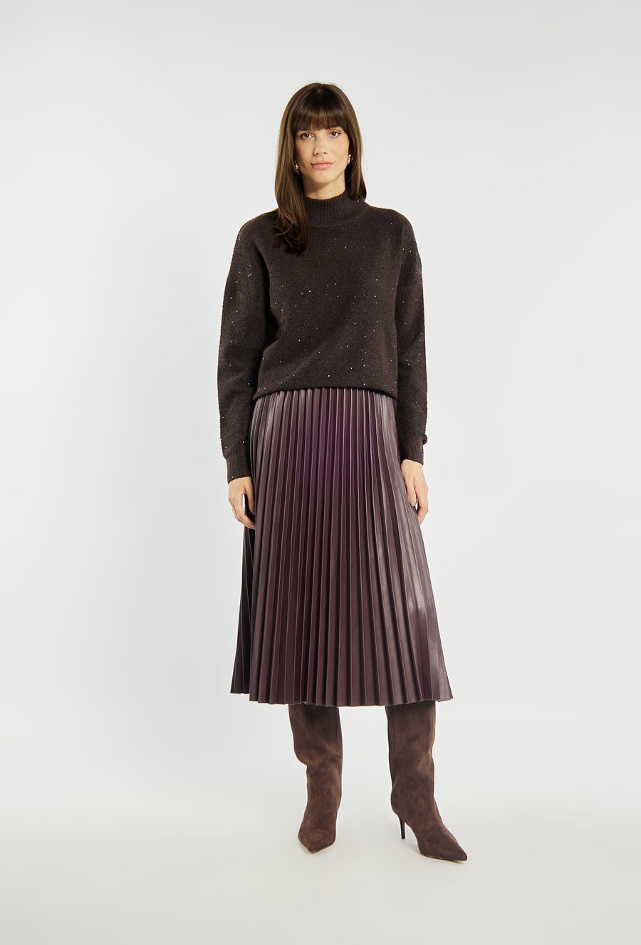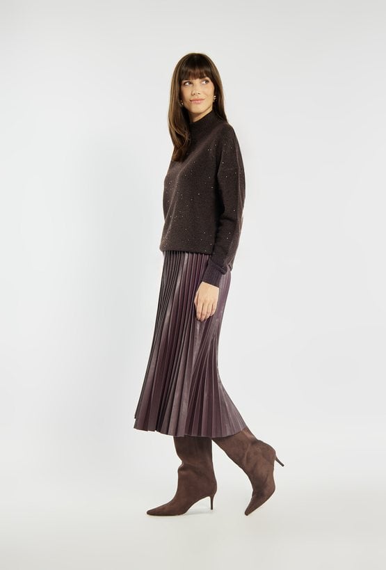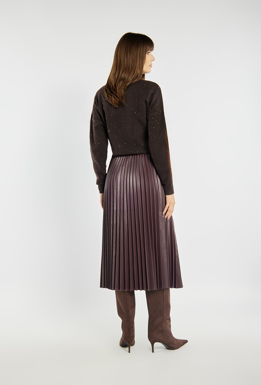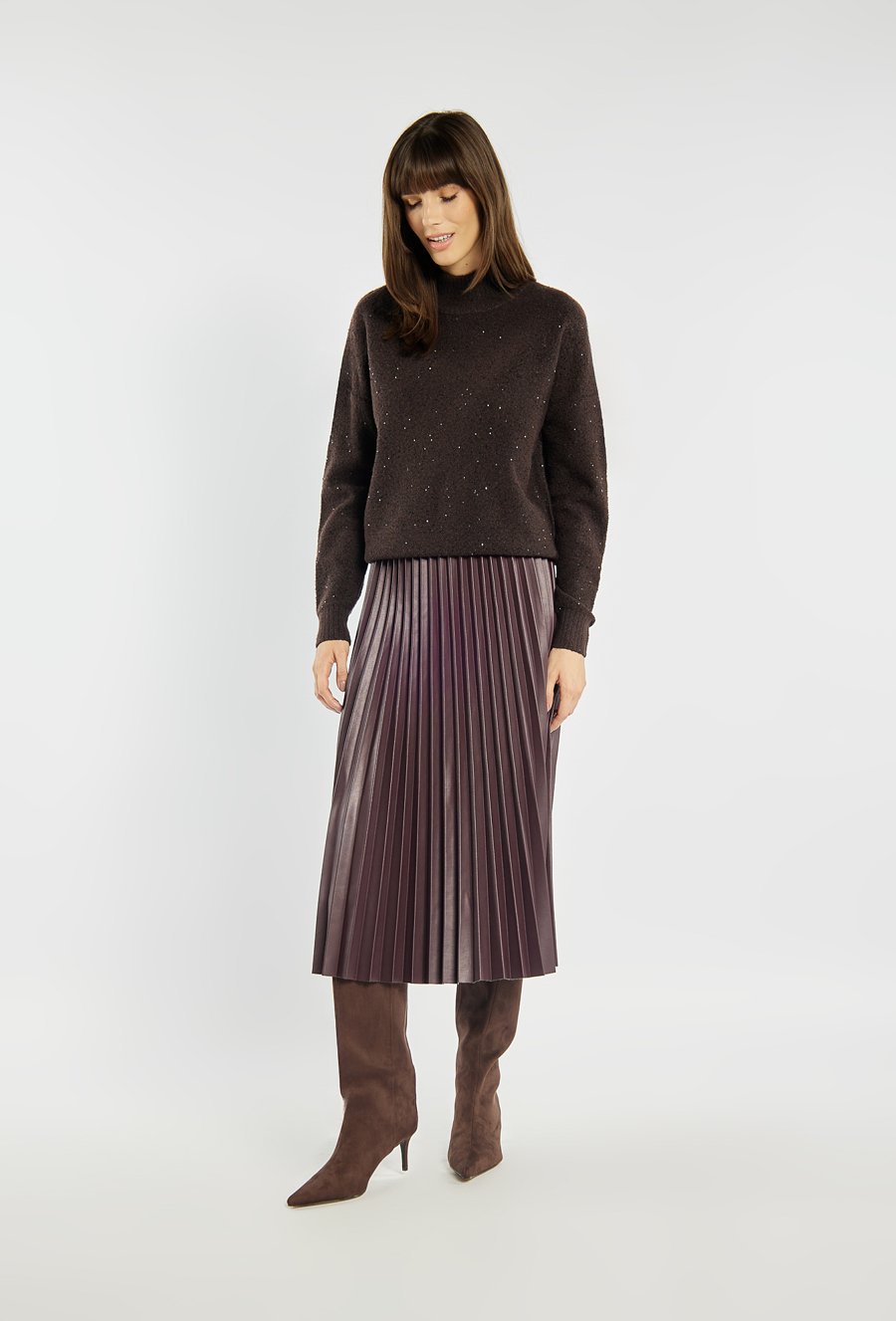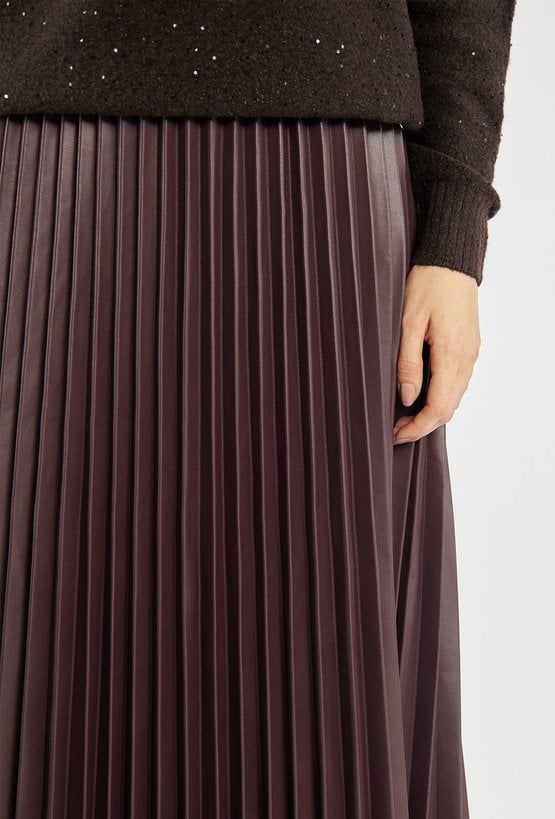 Plisowana spódnica o długości midi. Gumka w pasie zapewnia wygodę noszenia i idealne dopasowanie do sylwetki. Klasyczne plisy nadają jej lekkości i elegancji, a jednocześnie sprawiają, że świetnie łączy się zarówno z codziennymi, jak i bardziej formalnymi stylizacjami. Doskonała propozycja do botków, kozaków czy eleganckich szpilek. Modelka na zdjęciu ma 177 cm wzrostu i prezentuje rozmiar 36.