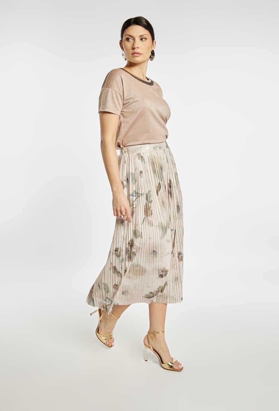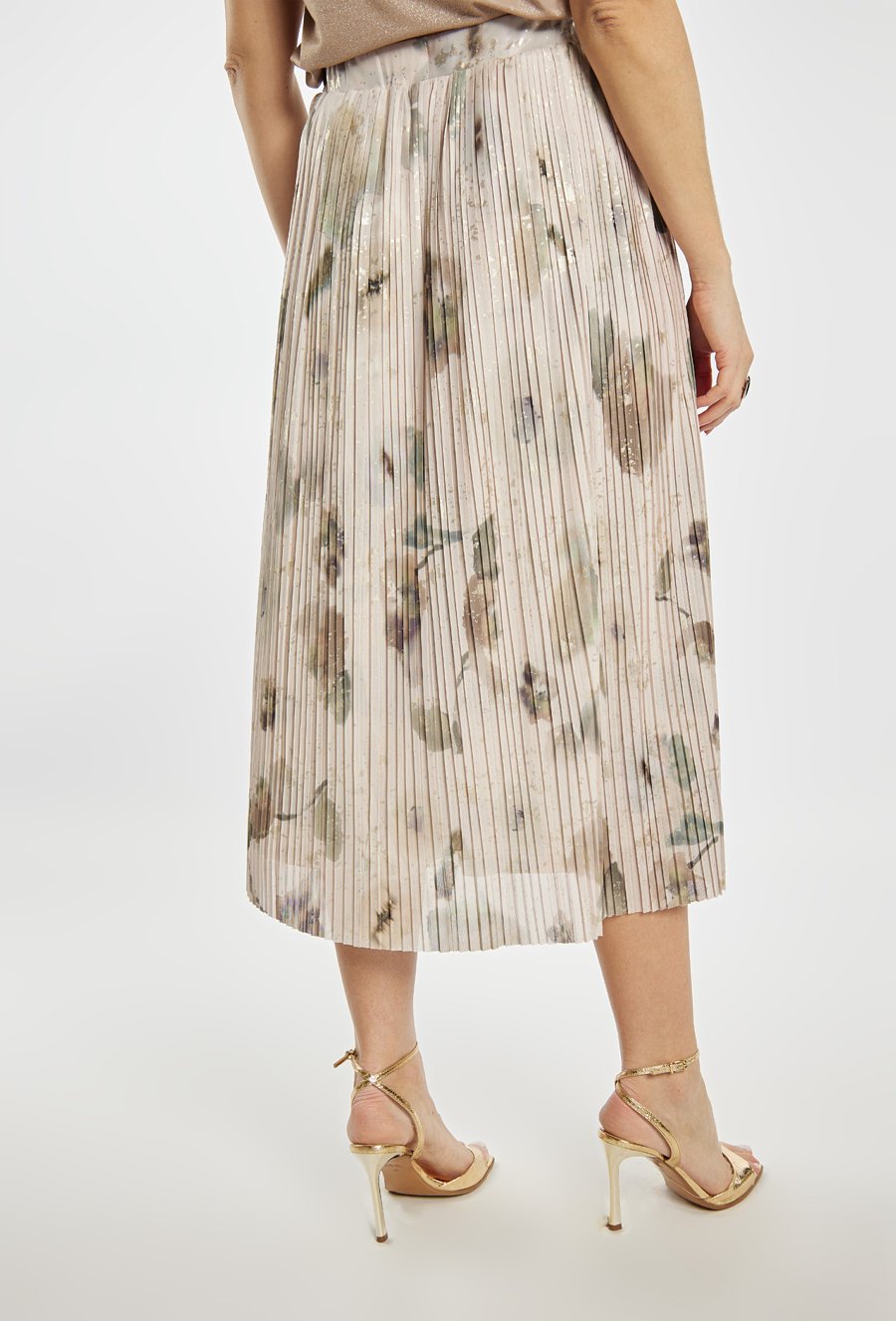 Spódnica damska o lekkim, plisowanym kroju. Model o długości midi z elastyczną talią, który zapewnia wygodne dopasowanie i swobodę ruchów. Delikatny wzór nadaje całości kobiecego i subtelnego charakteru, a zwiewna forma pięknie układa się w ruchu. Plisowana spódnica midi doskonale sprawdzi się w stylizacjach eleganckich oraz na co dzień. Modelka na zdjęciu ma 177 cm wzrostu i prezentuje rozmiar S.