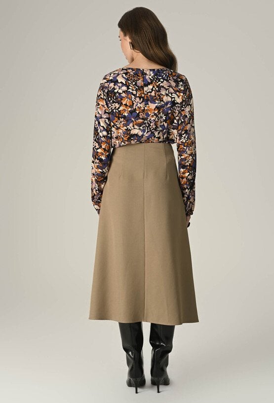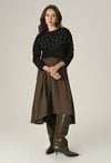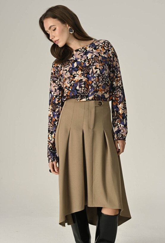 Damska spódnica z plisami na przodzie i wydłużonym tyłem, które nadają jej dynamicznego charakteru. Zamek i guzik z przodu zapewniają wygodę zakładania. Idealna na co dzień, łącząc styl z funkcjonalnością. Modelka na zdjęciu ma 173 cm wzrostu i prezentuje rozmiar 36.