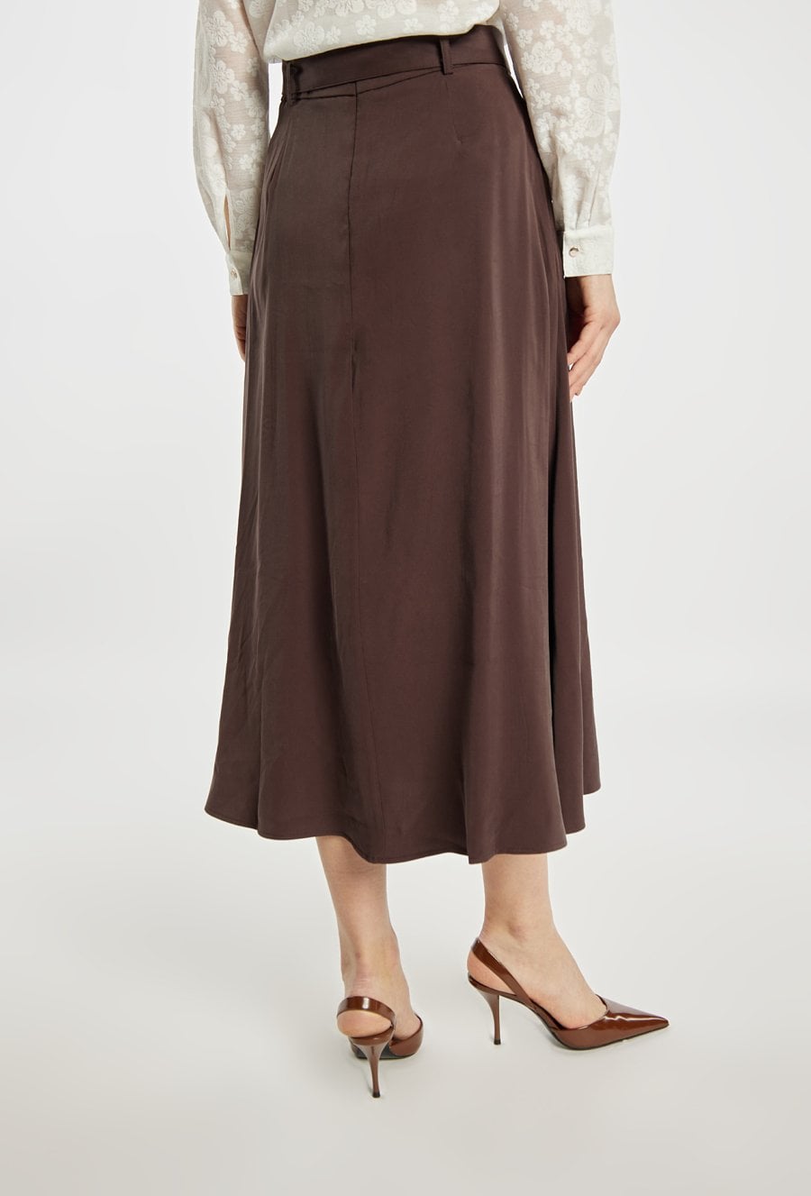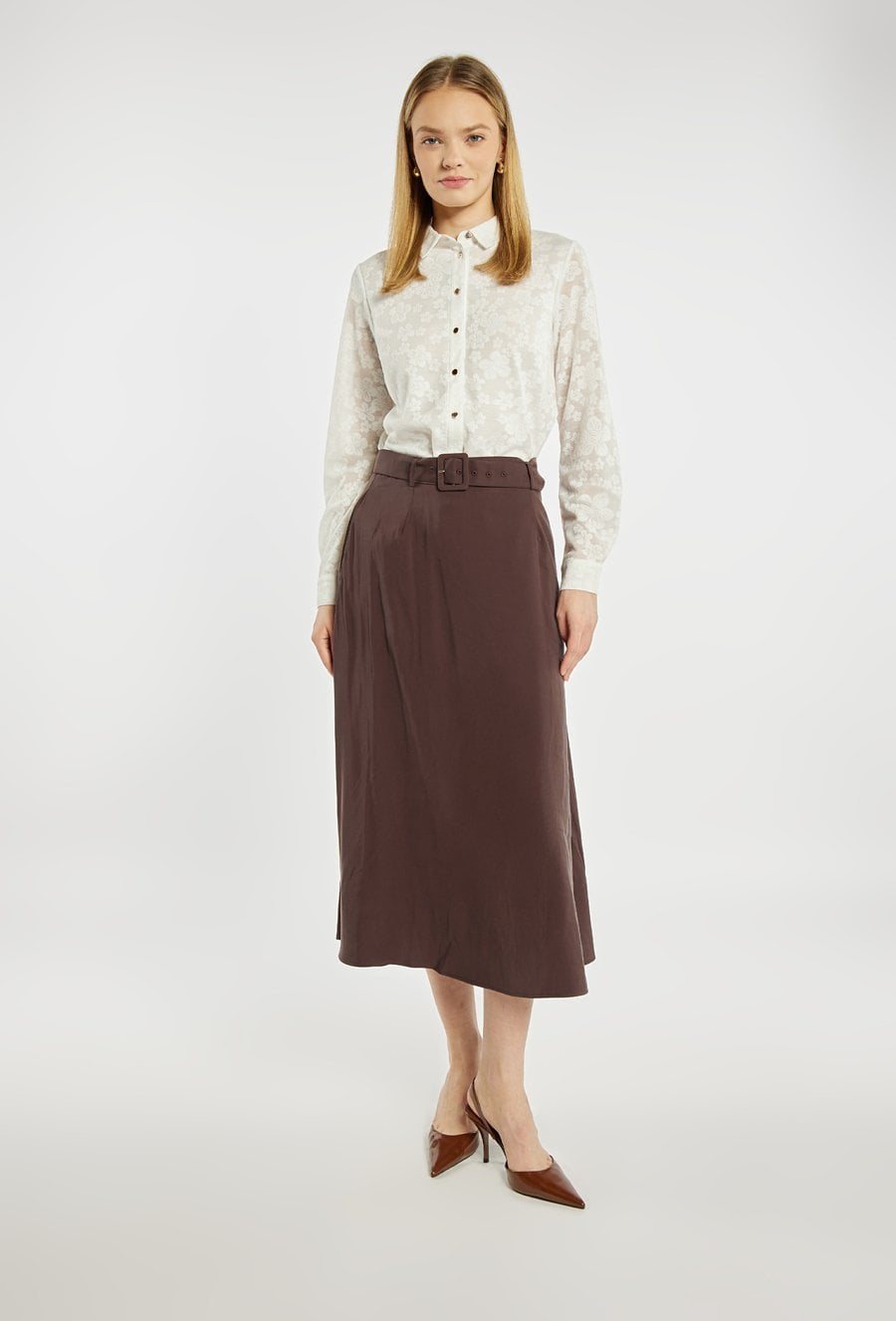 Elegancka spódnica o długości midi, zaprojektowana w klasycznym, kobiecym fasonie. Model z wysokim stanem i delikatnymi zakładkami z przodu, które nadają całości lekkości i ładnie układają się w ruchu. Pasek z klamrą podkreśla talię i stanowi stylowy akcent. Doskonale sprawdzi się zarówno w zestawieniu z koszulą lub bluzką do pracy, jak i w bardziej eleganckich stylizacjach na specjalne okazje. Modelka na zdjęciu ma 177 cm wzrostu i prezentuje rozmiar 36.