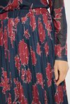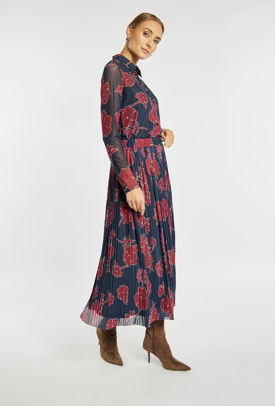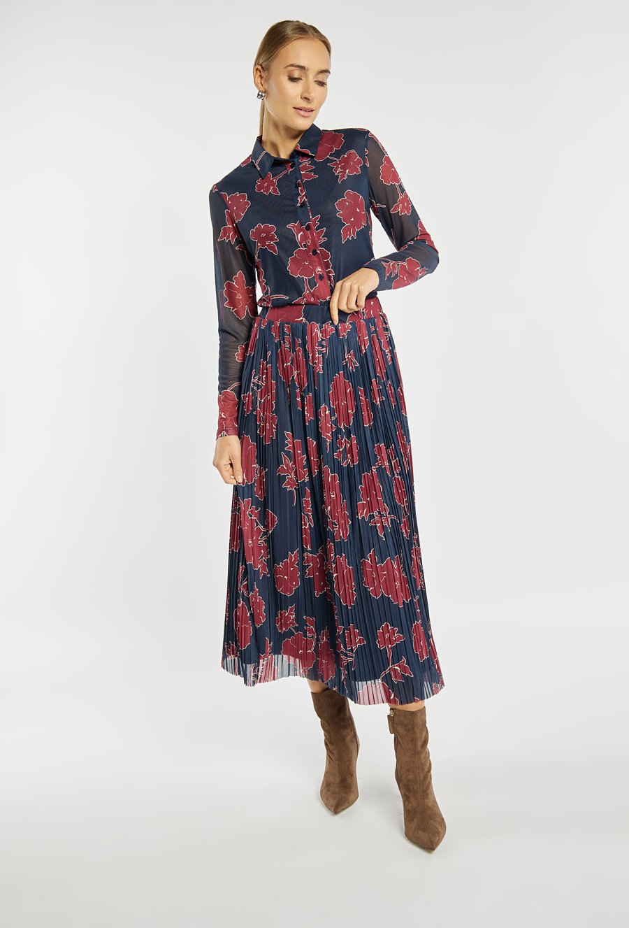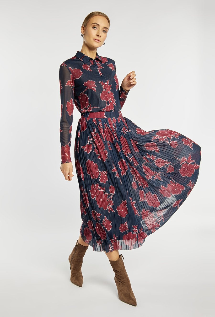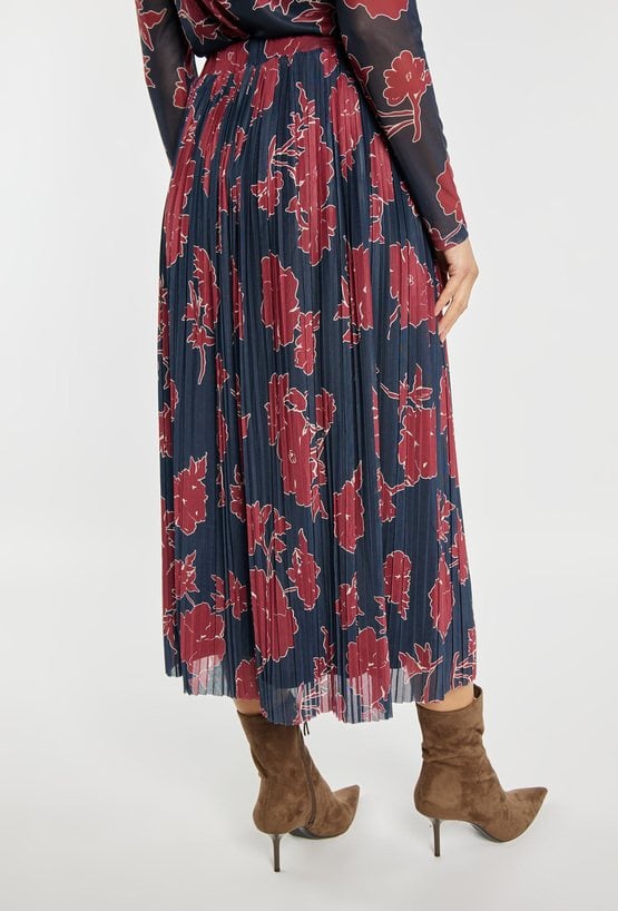 Plisowana spódnica midi z gumką w pasie zachwyca kobiecym kwiatowym wzorem w wyrazistej kolorystyce, który nadaje stylizacji elegancji i lekkości. Model idealny na co dzień, do pracy oraz na wyjątkowe okazje. Modelka na zdjęciu ma 177 cm wzrostu i prezentuje rozmiar S.