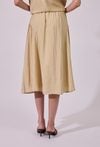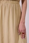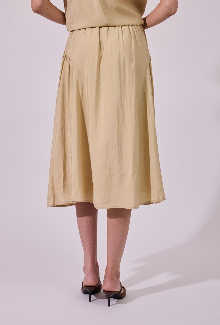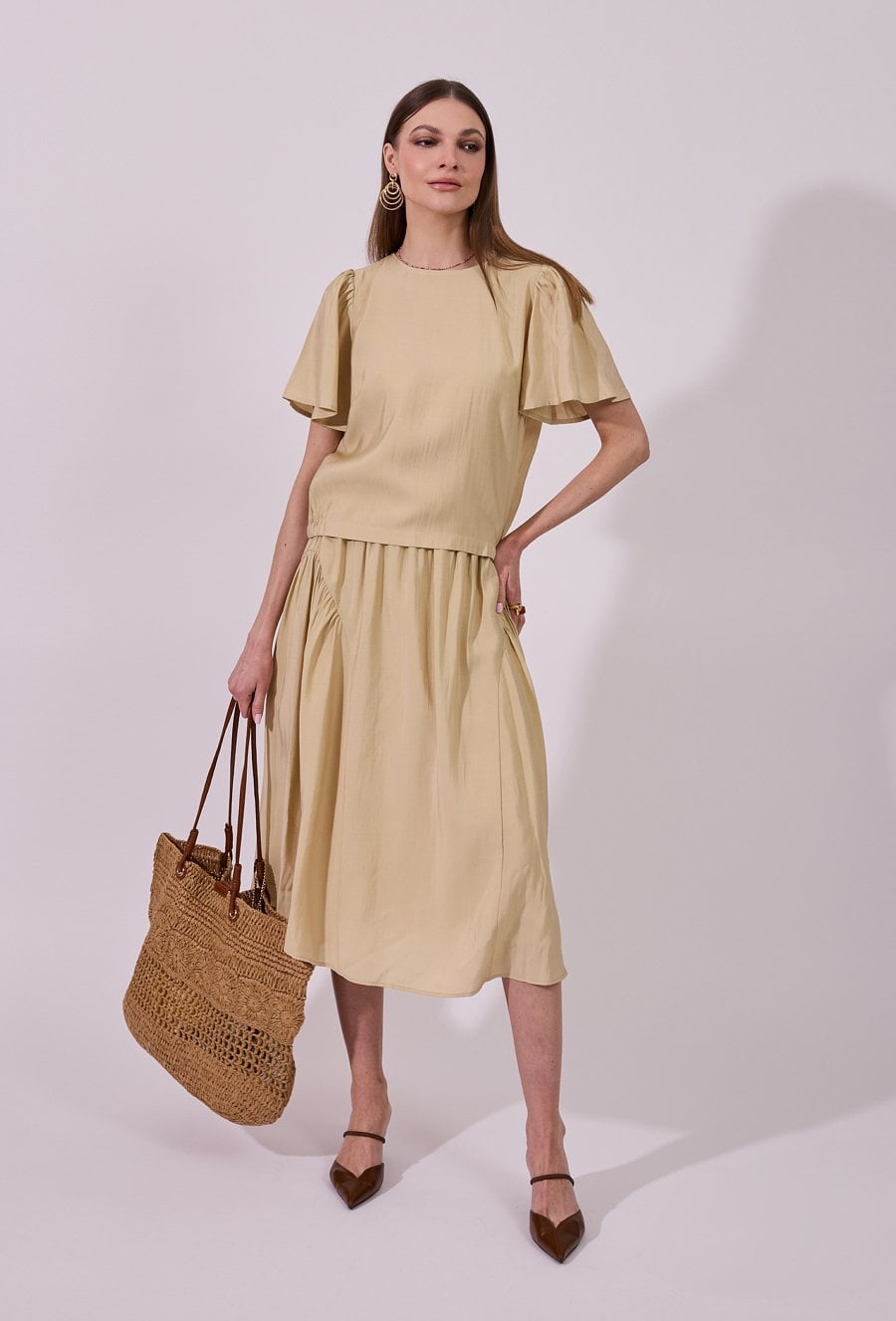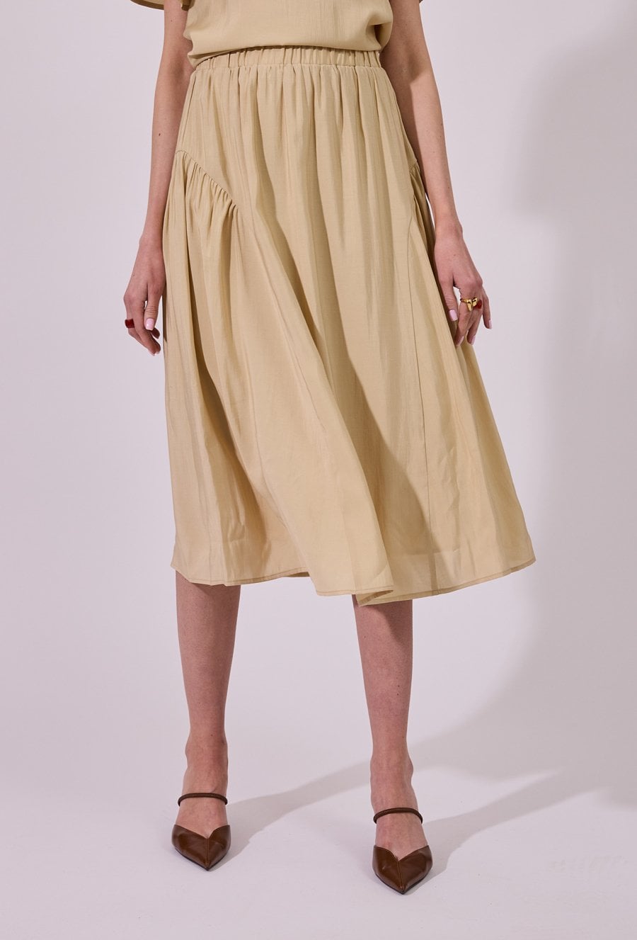 Spódnica damska o zwiewnym, rozkloszowanym kroju midi. Model z wysokim stanem i delikatnym marszczeniem w pasie, które nadaje całości lekkości i kobiecego charakteru. Modelka na zdjęciu ma 177 cm wzrostu i prezentuje rozmiar 36.