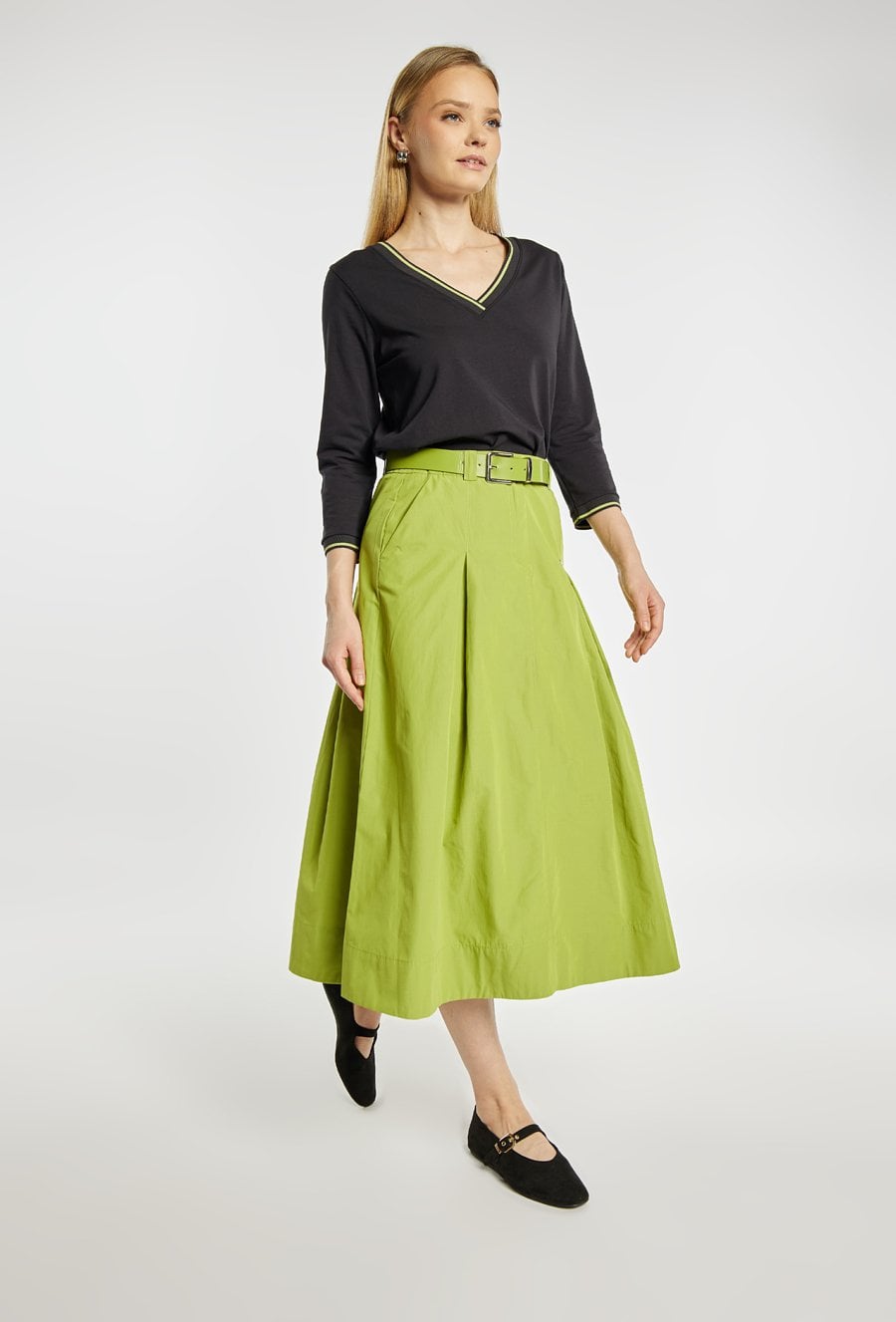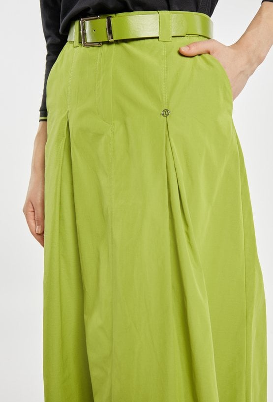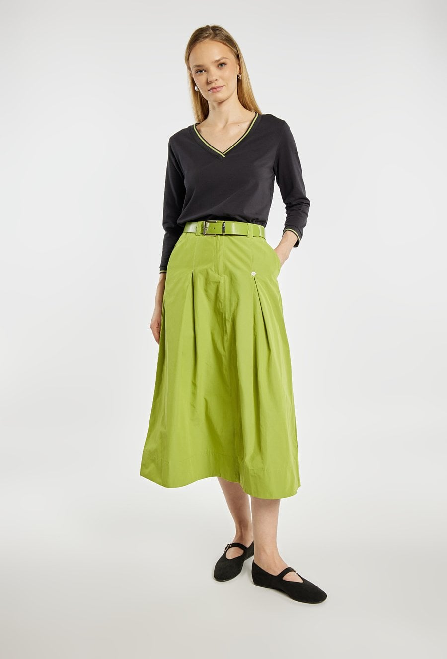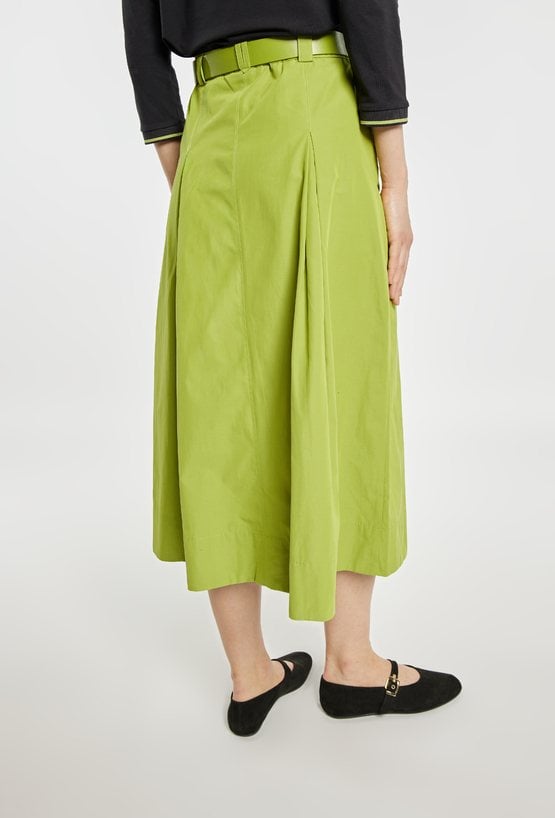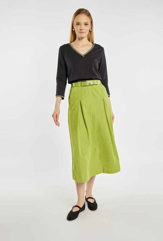 Spódnica o rozkloszowanym fasonie i długości midi, z wyraźnie zaznaczoną talią podkreśloną paskiem. Model z delikatnymi kontrafałdami z przodu, które nadają całości lekkości i elegancji, oraz praktycznymi kieszeniami po bokach. Idealna zarówno do codziennych stylizacji, jak i bardziej eleganckich zestawów, np. z dopasowanym swetrem lub bluzką. Modelka na zdjęciu ma 177 cm wzrostu i prezentuje rozmiar 36.
