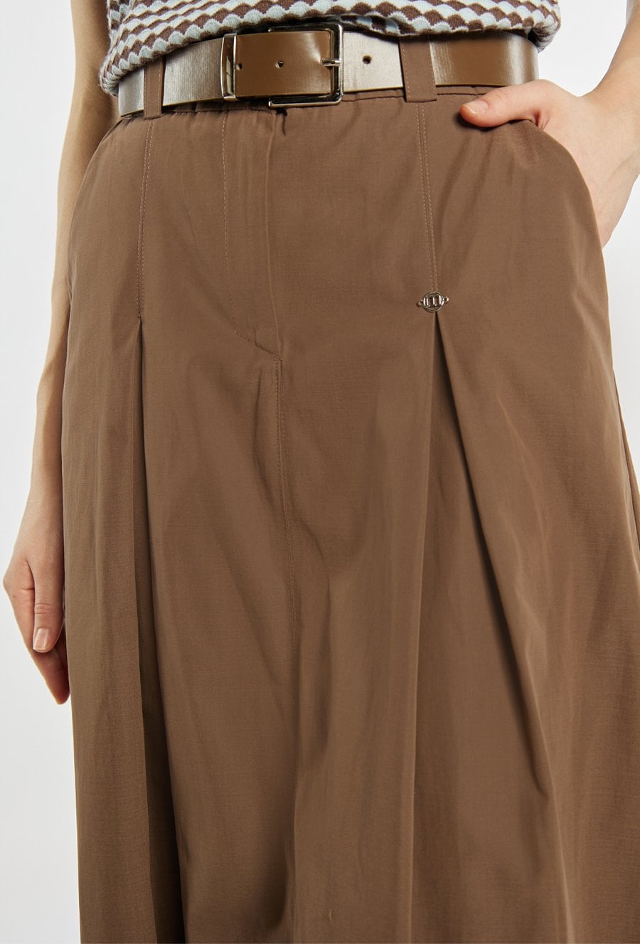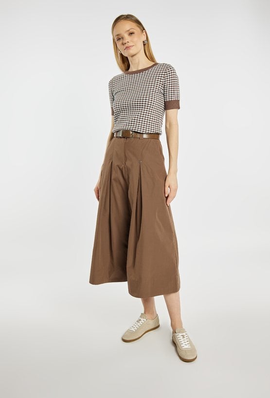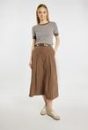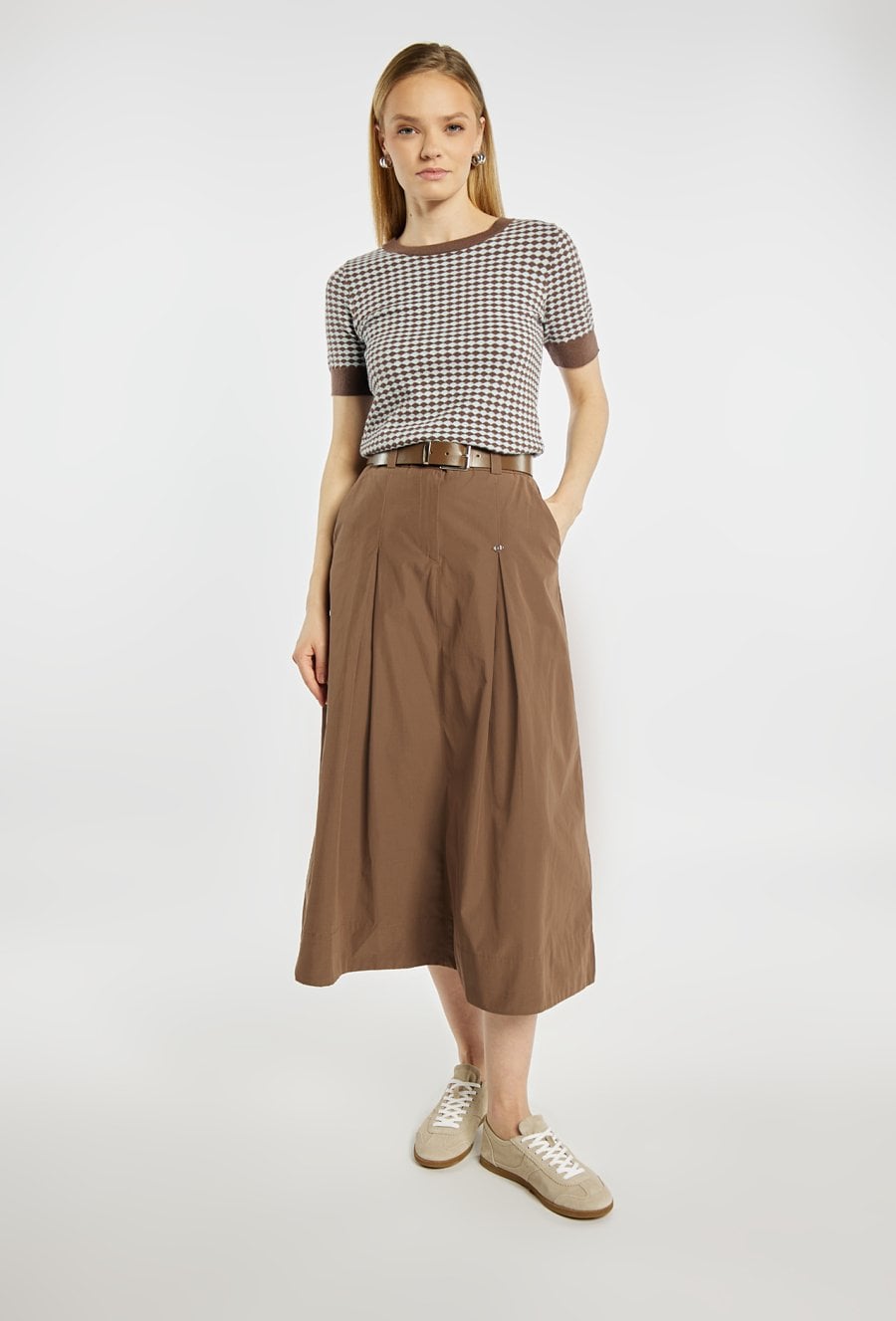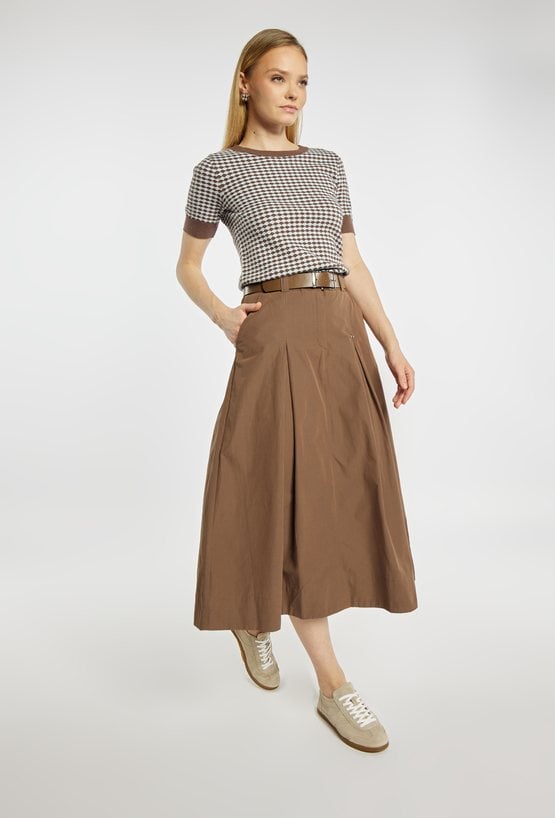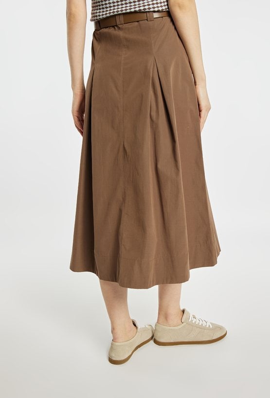 Spódnica o rozkloszowanym fasonie i długości midi, z wyraźnie zaznaczoną talią podkreśloną paskiem. Model z delikatnymi kontrafałdami z przodu, które nadają całości lekkości i elegancji, oraz praktycznymi kieszeniami po bokach. Idealna zarówno do codziennych stylizacji, jak i bardziej eleganckich zestawów, np. z dopasowanym swetrem lub bluzką. Modelka na zdjęciu ma 177 cm wzrostu i prezentuje rozmiar 36.