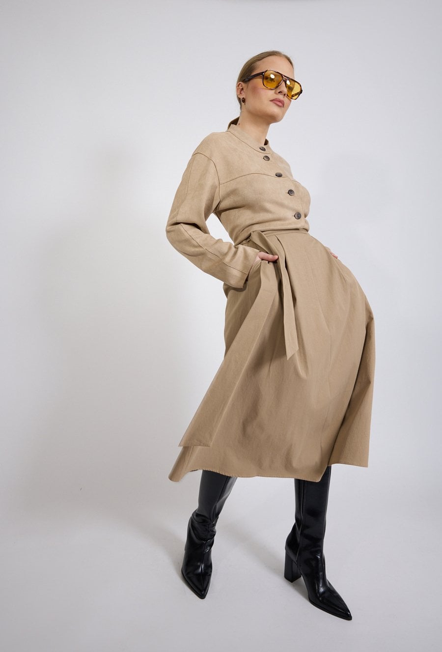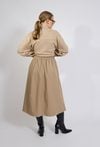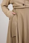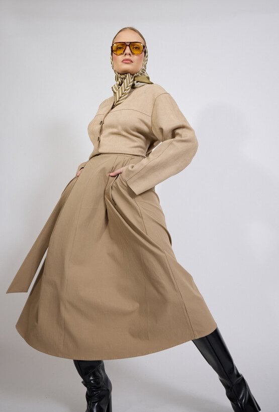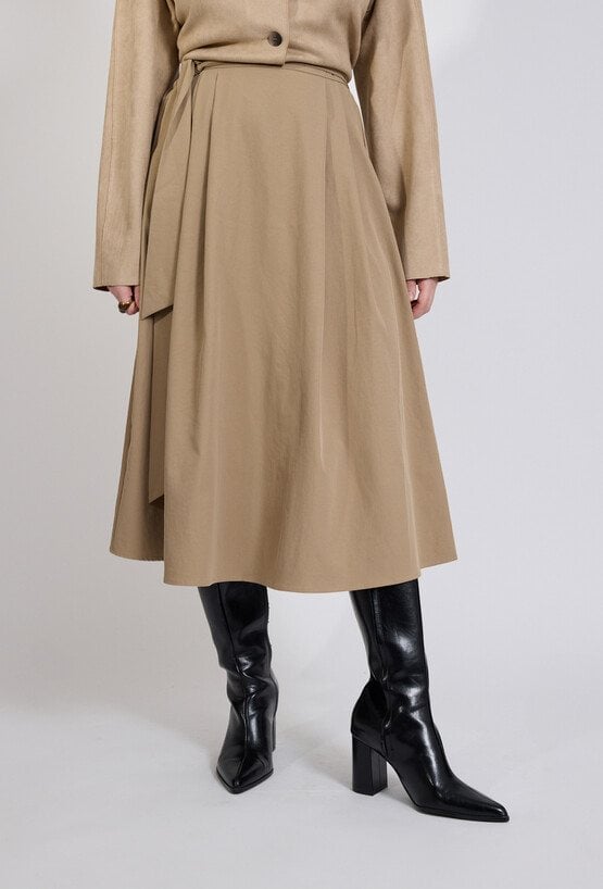 Spódnica damska o eleganckim, rozkloszowanym kroju. Model o długości midi z wysokim stanem, który pięknie podkreśla talię. W pasie znajduje się wiązanie umożliwiające dopasowanie spódnicy do sylwetki, a po bokach praktyczne kieszenie zwiększające komfort użytkowania. Zwiewny fason sprawia, że spódnica lekko układa się w ruchu i nadaje stylizacji kobiecego charakteru. Modelka na zdjęciu ma 177 cm wzrostu i prezentuje rozmiar 36.