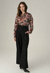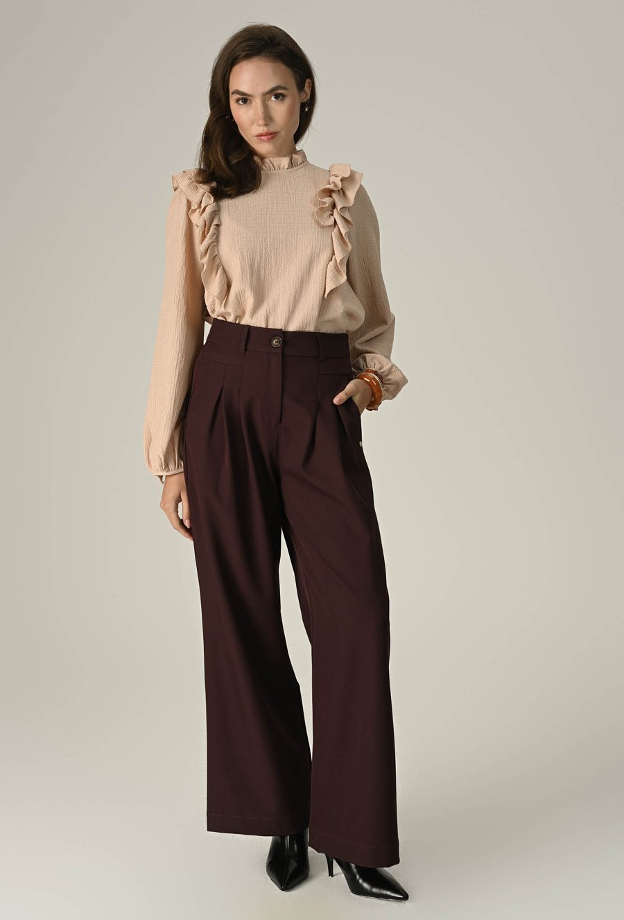 Spodnie o klasycznym fasonie, przyjemnego materiału, z szeroką nogawką i wysokim stanem, które doskonale podkreślają sylwetkę. Wyposażone w praktyczne kieszenie, są idealne do codziennych stylizacji, łącząc wygodę z elegancją. Modelka na zdjęciu ma 174 cm wzrostu i prezentuje rozmiar 36.