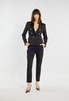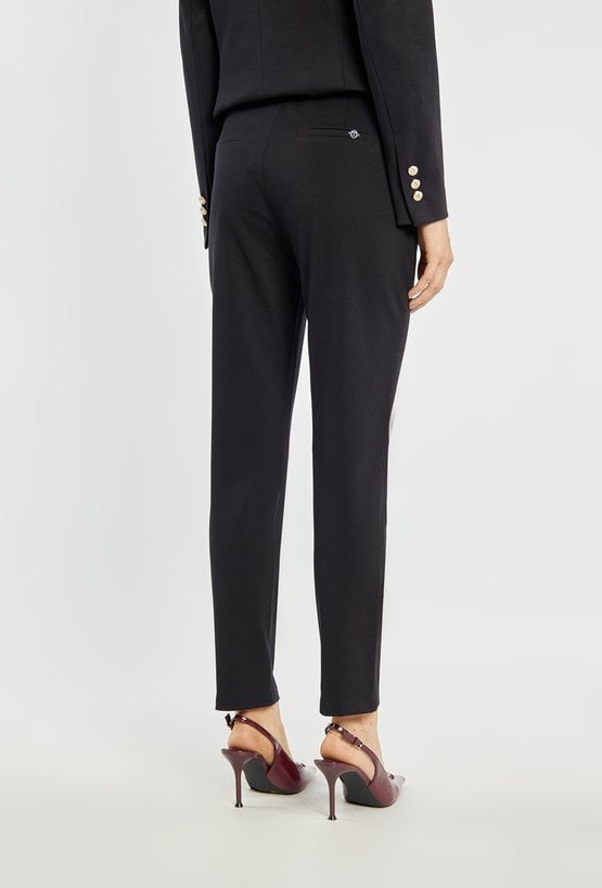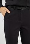 Czarne spodnie o klasycznym, eleganckim kroju z delikatnie zwężaną nogawką. Kieszenie po bokach oraz ozdobne przeszycia z przodu nadają im szykownego charakteru. Modelka na zdjęciu ma 177 cm wzrostu i prezentuje rozmiar 36.