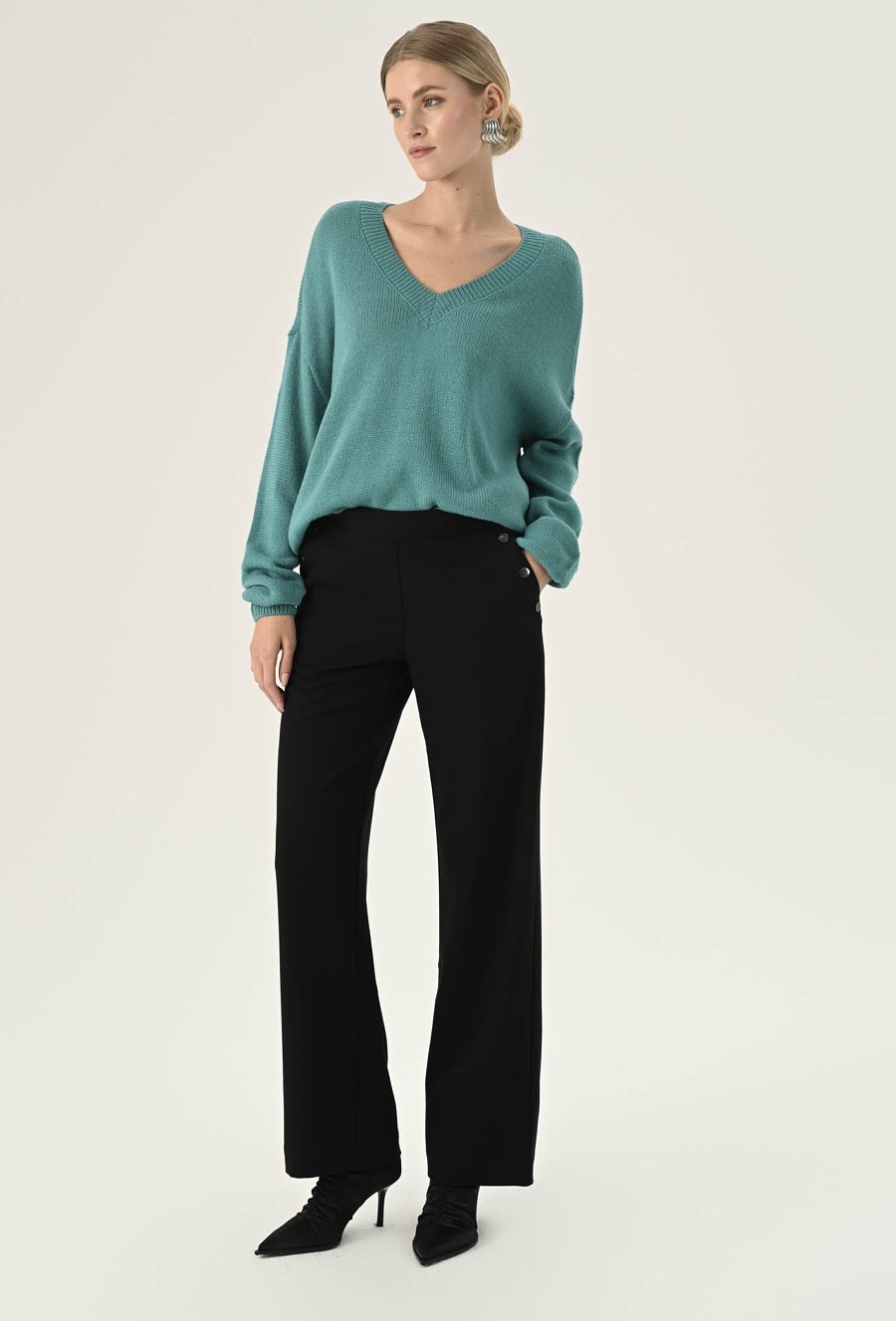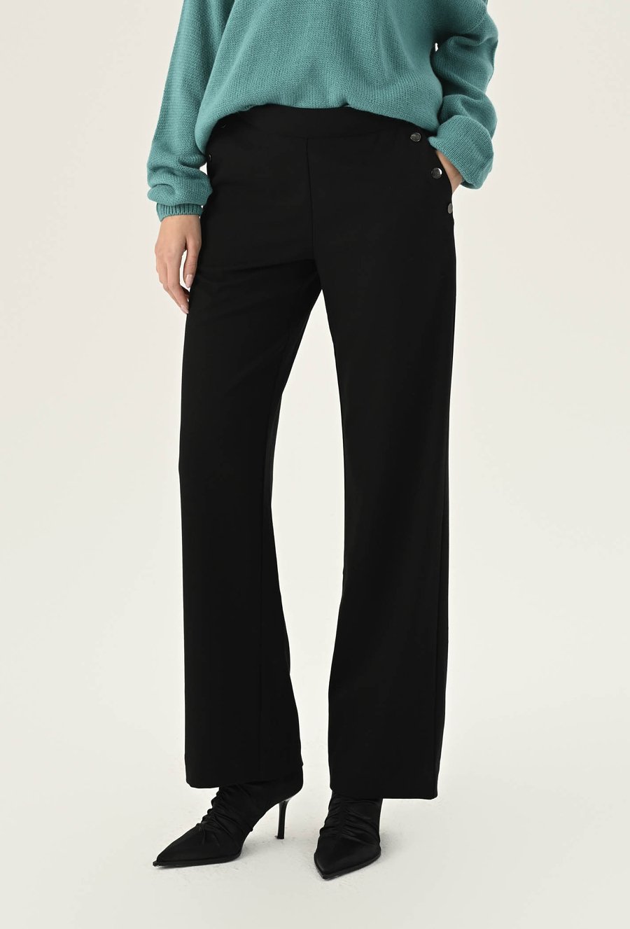 Eleganckie spodnie z wysokim stanem w klasycznym czarnym kolorze to kluczowy element każdej jesiennej garderoby, który łączy w sobie wygodę i styl. Stylu dodają i ozdobne guziki. Rozszerzane ku dołowi nogawki dodają lekkości i sprawiają, że spodnie są bardzo stylowe. Wysoki stan podkreśla talię, co wysmukla sylwetkę i czyni te spodnie idealnym wyborem do różnych stylizacji. Modelka na zdjęciu ma 179 cm wzrostu i prezentuje rozmiar 36.