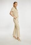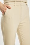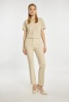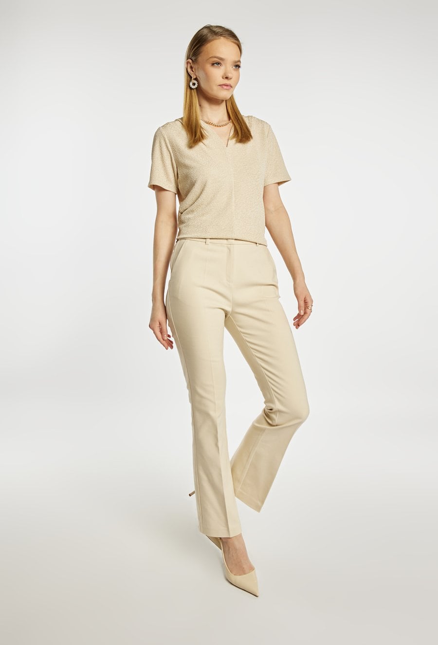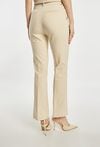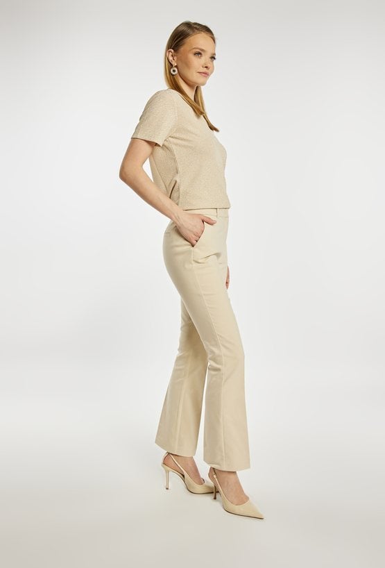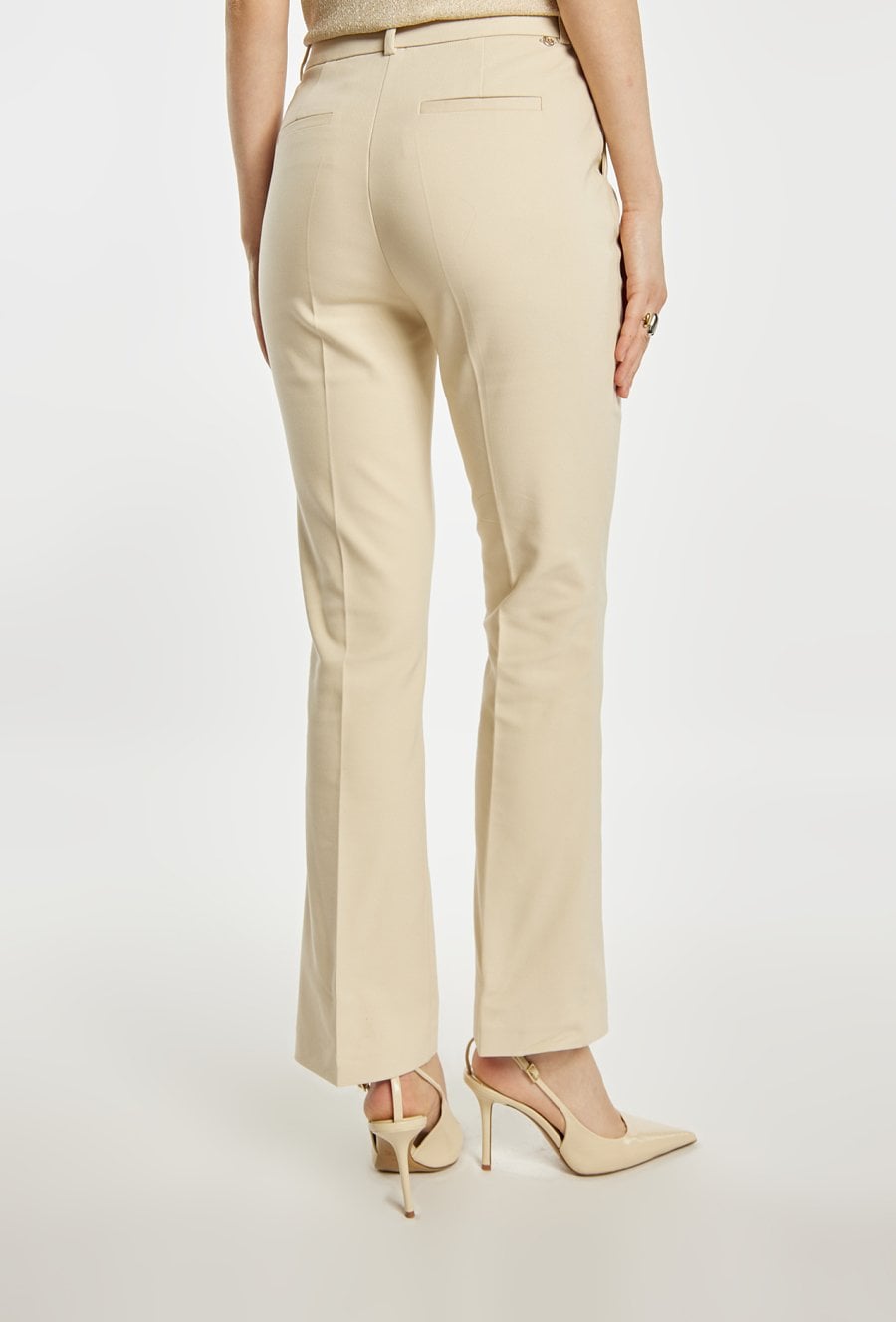 Eleganckie spodnie damskie o dopasowanym kroju z lekko rozszerzaną nogawką. Model z praktycznymi kieszeniami, który zapewnia wygodę i elegancki wygląd. Spodnie doskonale sprawdzą się w eleganckich i biznesowych stylizacjach, do pracy oraz na spotkania. Modelka na zdjęciu ma 177 cm wzrostu i prezentuje rozmiar 36.