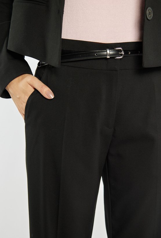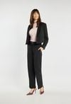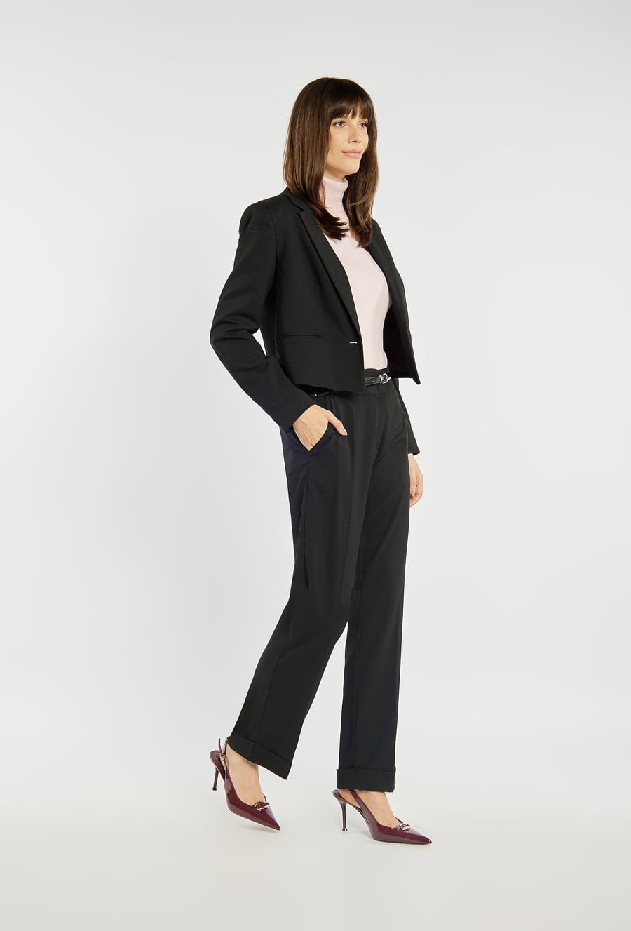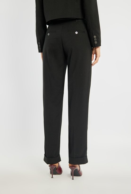 Czarne, eleganckie spodnie o prostym kroju z kantem. Nogawki zakończone mankietem dodają całości nowoczesnego charakteru. Idealne do biura, na spotkania czy wieczorne wyjścia — klasyka, która zawsze wygląda szykownie. Pasek widoczny na zdjęciu nie jest elementem spodni. Modelka na zdjęciu ma 177 cm wzrostu i prezentuje rozmiar 36.