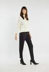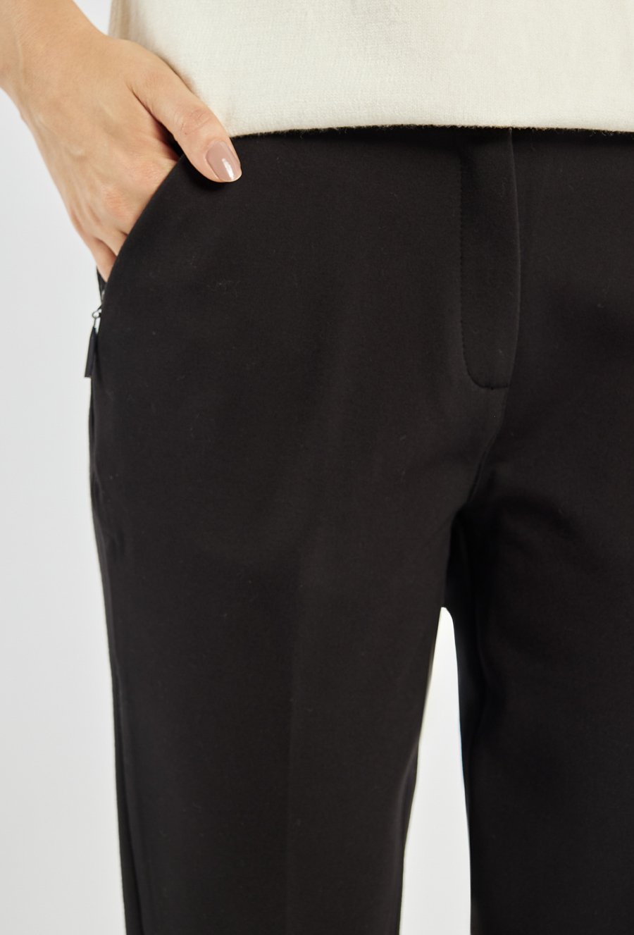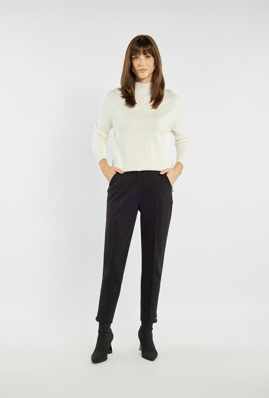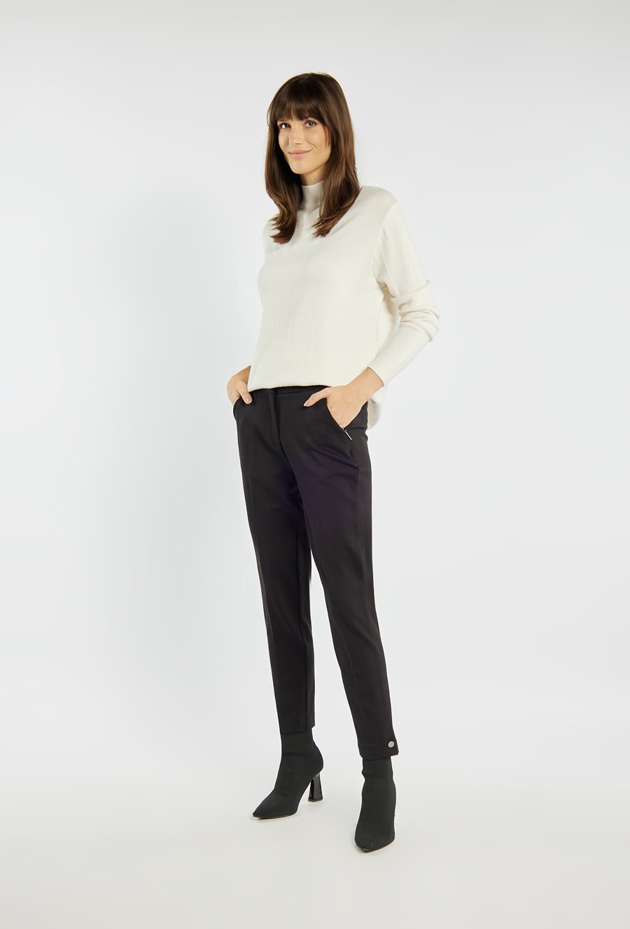 Eleganckie spodnie o zwężanej nogawce, z kantem, które pięknie podkreślają sylwetkę. Model z praktycznymi kieszeniami po bokach i ozdobnym guzikiem u dołu nogawki dodaje całości szykownego charakteru. Spodnie zapinane na suwak i dwa guziki. Idealne do stylizacji zarówno biurowych, jak i bardziej casualowych. Modelka na zdjęciu ma 177 cm wzrostu i prezentuje rozmiar 36.