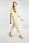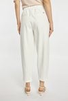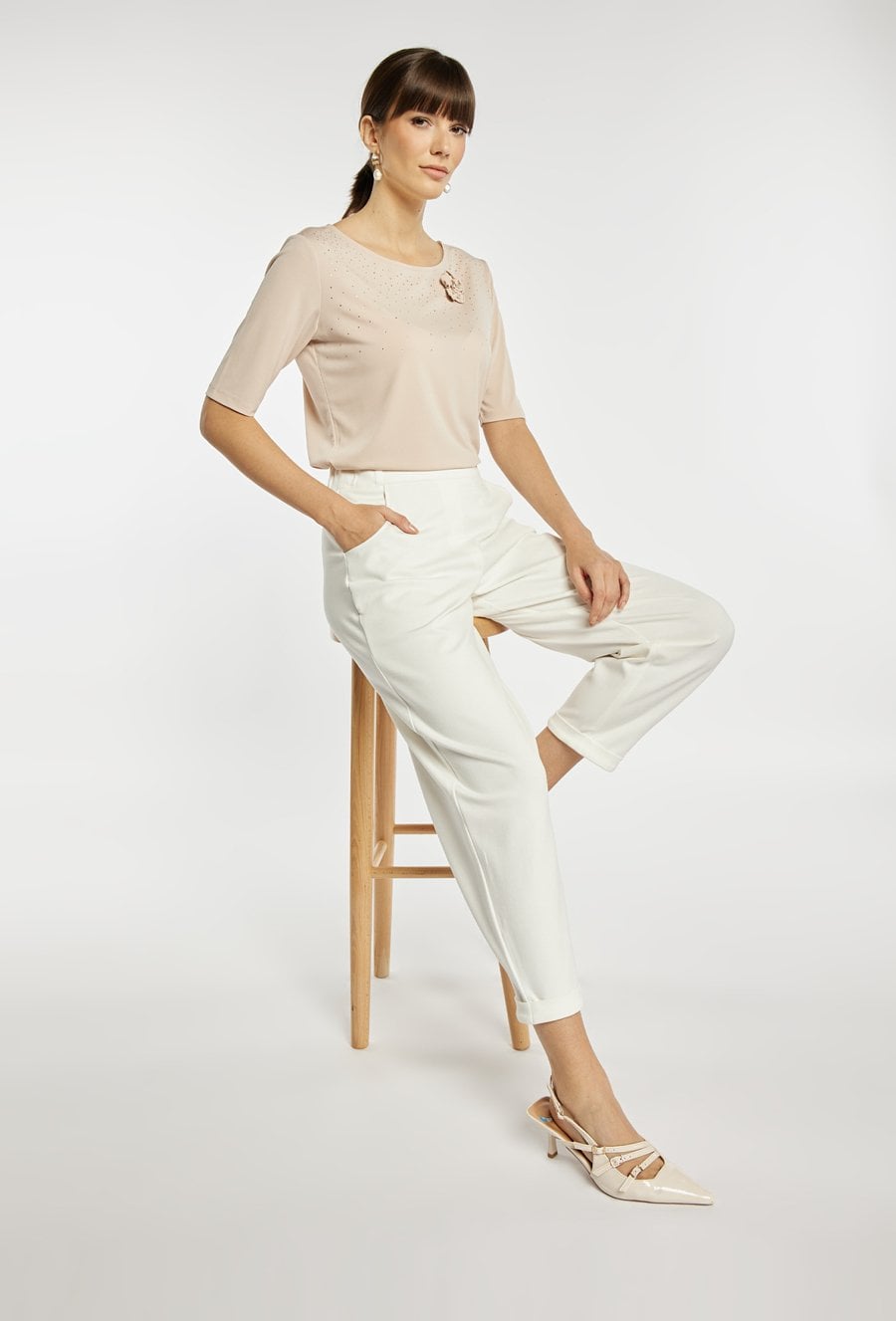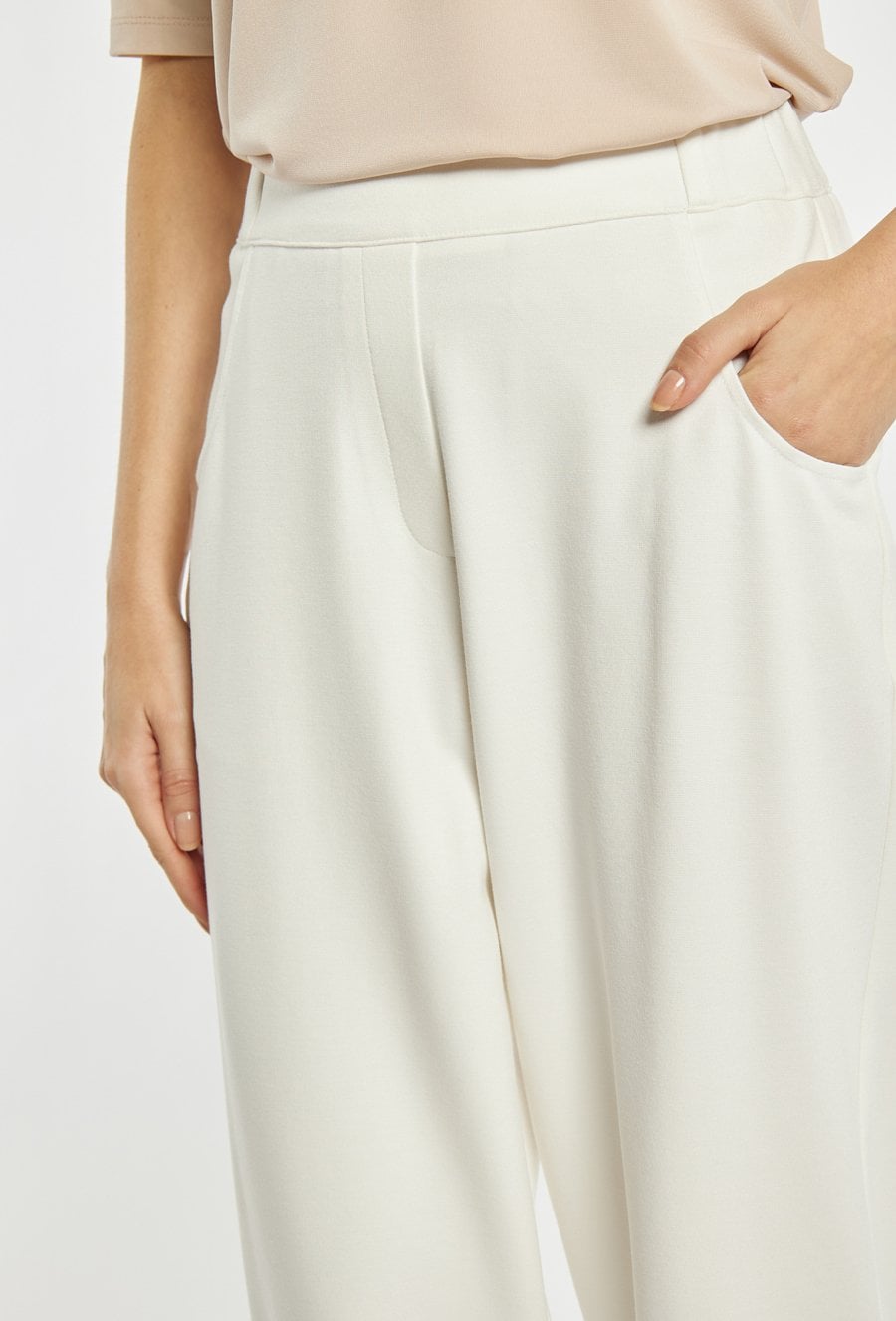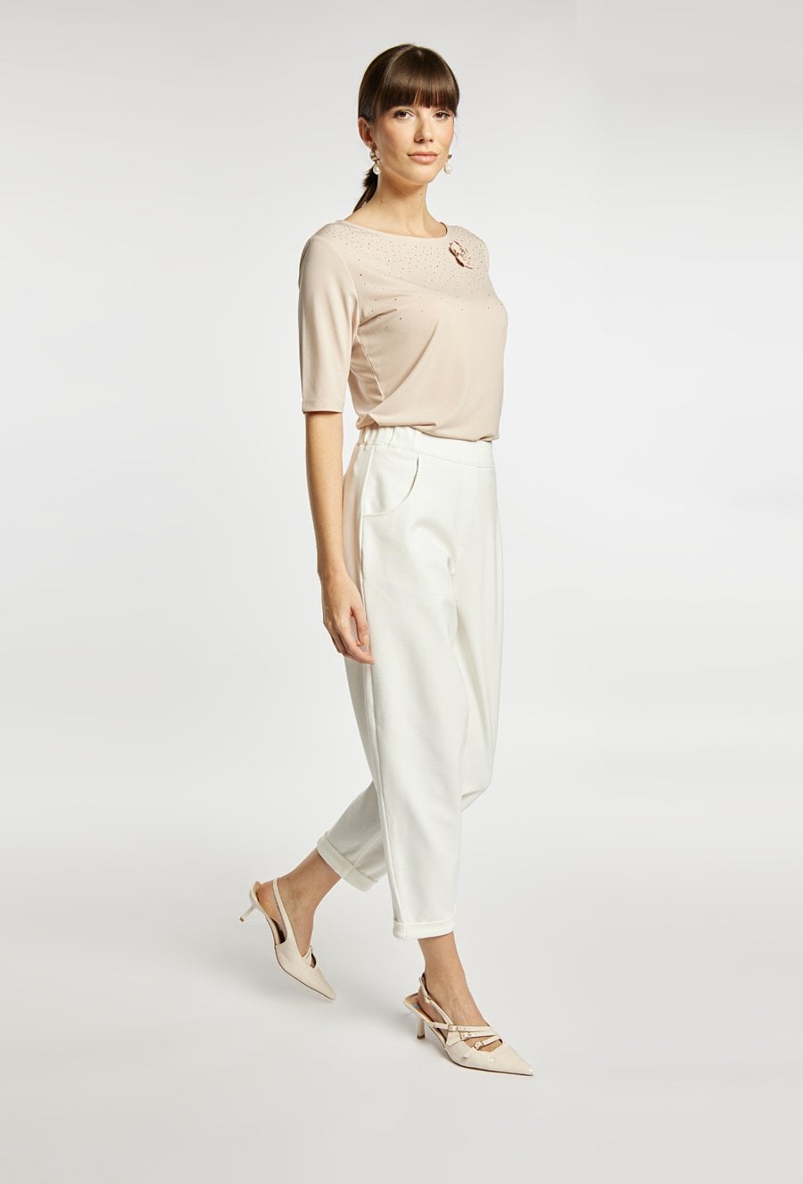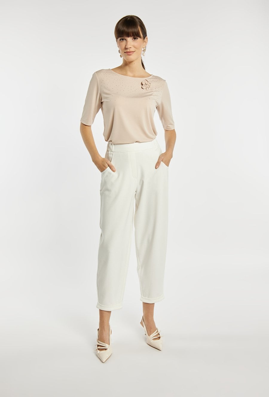 Eleganckie spodnie o nowoczesnym, luźniejszym kroju z nogawką o długości 7/8 oraz podwiniętym dołem. Spodnie mają wygodne kieszenie, gładki pas i dopracowane przeszycia, które nadają całości schludny, minimalistyczny wygląd. Modelka na zdjęciu ma 177 cm wzrostu i prezentuje rozmiar 36. Model polecamy zestawić z pasującą marynarką o kodzie: BZR0350.