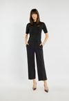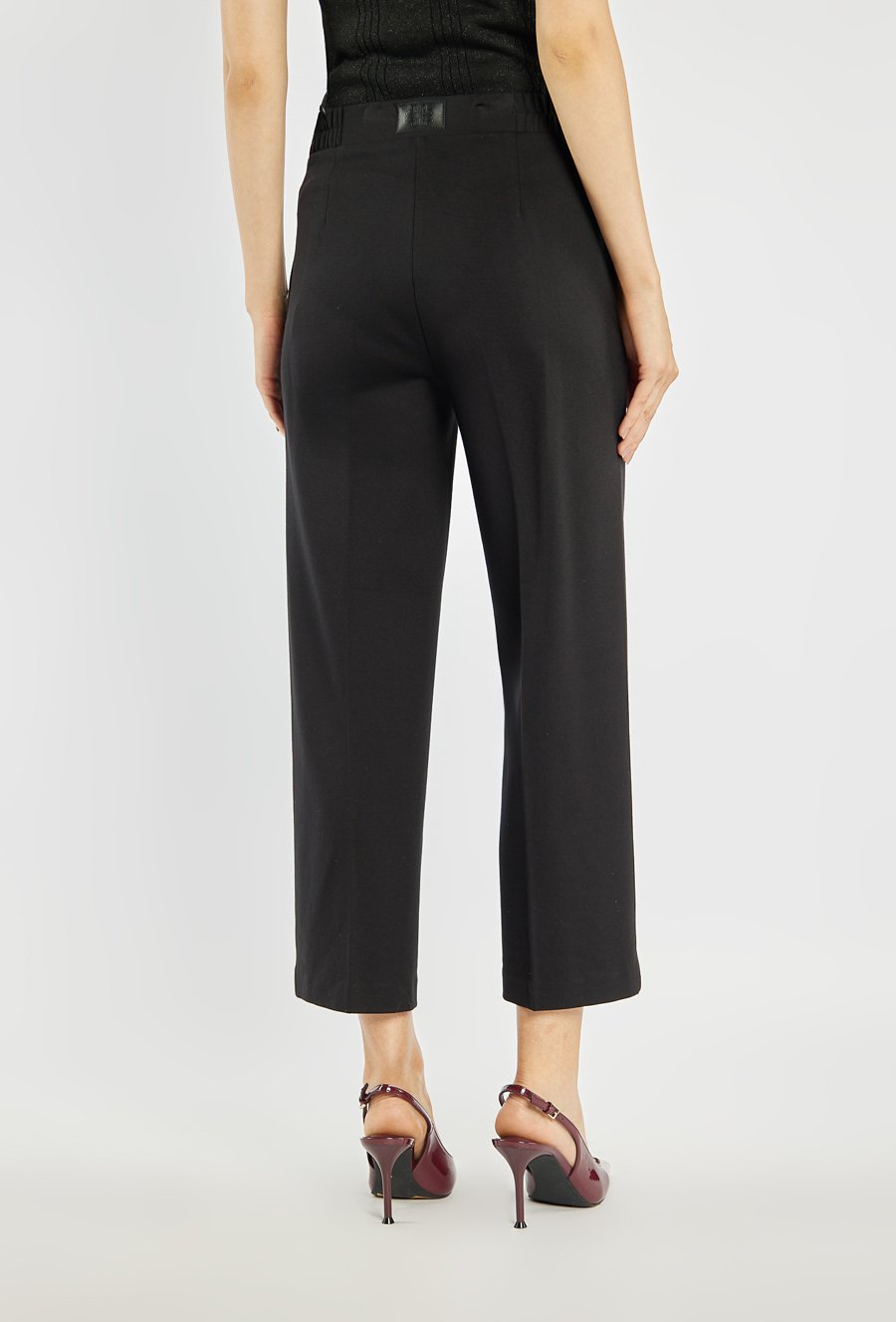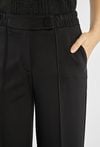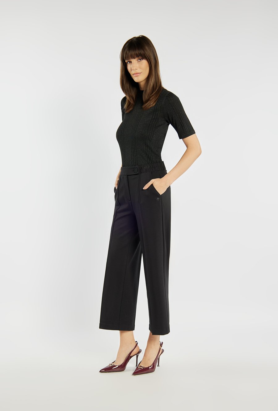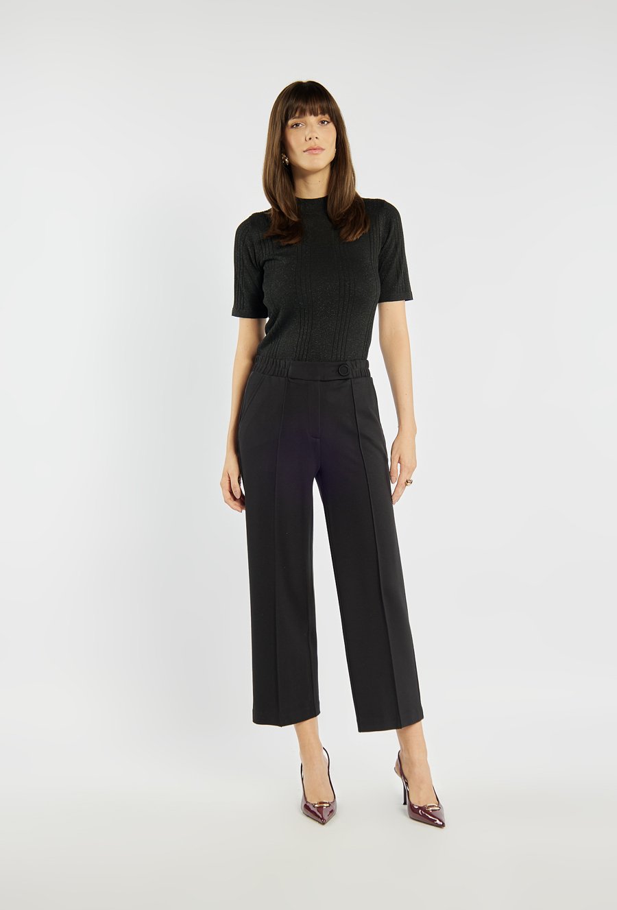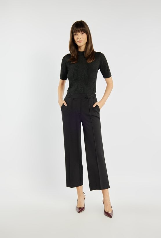 Eleganckie spodnie o prostym, lekko skróconym kroju, z dekoracyjnym przeszyciem z przodu. Wygodna talia z elastycznym panelem z boku daje komfort noszenia. Model sprawdzi się zarówno do pracy, jak i do bardziej formalnych stylizacji. Modelka na zdjęciu ma 177 cm wzrostu i prezentuje rozmiar 36.