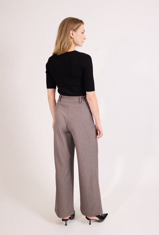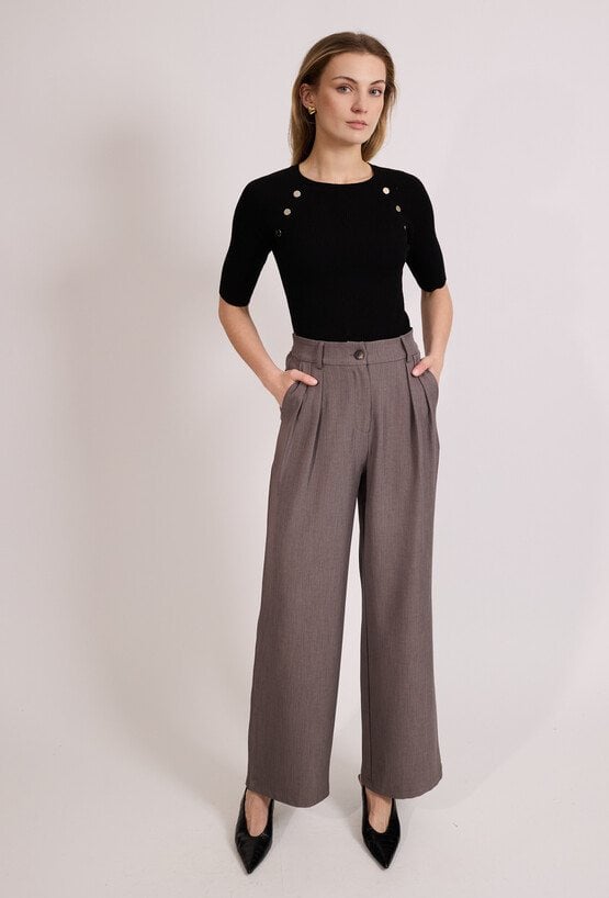 Eleganckie spodnie damskie o szerokiej nogawce i wysokim stanie. Model z zakładkami z przodu oraz paskiem, który podkreśla talię i nadaje stylizacji klasycznego charakteru. Spodnie doskonale sprawdzą się w eleganckich i biznesowych stylizacjach, do pracy oraz na spotkania. Modelka na zdjęciu ma 177 cm wzrostu i prezentuje rozmiar 36.