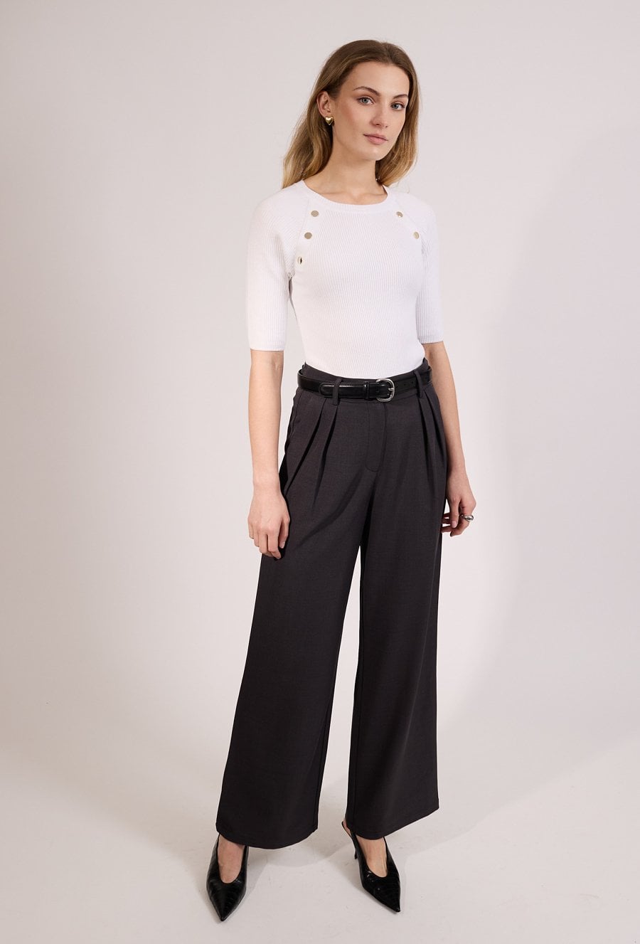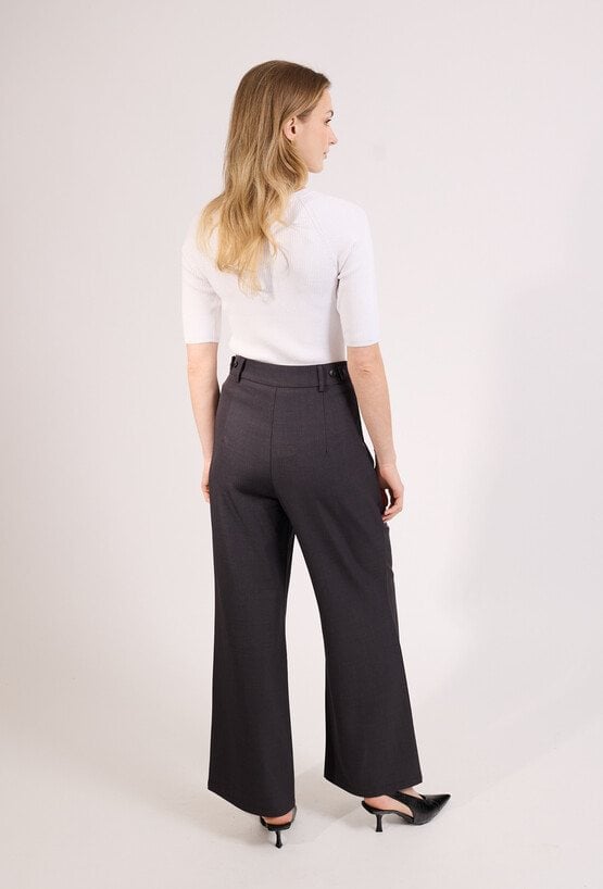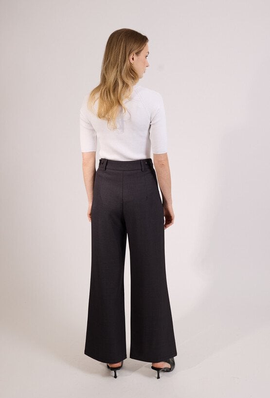 Eleganckie spodnie damskie o szerokiej nogawce i wysokim stanie. Model z zakładkami z przodu oraz paskiem, który podkreśla talię i nadaje stylizacji klasycznego charakteru. Spodnie doskonale sprawdzą się w eleganckich i biznesowych stylizacjach, do pracy oraz na spotkania. Modelka na zdjęciu ma 177 cm wzrostu i prezentuje rozmiar 36.