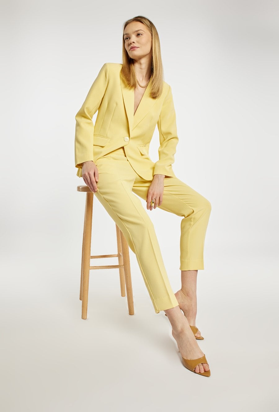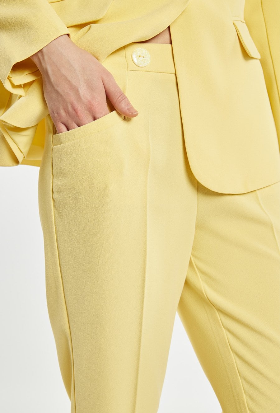 Spodnie o prostym kroju z delikatnym przeszyciem z przodu, które optycznie wydłuża nogi. Spodnie z prostą nogawką i wygodnymi kieszeniami sprawdzą się zarówno w codziennych, jak i bardziej eleganckich stylizacjach. Polecamy zestawić z pasującą marynarką o kodzie: 26W-BZR0170. Modelka na zdjęciu ma 177 cm wzrostu i prezentuje rozmiar 36.