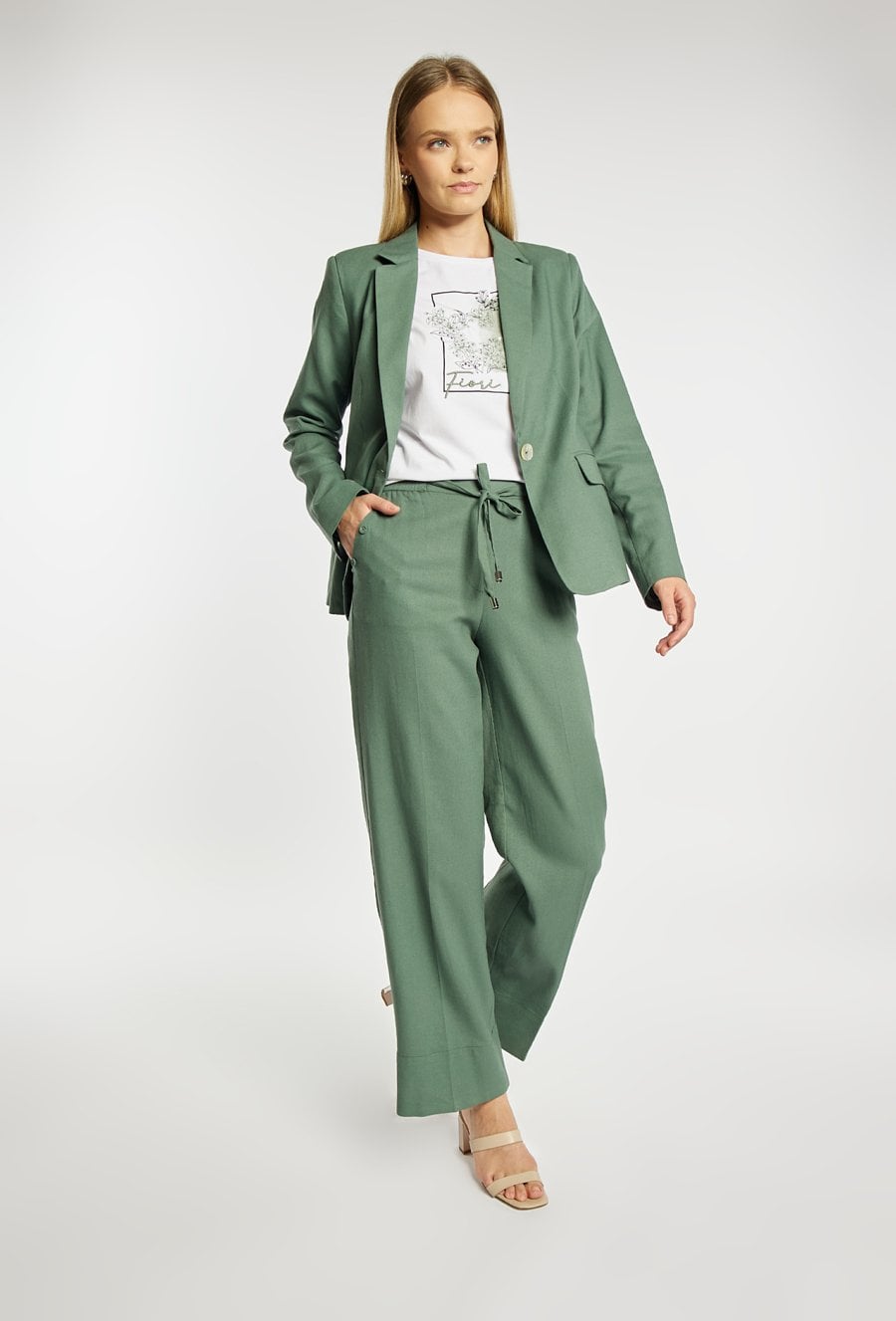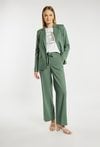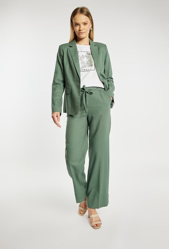 Spodnie damskie o eleganckim, prostym kroju z szeroką nogawką. Model z wysokim stanem oraz wiązaniem w talii, które podkreśla sylwetkę i zapewnia dobre dopasowanie. Spodnie doskonale sprawdzą się zarówno w codziennych, jak i bardziej eleganckich stylizacjach. Polecamy je zestawić z pasującą marynarką, tworząc spójny i stylowy komplet. Kod do marynarki: 25L-BZR0521. Modelka na zdjęciu ma 177 cm wzrostu i prezentuje rozmiar 36.