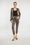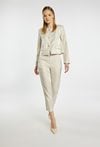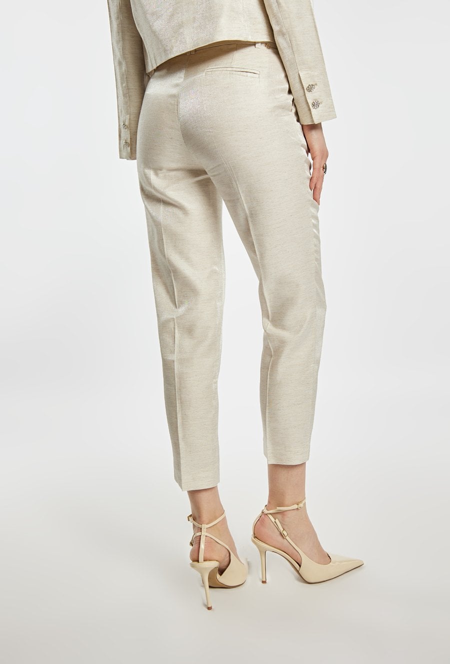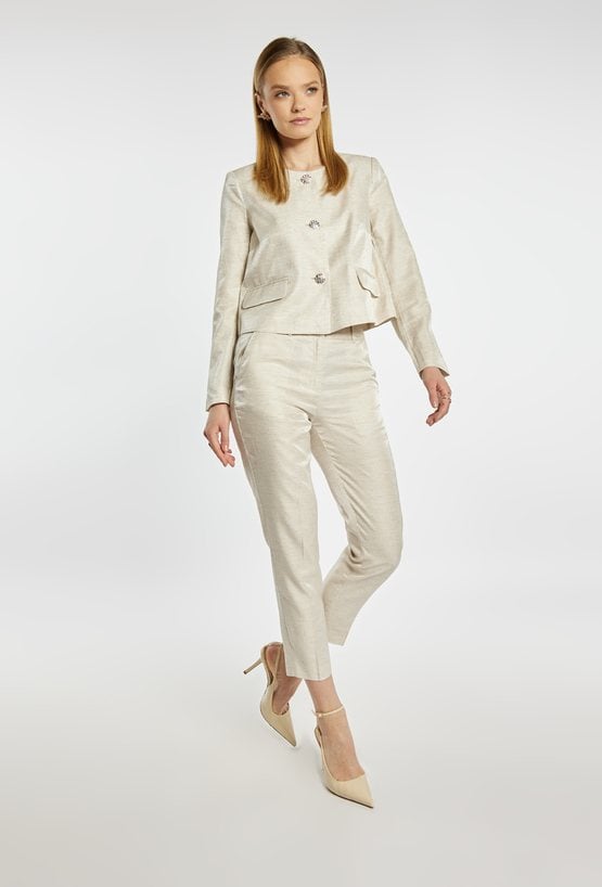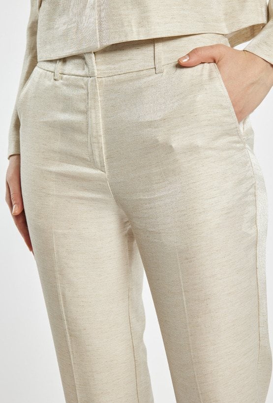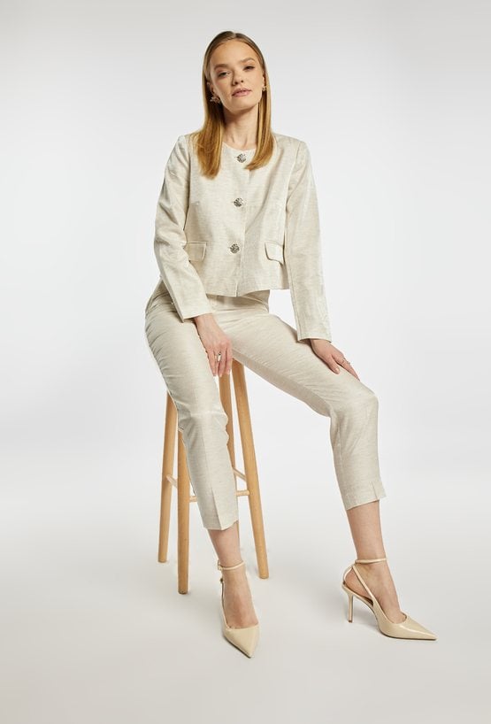 Eleganckie spodnie damskie o dopasowanym kroju z nogawką o długości 7/8. Model wykonany z materiału o efektownym wykończeniu, który nadaje stylizacji nowoczesnego charakteru. Spodnie można zestawić z pasującym żakietem, tworząc stylowy i elegancki komplet. Kod do żakietu: 26L-BZR0310. Modelka na zdjęciu ma 177 cm wzrostu i prezentuje rozmiar 36.