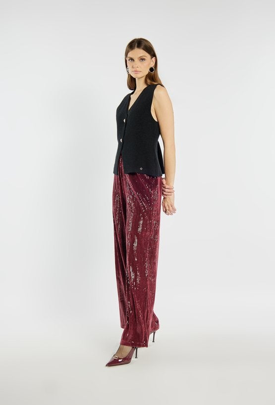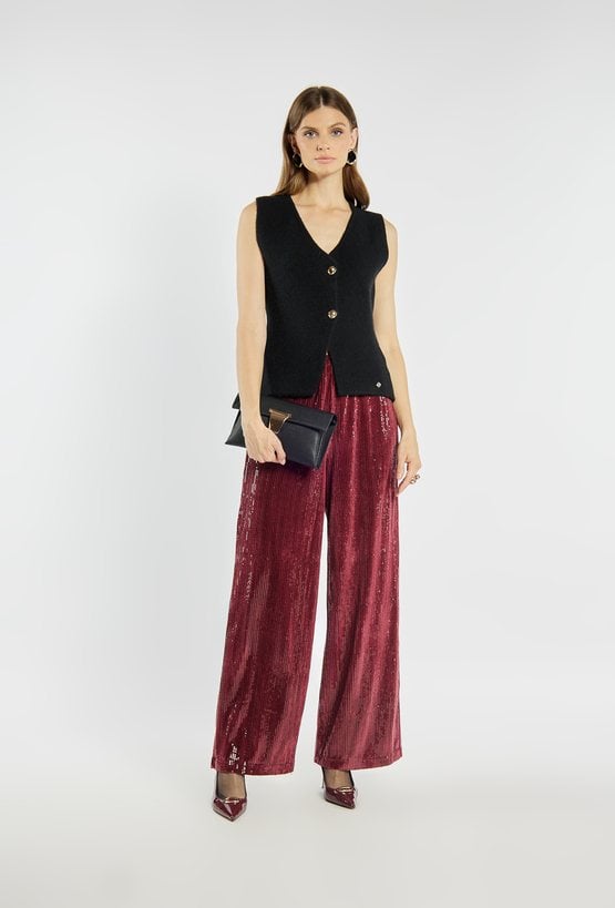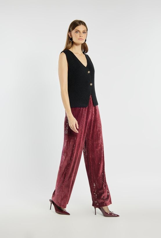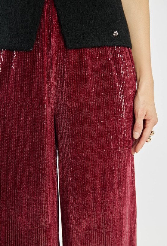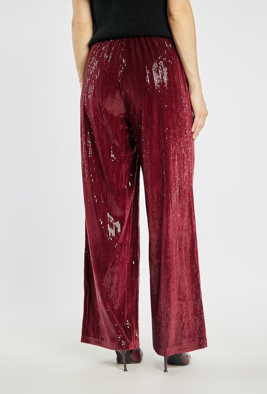 Eleganckie spodnie damskie o szerokim kroju. Spodnie ozdobione cekinami, które subtelnie połyskują przy każdym ruchu. Elastyczna talia zapewnia wygodę noszenia, a efektowna faktura materiału nadaje stylizacji wyjątkowego charakteru. Idealne na święta, sylwestra lub inne uroczyste okazje. Modelka na zdjęciu ma 177 cm wzrostu i prezentuje rozmiar 36.