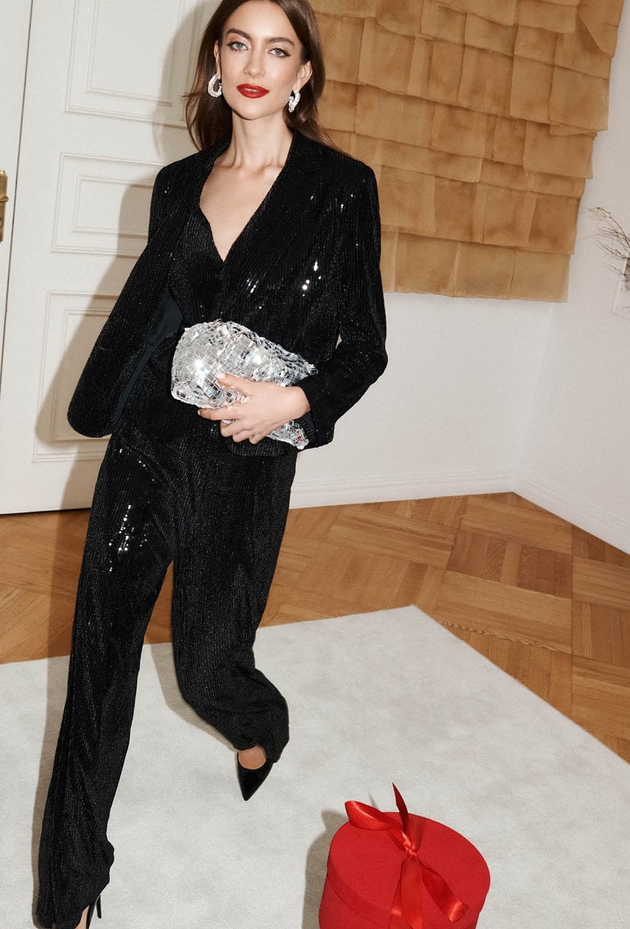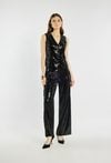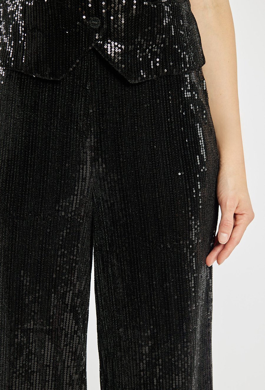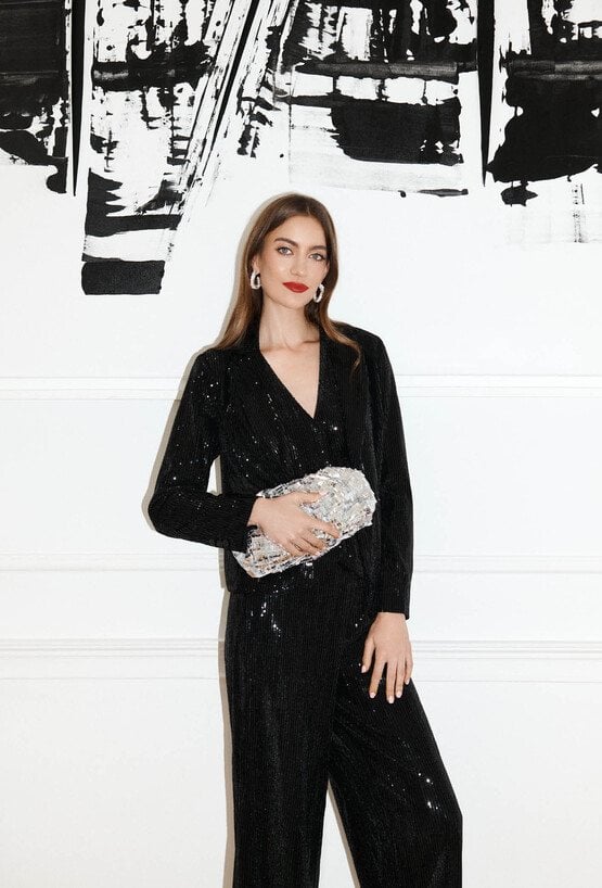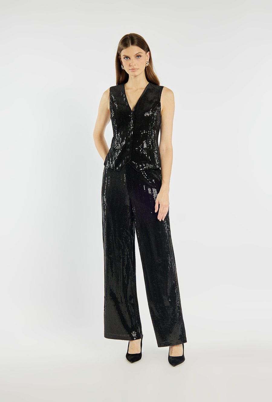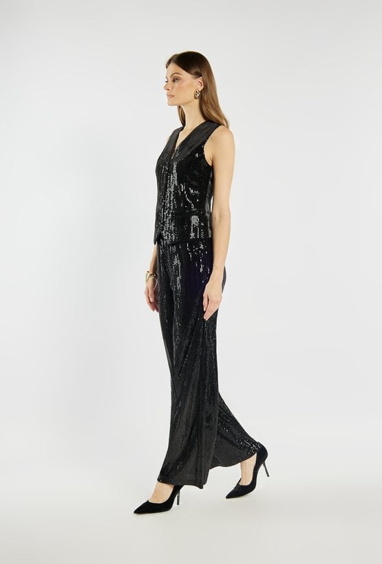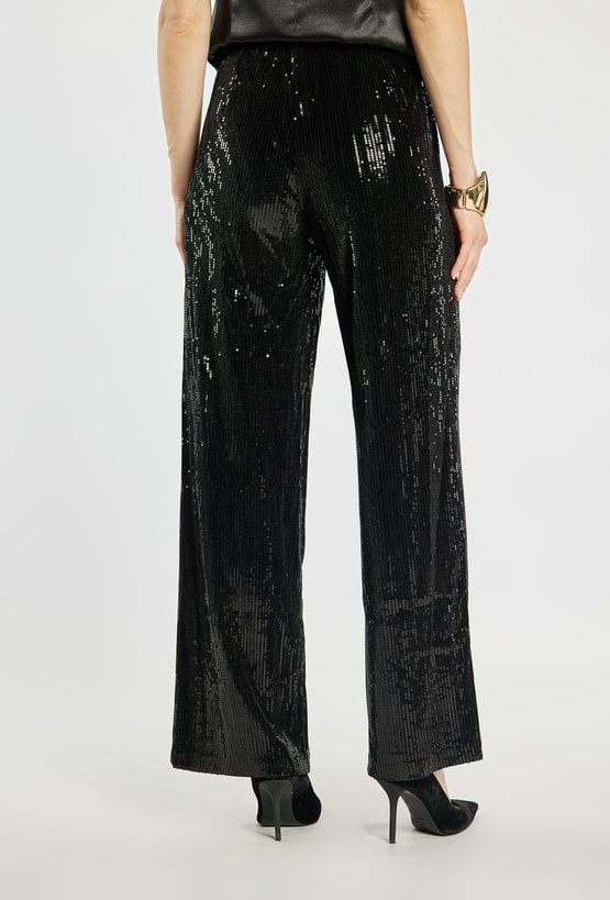 Eleganckie spodnie damskie o szerokim kroju. Spodnie ozdobione cekinami, które subtelnie połyskują przy każdym ruchu. Elastyczna talia zapewnia wygodę noszenia, a efektowna faktura materiału nadaje stylizacji wyjątkowego charakteru. Idealne na święta, sylwestra lub inne uroczyste okazje. Modelka na zdjęciu ma 177 cm wzrostu i prezentuje rozmiar 36.