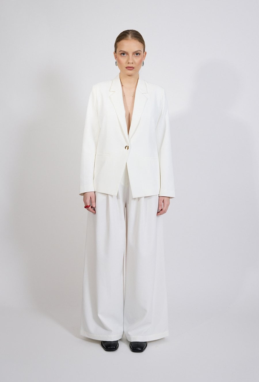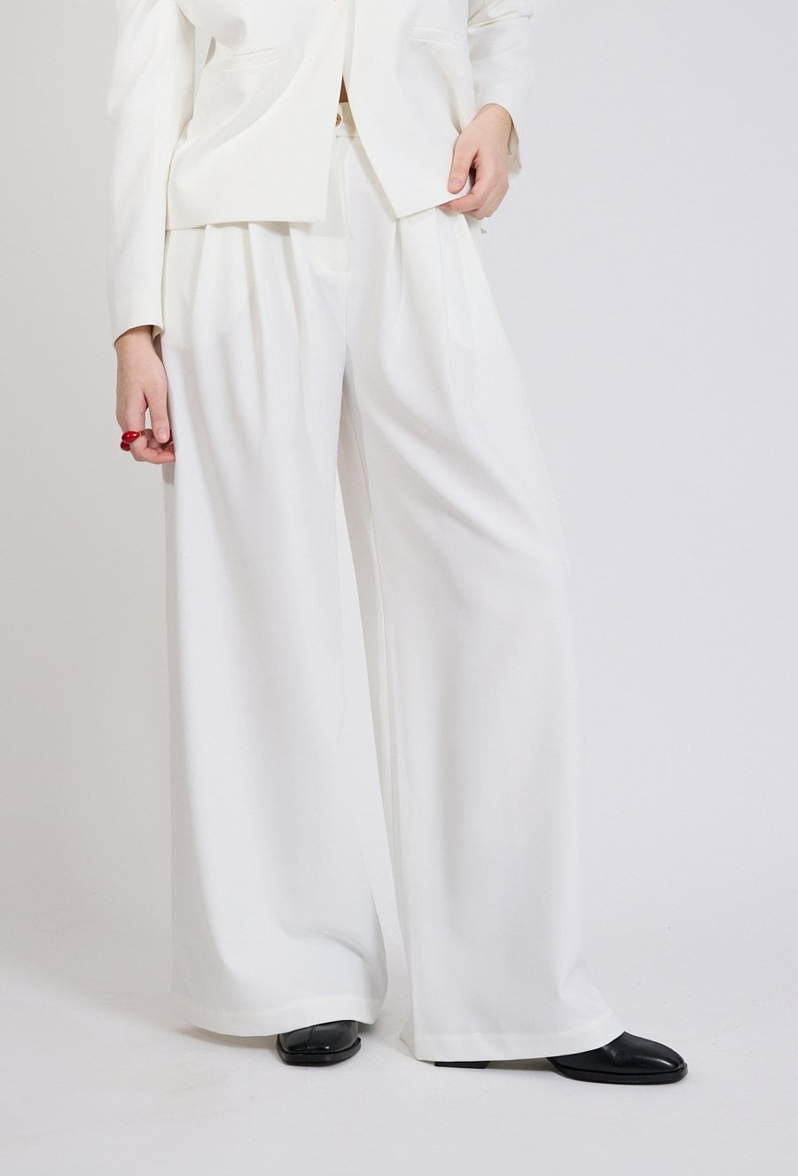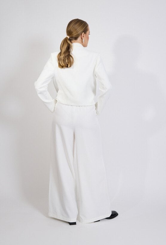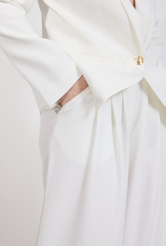 Spodnie damskie o eleganckim, klasycznym kroju. Model z wysokim stanem oraz szerokimi, prostymi nogawkami, które optycznie wydłużają sylwetkę i nadają stylizacji nowoczesnego charakteru. Minimalistyczny fason sprawia, że spodnie doskonale układają się na sylwetce i zapewniają komfort noszenia. Modelka na zdjęciu ma 177 cm wzrostu i prezentuje rozmiar 36.