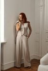 Spodnie damskie o eleganckim kroju z szerokimi, luźnymi nogawkami. Model z wysokim stanem, który ładnie podkreśla talię i swobodnie układa się na sylwetce. Spodnie zapewniają komfort noszenia i nadają stylizacji lekkości. Polecamy zestawić je z pasującą kamizelką oraz marynarką, tworząc elegancki komplet. Kod do marynarki: 26W-BZR0060, kod do kamizelki: 26W-BZR0120. Modelka na zdjęciu ma 177 cm wzrostu i prezentuje rozmiar 36.