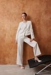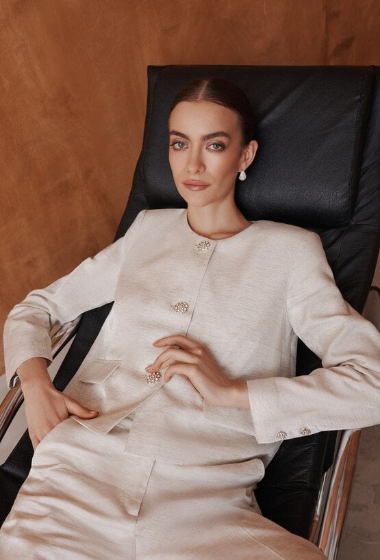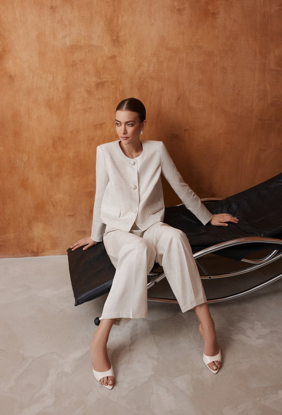 Spodnie damskie o eleganckim, szerokim kroju. Model z prostą nogawką oraz wygodnym zapięciem w pasie, który zapewnia estetyczne dopasowanie do sylwetki. Damskie spodnie doskonale sprawdzą się w stylizacjach wizytowych oraz bardziej wyrazistych zestawach. Model można zestawić z pasującą marynarką i kamizelką z tej samej linii, tworząc elegancki i spójny komplet. Kod do marynarki: 26L-BZR0280, kod do kamizelki" 26L-BZR0330. Modelka na zdjęciu ma 177 cm wzrostu i prezentuje rozmiar 36.
