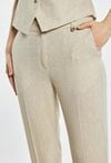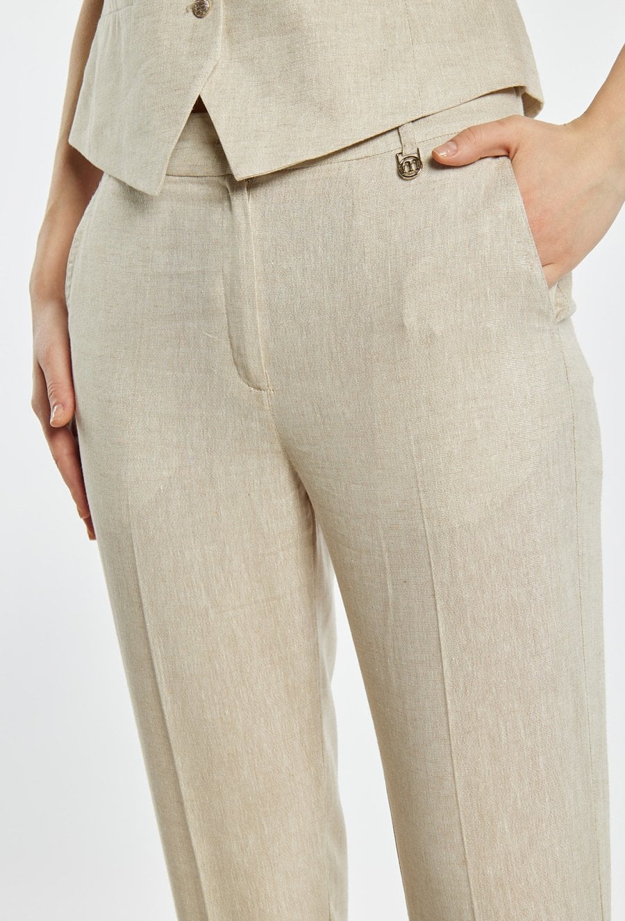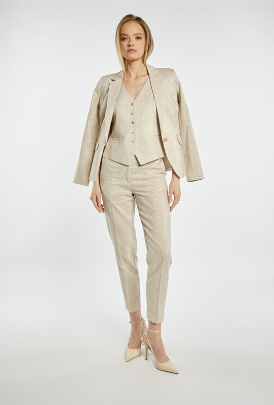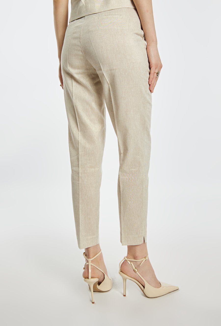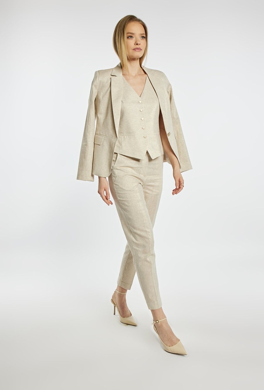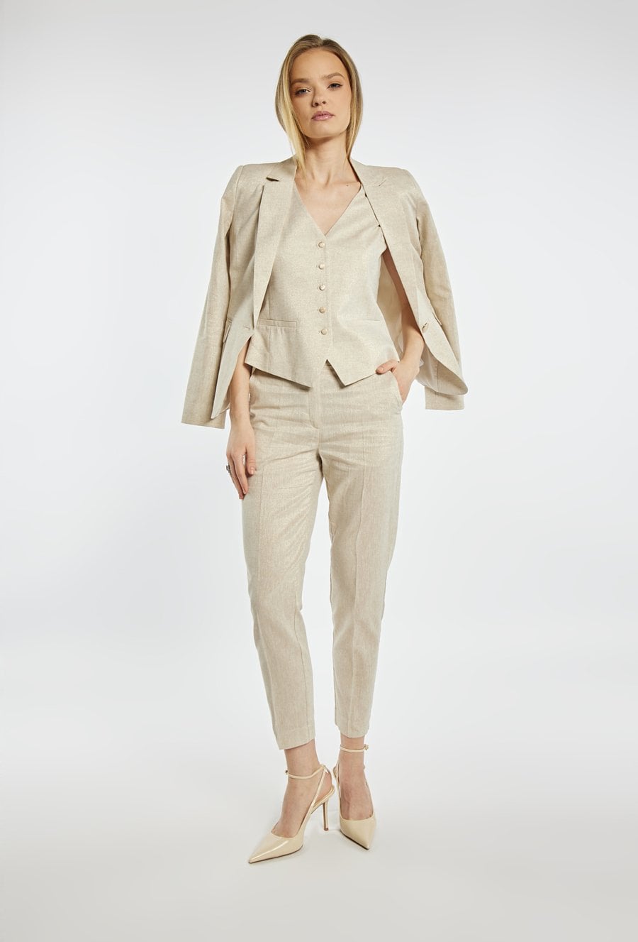 Eleganckie spodnie damskie o dopasowanym kroju z nogawką o długości 7/8. Model z praktycznymi kieszeniami, który zapewnia wygodę i stylowy wygląd. Spodnie można zestawić z pasującą marynarką, tworząc stylowy i elegancki komplet. Kod do marynarki: 26L-BZR0260. Modelka na zdjęciu ma 177 cm wzrostu i prezentuje rozmiar 36.