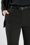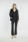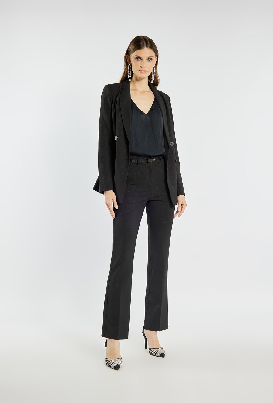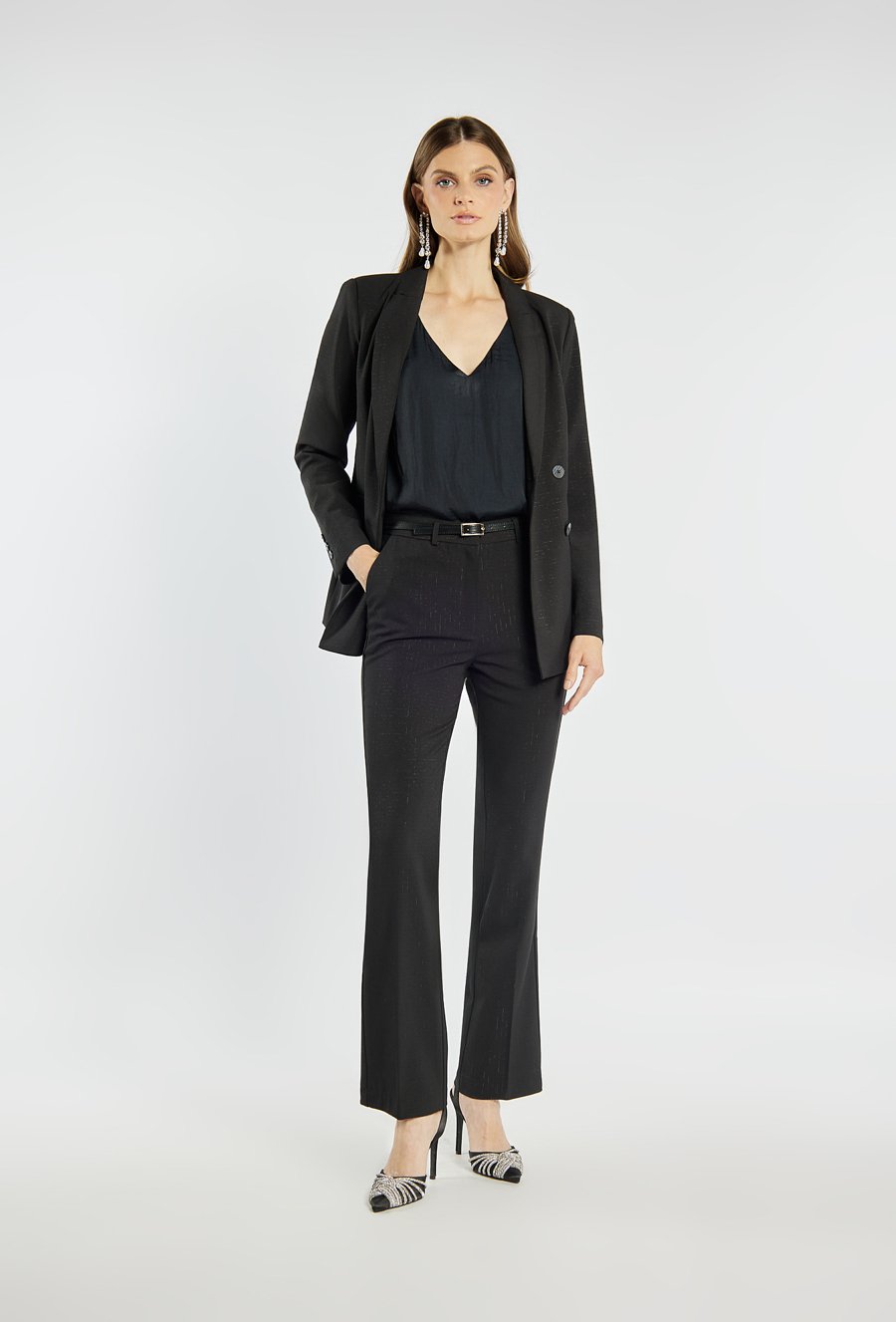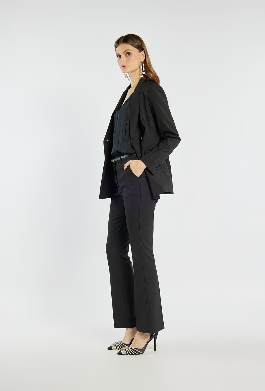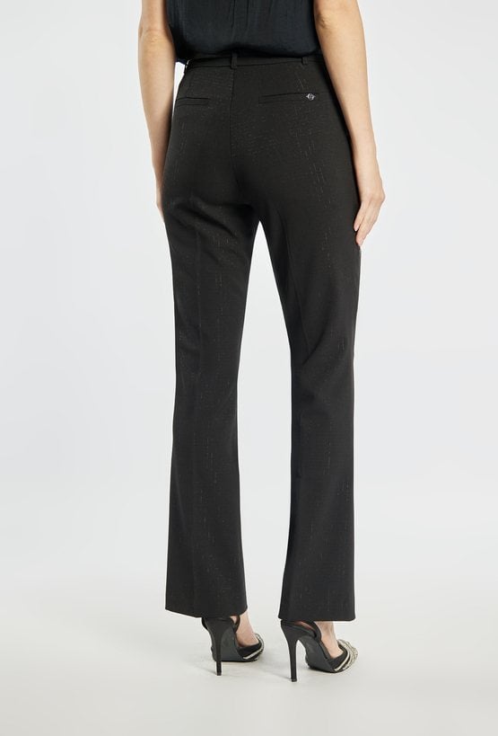 Eleganckie spodnie damskie o klasycznym kroju z delikatnym połyskiem, który dodaje im wyjątkowego charakteru. Spodnie z lekko rozszerzaną nogawką i zapięciem na suwak, haftki oraz guzik. Doskonale sprawdzą się w stylizacjach biurowych, wieczorowych lub świątecznych, tworząc szykowny i ponadczasowy look. Modelka na zdjęciu ma 177 cm wzrostu i prezentuje rozmiar 36.