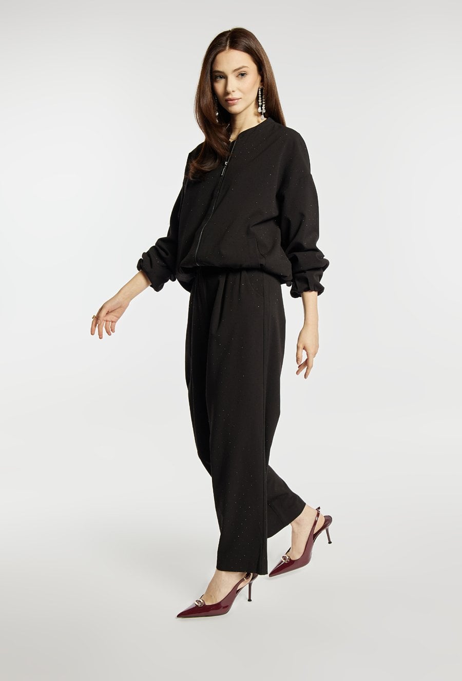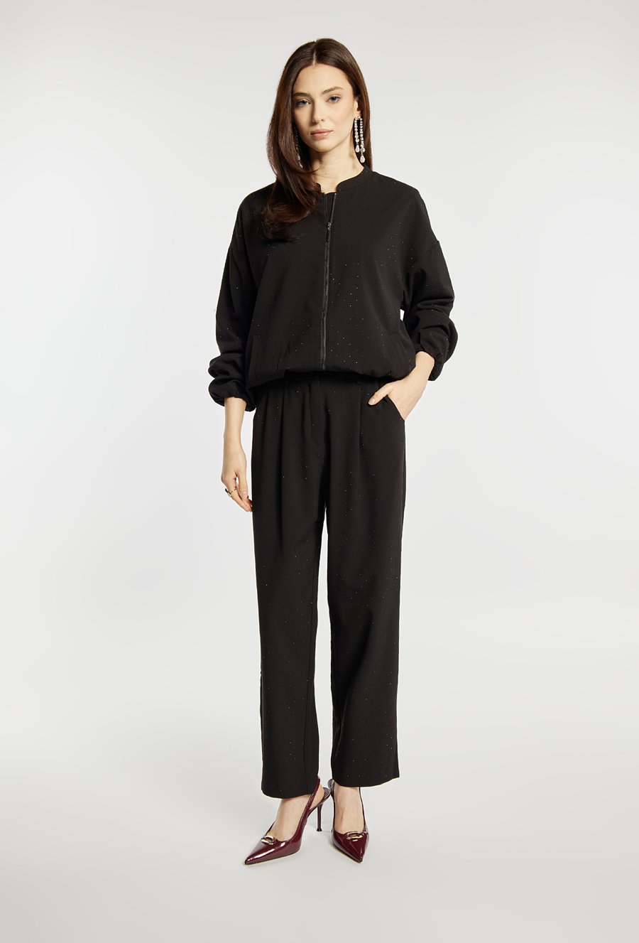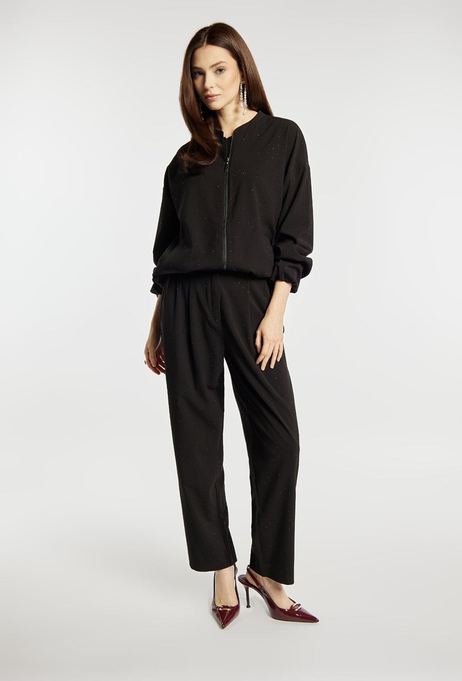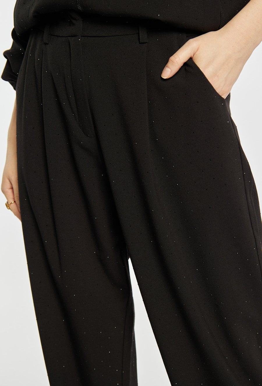 Eleganckie spodnie damskie w kolorze czarnym, wykonane w klasycznym stylu. Model z długimi, prostymi nogawkami, zapinany na guzik, haftkę i suwak, a w pasie wyposażony w szlufki. Atutem spodni są delikatne, połyskujące drobinki, które dodają im subtelnej elegancji. Polecamy zestawić je z pasującą marynarką z tej samej kolekcji. Kod do marynarki: 25Z-BZR0990. Modelka na zdjęciu ma 177 cm wzrostu i prezentuje rozmiar 36.
