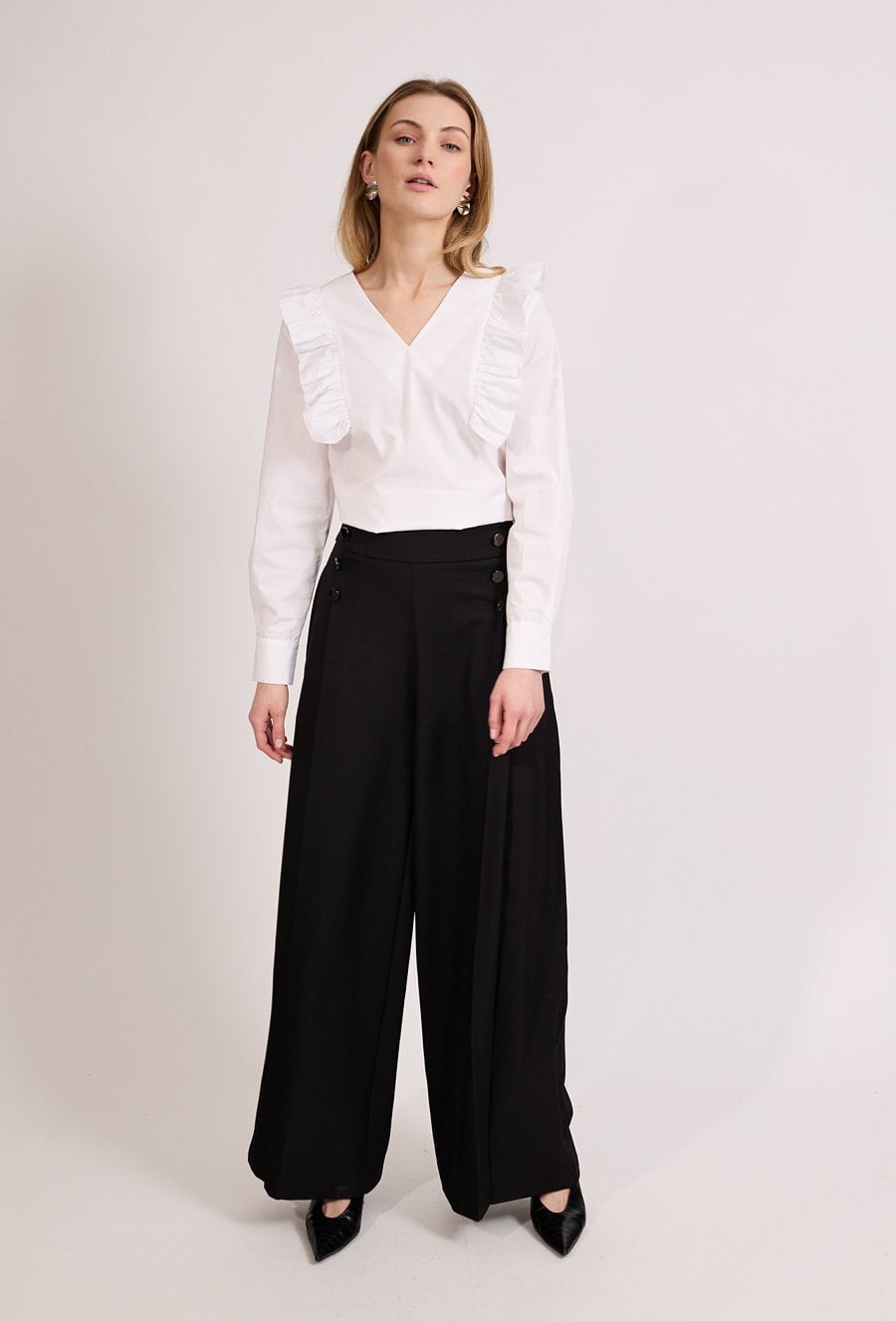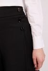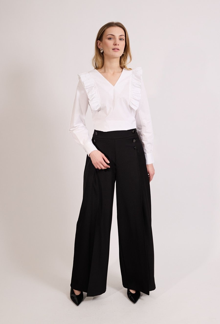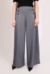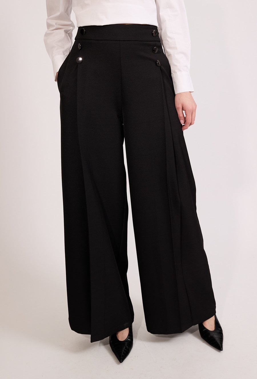 Eleganckie spodnie damskie o szerokiej nogawce i wysokim stanie. Model z ozdobnymi guzikami przy pasie, które nadają całości stylowego charakteru. Spodnie zapewniają wygodę i pięknie układają się na sylwetce, doskonale sprawdzając się w eleganckich i biznesowych stylizacjach. Modelka na zdjęciu ma 177 cm wzrostu i prezentuje rozmiar 36.