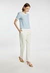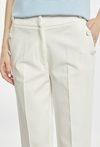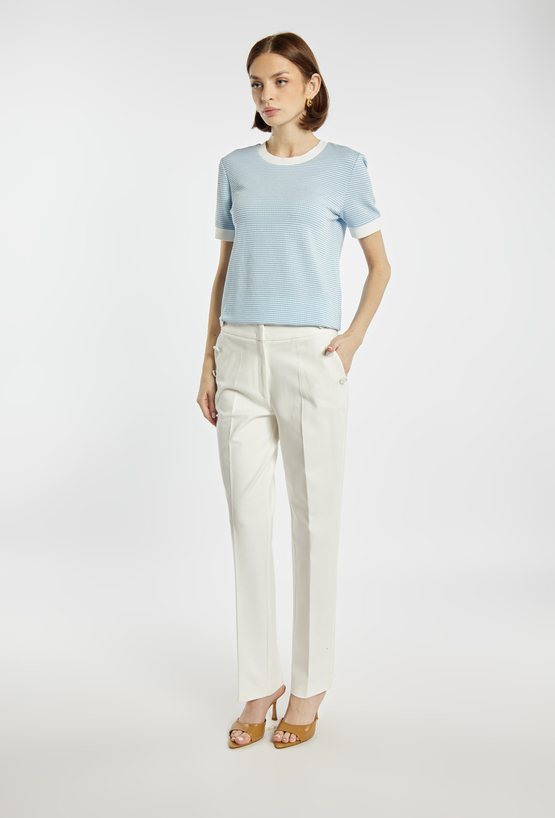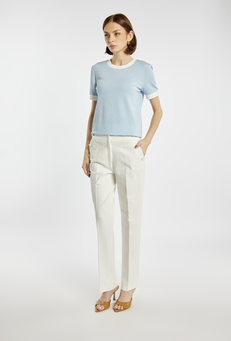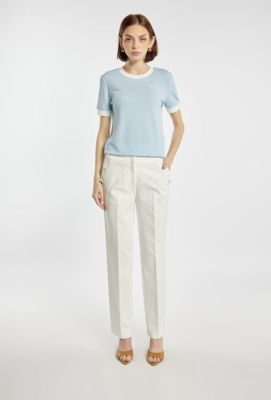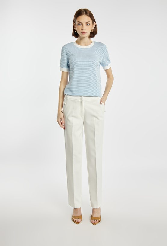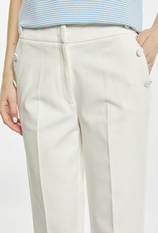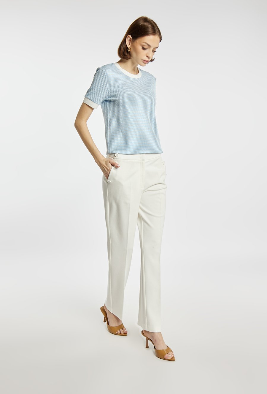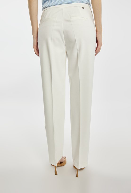 Eleganckie spodnie o klasycznym kroju z długą nogawką. Spodnie zapinane na guzik, haftki i suwak, co zapewnia wygodne i stabilne dopasowanie. Idealne do zestawienia z pasującym żakietem, tworząc stylowy komplet na uroczystości. Kod do żakietu: 26W-BZR0220. Modelka na zdjęciu ma 177 cm wzrostu i prezentuje rozmiar 36.