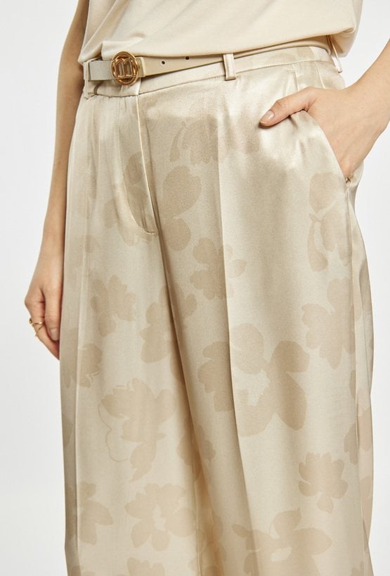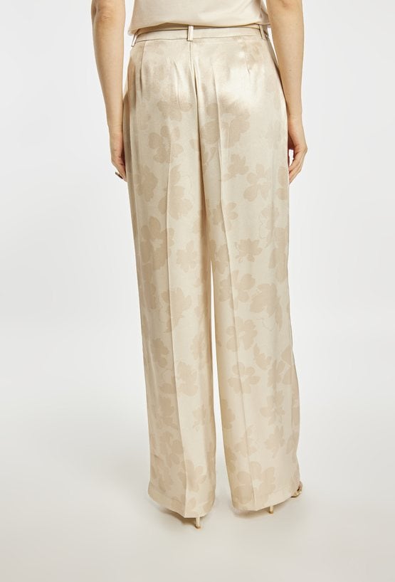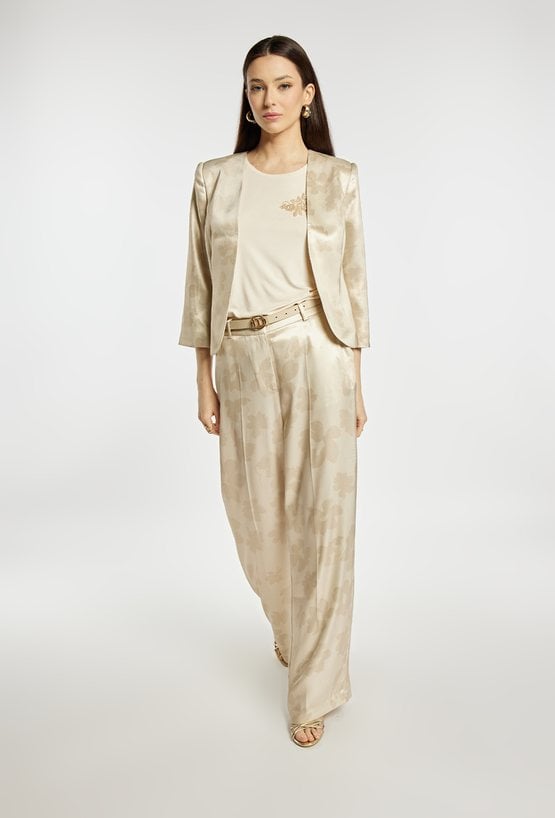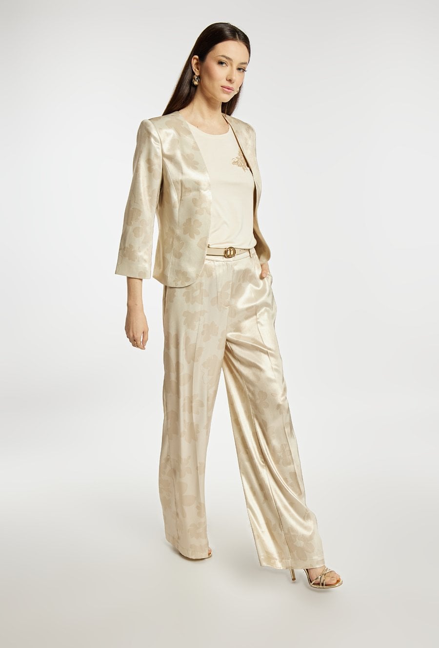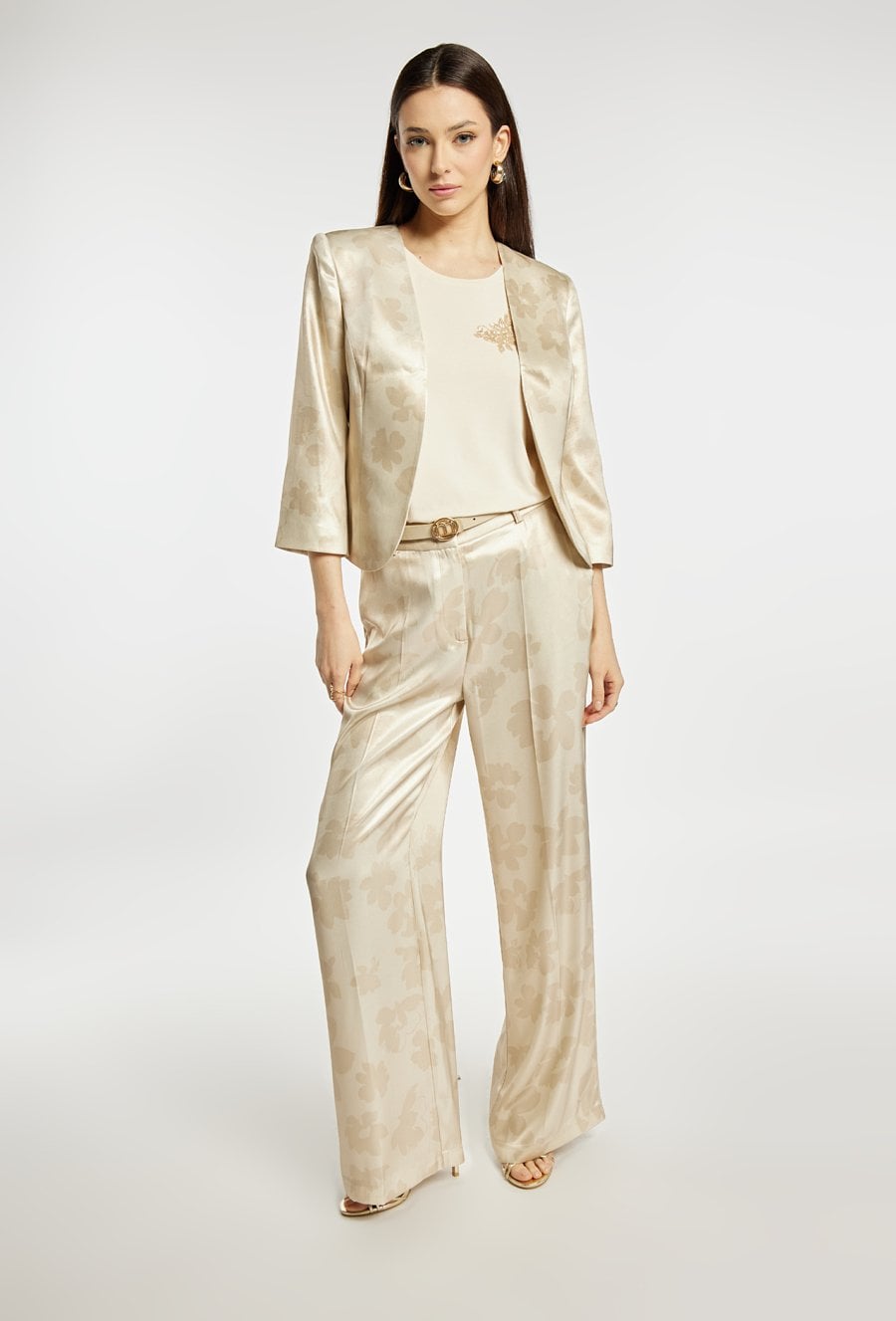 Spodnie o eleganckim, prostym kroju z długą, swobodnie układającą się nogawką. Spodnie wykonane z lekkiej, połyskującej tkaniny z delikatnym, kwiatowym wzorem, który dodaje całości subtelnej elegancji. Polecamy zestawić je z pasującą marynarką, tworząc spójny i stylowy komplet. Kod do marynarki: 26W-BZR0150. Modelka na zdjęciu ma 177 cm wzrostu i prezentuje rozmiar 36.