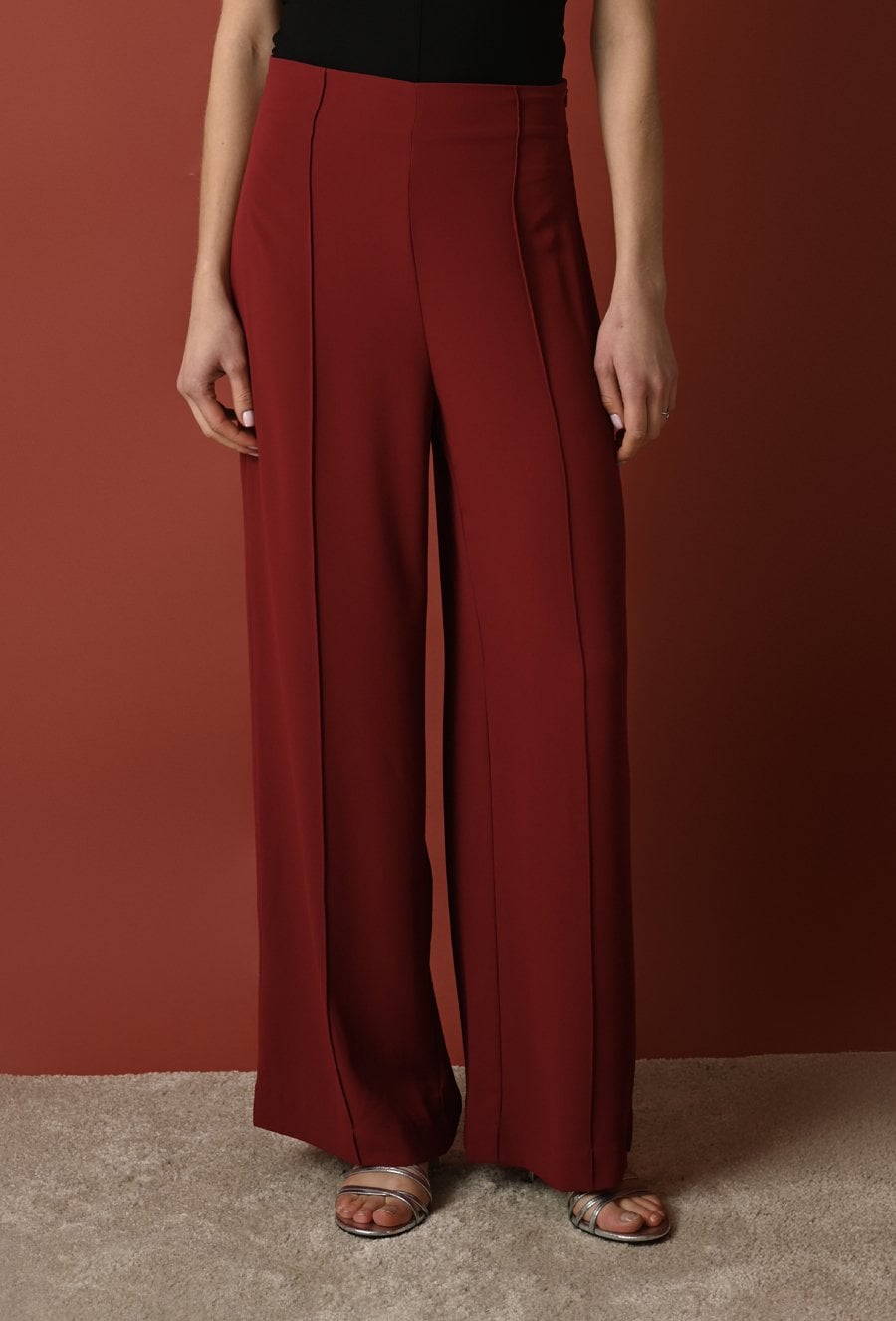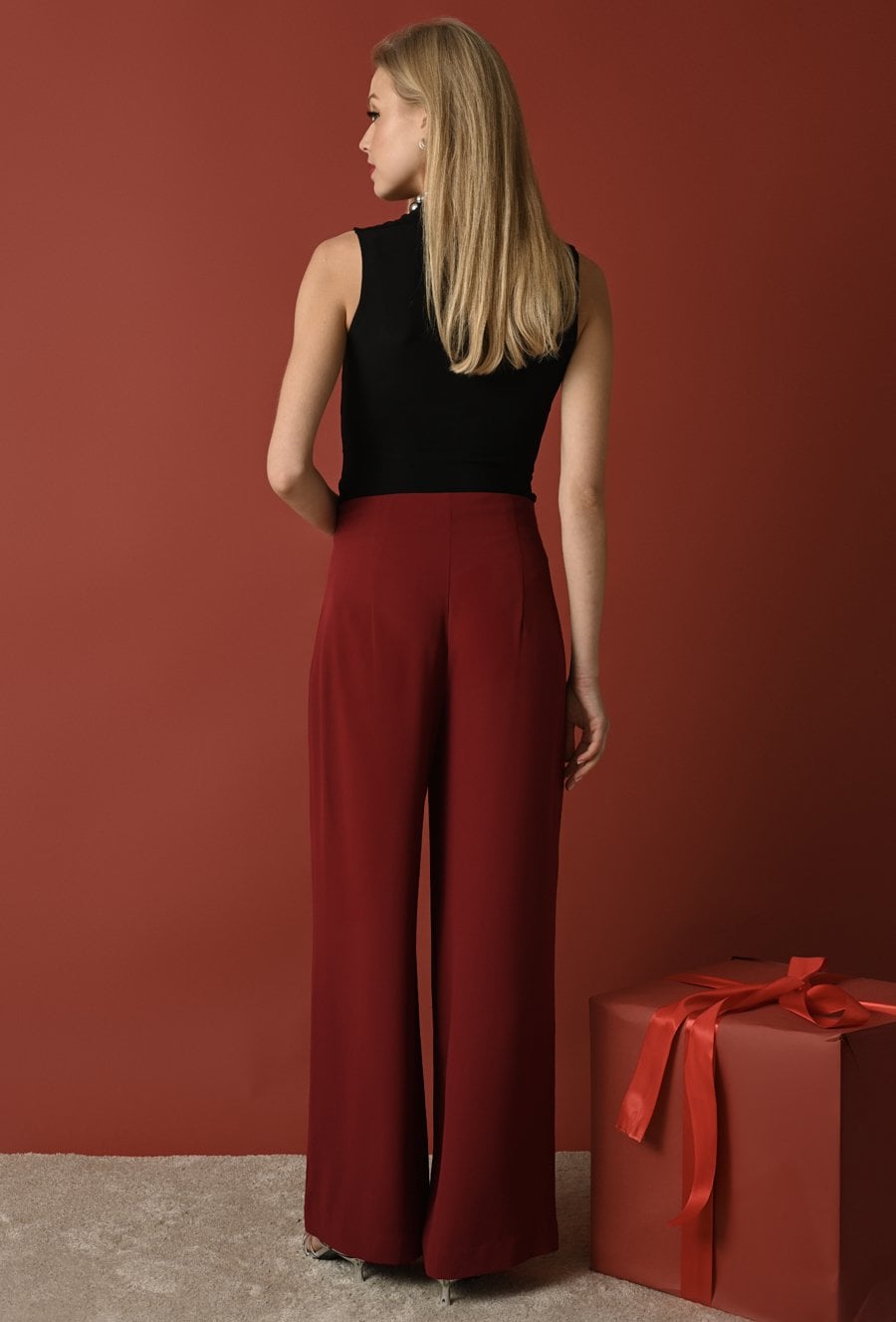 Eleganckie spodnie garniturowe o wysokim stanie, zaprojektowane z myślą o podkreśleniu sylwetki. Szerokie nogawki zapewniają komfort i modny wygląd, a przeszycie optycznie wyszczupla nogi. Model zapinany na kryty zamek, co gwarantuje schludne i estetyczne wykończenie. Idealne do formalnych stylizacji oraz biznesowych outfitów. Tworzy komplet z marynarką FEM-BZR1000-25Z. Modelka na zdjęciu ma 177 cm wzrostu i prezentuje rozmiar 36.
