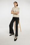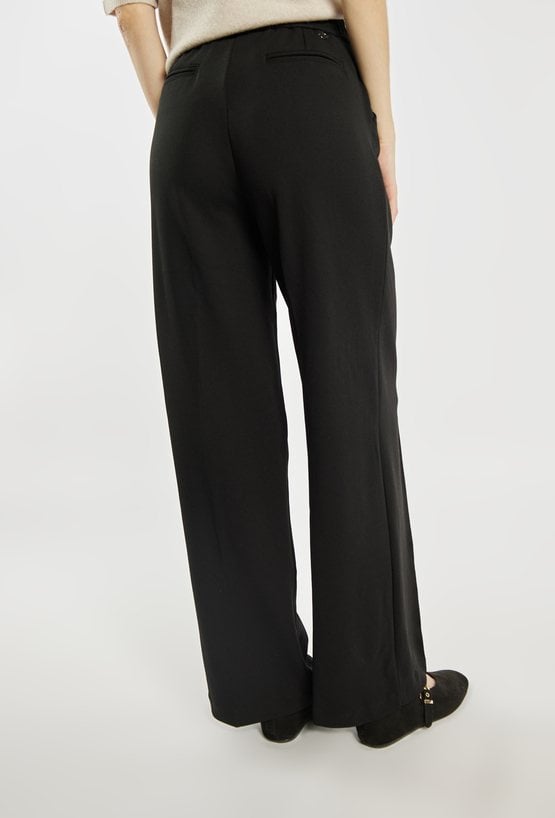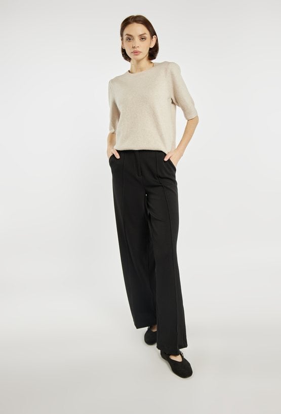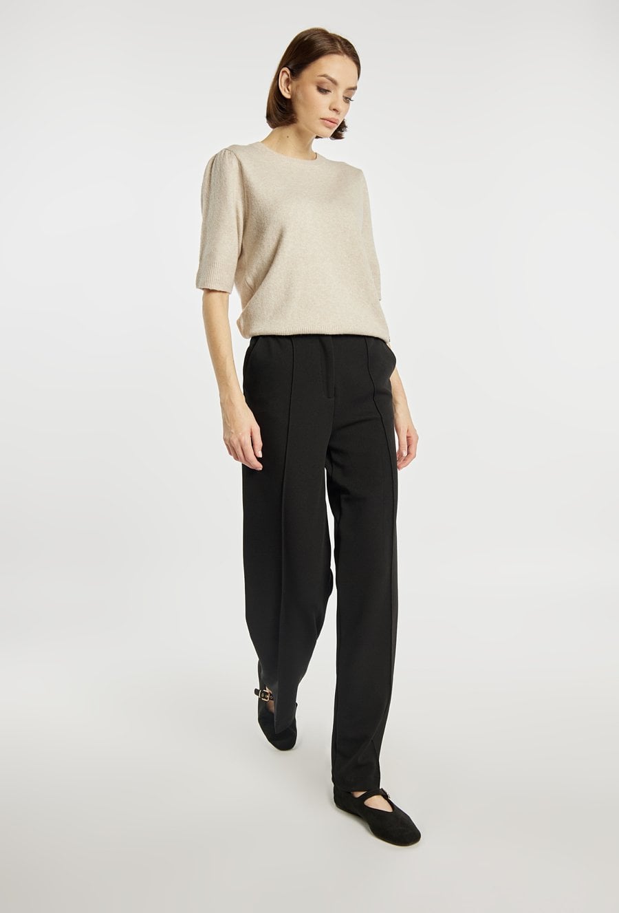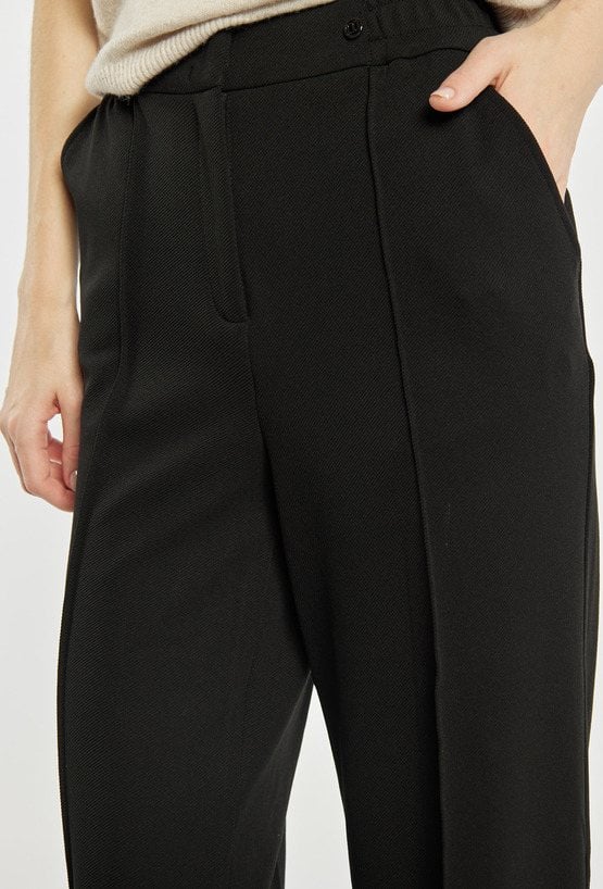 Spodnie o klasycznym kroju, który optycznie wydłuża sylwetkę i sprawdza się w wielu stylizacjach. Spodnie mają długą, prostą nogawkę z delikatnym przeszyciem z przodu, co nadaje im elegancki charakter. Spodnie doskonale pasują zarówno do codziennych zestawów z balerinami, jak i do bardziej formalnych stylizacji z butami na obcasie. Modelka na zdjęciu ma 177 cm wzrostu i prezentuje rozmiar 36.