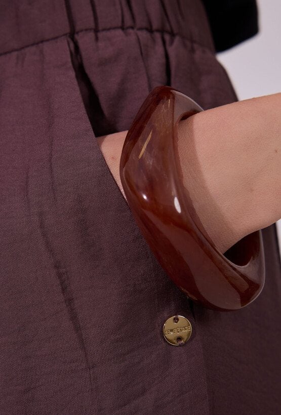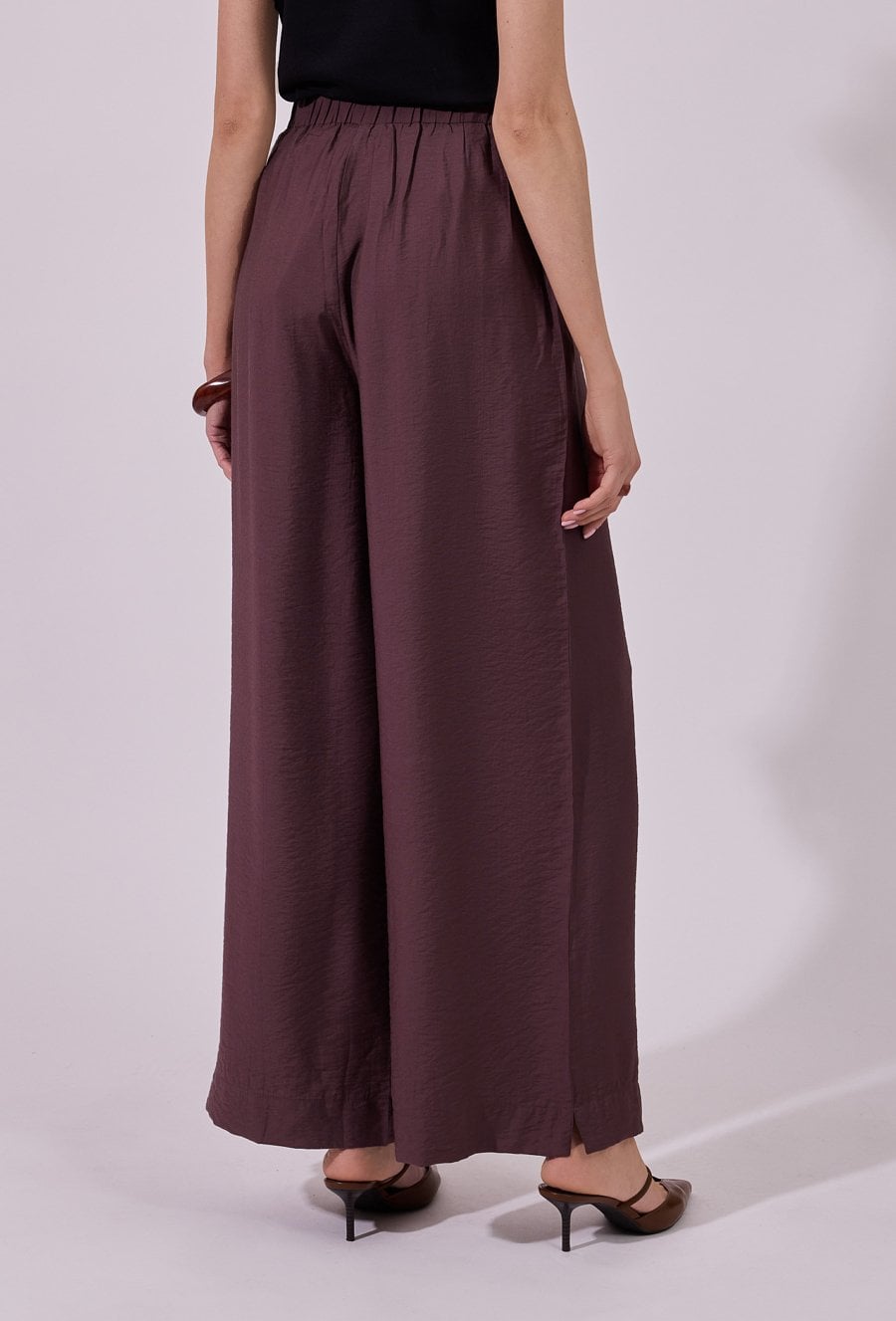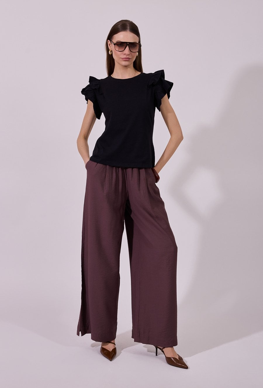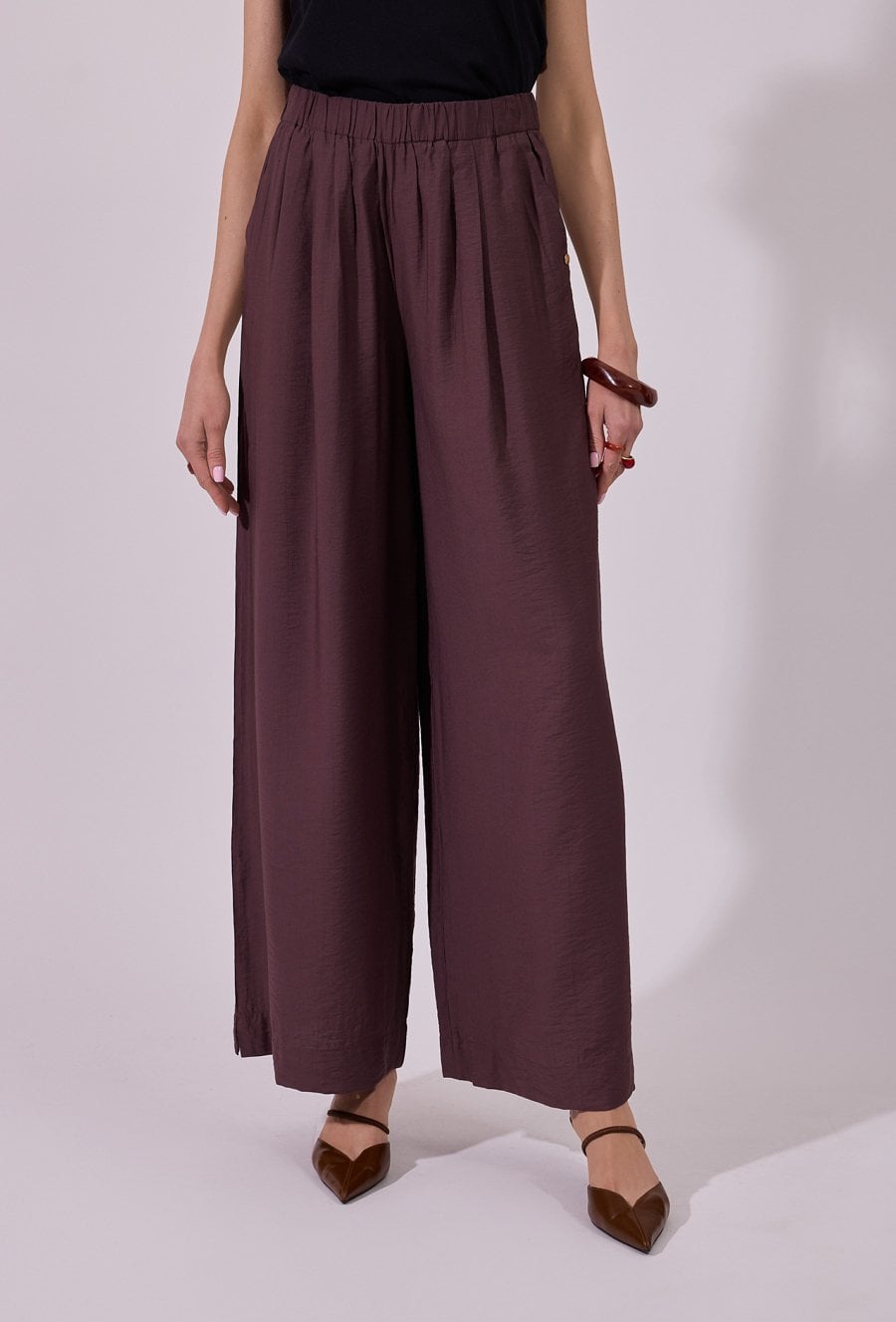 Spodnie damskie o luźnym, szerokim kroju typu wide leg. Model z wysokim stanem i elastyczną gumką w pasie, która zapewnia wygodne dopasowanie oraz komfort noszenia. Praktyczne kieszenie zwiększają funkcjonalność, a minimalistyczny fason sprawia, że spodnie doskonale sprawdzą się zarówno w codziennych, jak i bardziej eleganckich, letnich stylizacjach. Modelka na zdjęciu ma 177 cm wzrostu i prezentuje rozmiar 36.