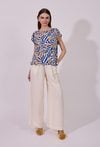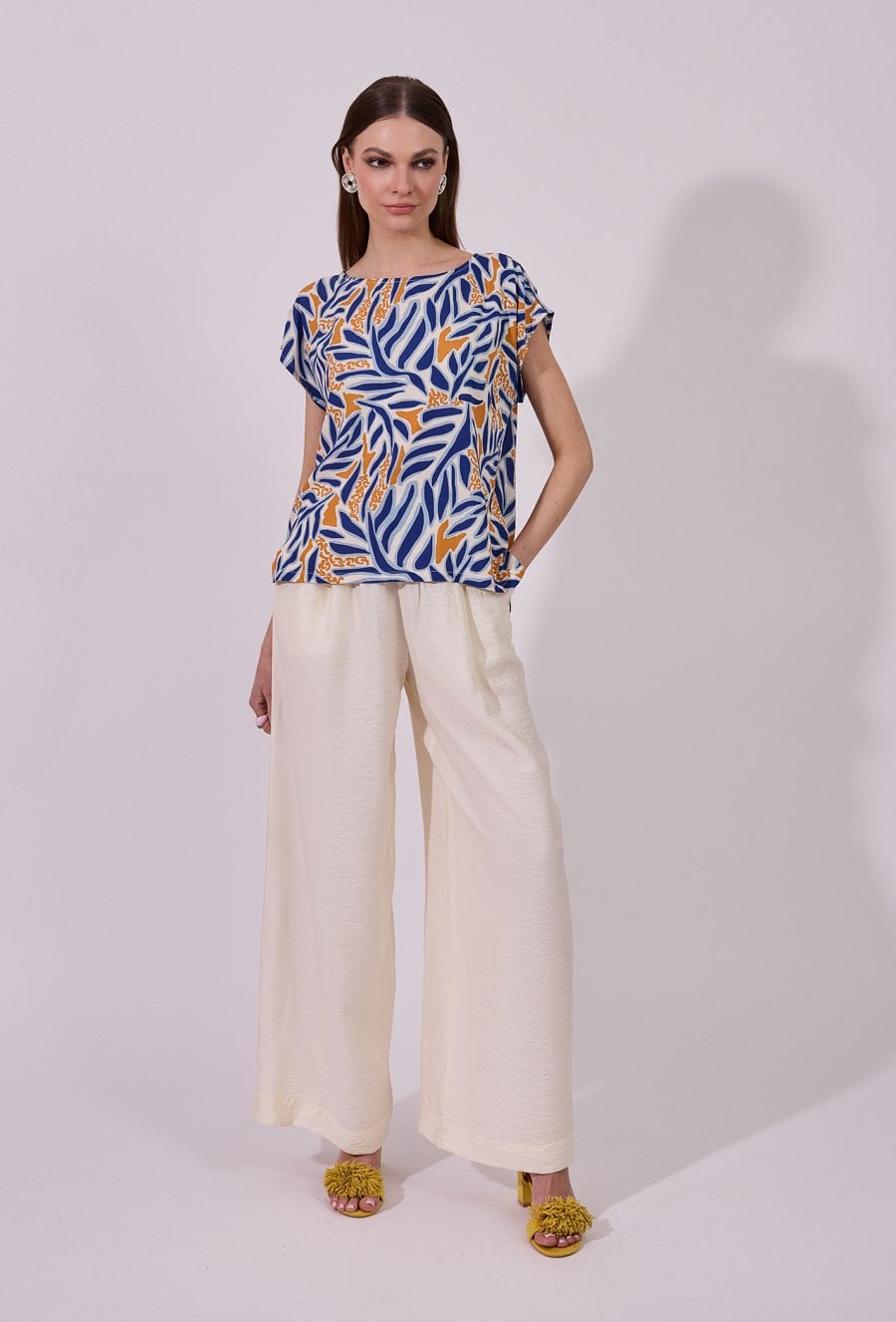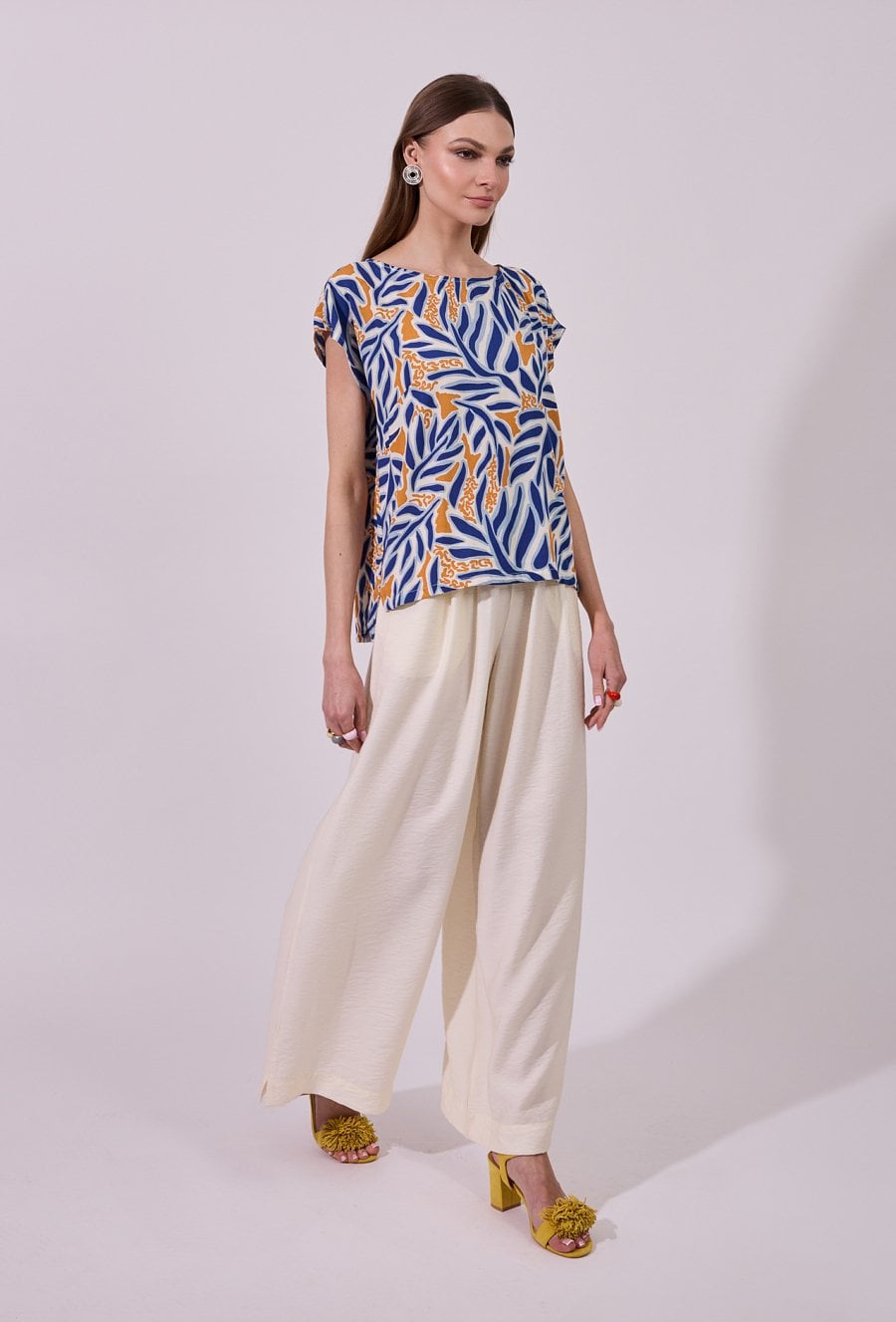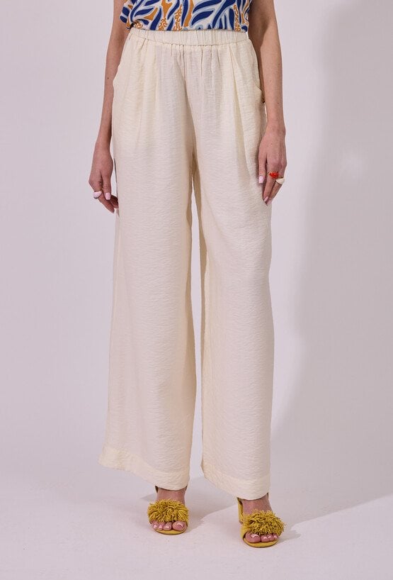 Spodnie damskie o luźnym, szerokim kroju typu wide leg. Model z wysokim stanem i elastyczną gumką w pasie, która zapewnia wygodne dopasowanie oraz komfort noszenia. Praktyczne kieszenie zwiększają funkcjonalność, a minimalistyczny fason sprawia, że spodnie doskonale sprawdzą się zarówno w codziennych, jak i bardziej eleganckich, letnich stylizacjach. Modelka na zdjęciu ma 177 cm wzrostu i prezentuje rozmiar 36.