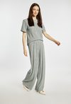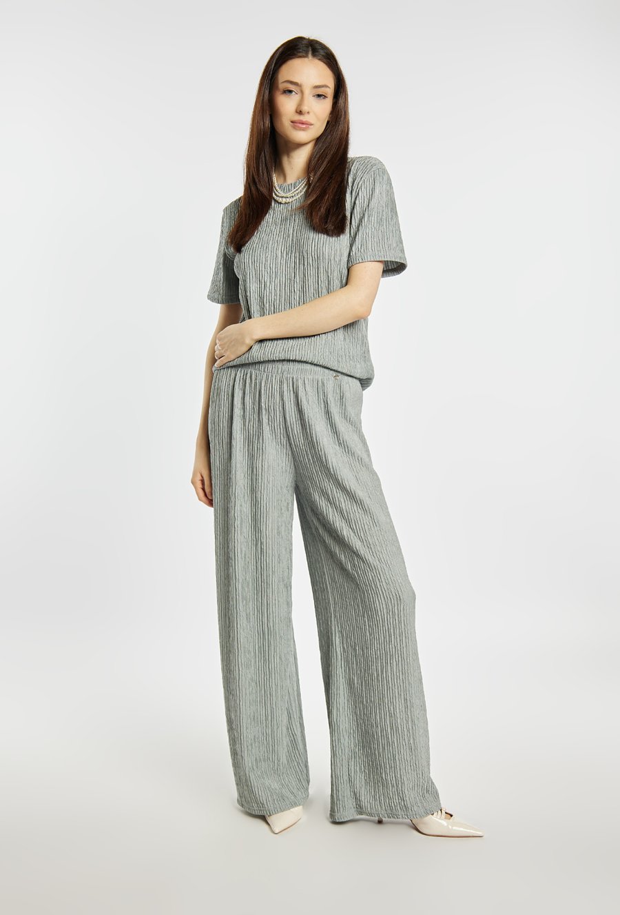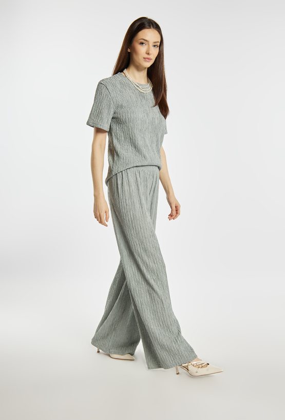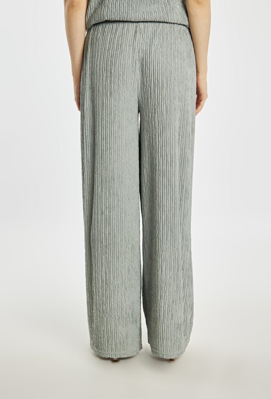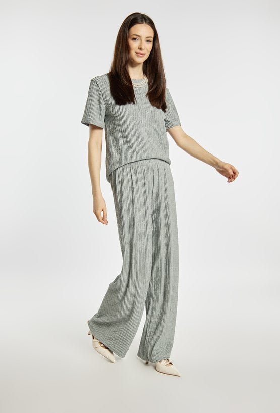 Spodnie damskie o luźnym, komfortowym kroju. Model z szeroką nogawką oraz elastyczną talią, która zapewnia wygodne dopasowanie do sylwetki. Strukturalna tkanina z delikatnym, pionowym efektem marszczenia nadaje całości nowoczesnego i stylowego charakteru. Model można zestawić z pasującą górą z tej samej linii, tworząc modny i spójny komplet. Kod do T-shirtu: TSH1680. Modelka na zdjęciu ma 177 cm wzrostu i prezentuje rozmiar S/M.