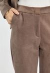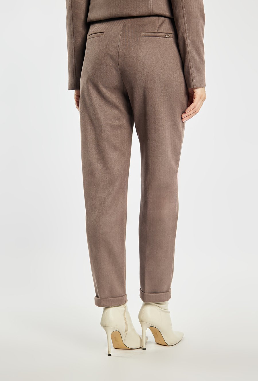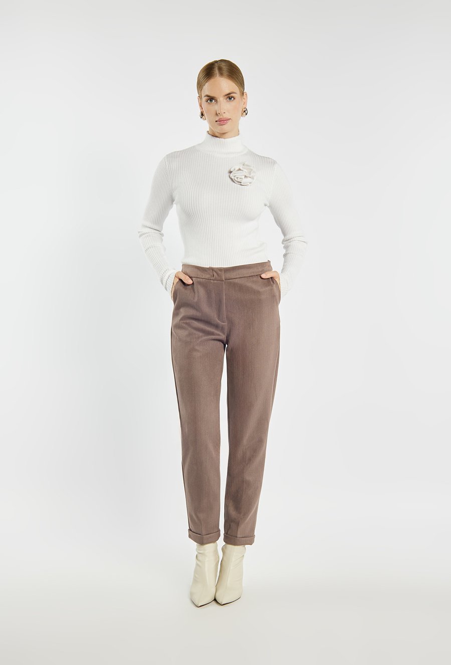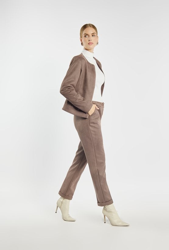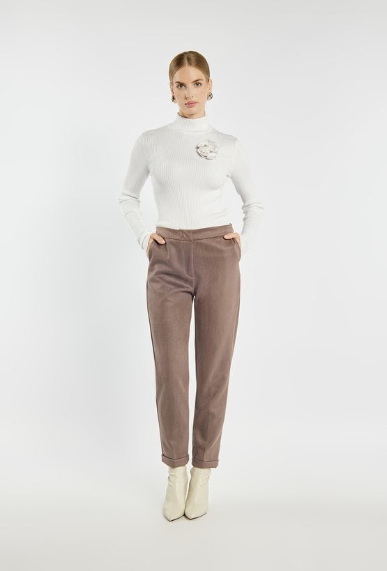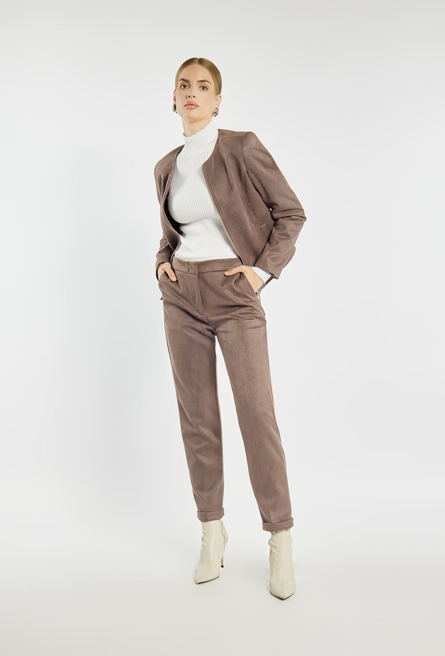 Spodnie damskie o prostym kroju. Nogawki zakończone mankietem dodają elegancji i nowoczesnego charakteru. To model, który świetnie sprawdzi się zarówno w stylizacjach biurowych, jak i na wyjątkowe okazje. Można je skompletować z marynarką z tej samej kolekcji. Modelka na zdjęciu ma 177 cm wzrostu i prezentuje rozmiar: 25Z-BZR0830. Modelka na zdjęciu ma 177 cm wzrostu i prezentuje rozmiar 36.