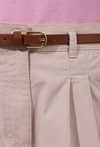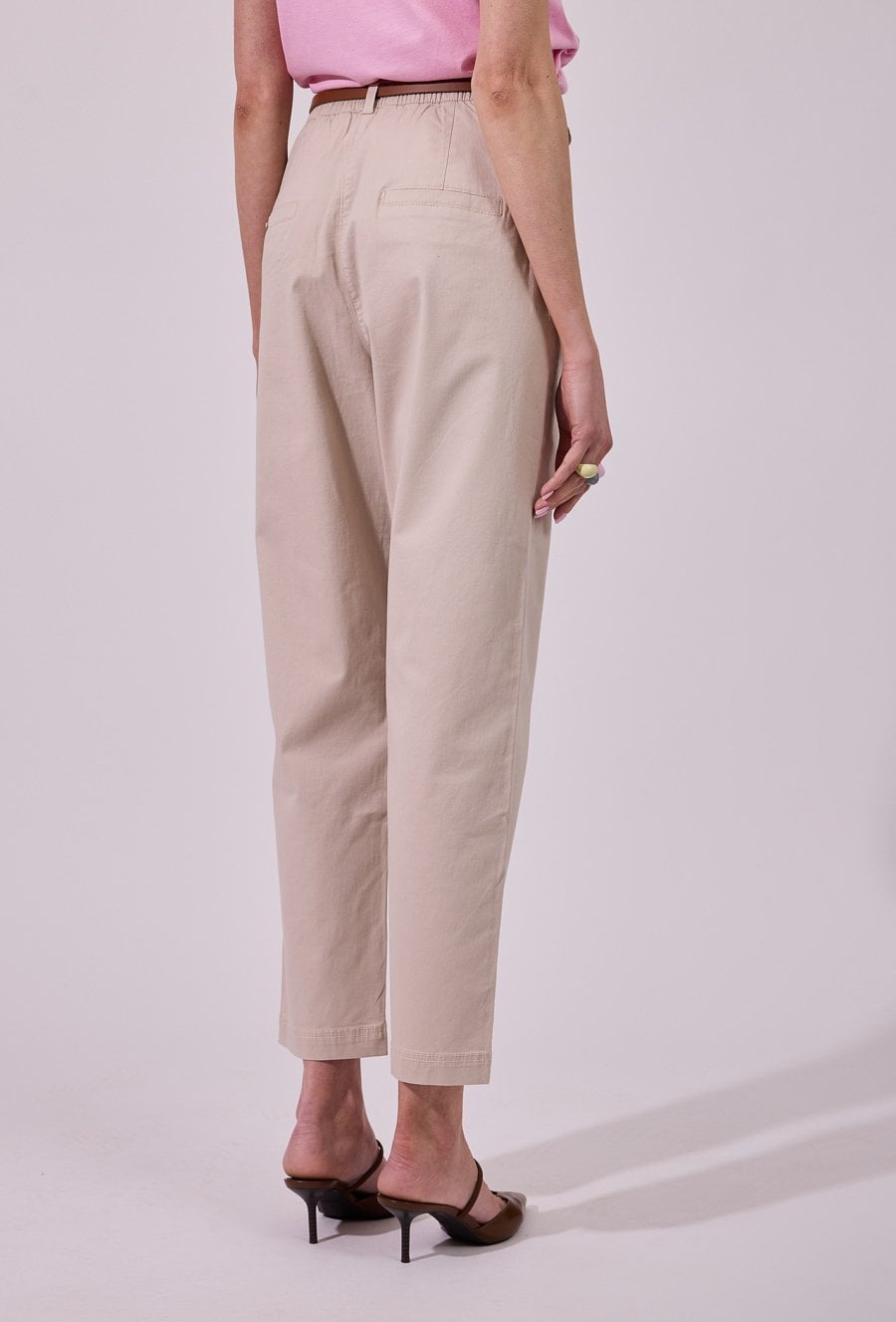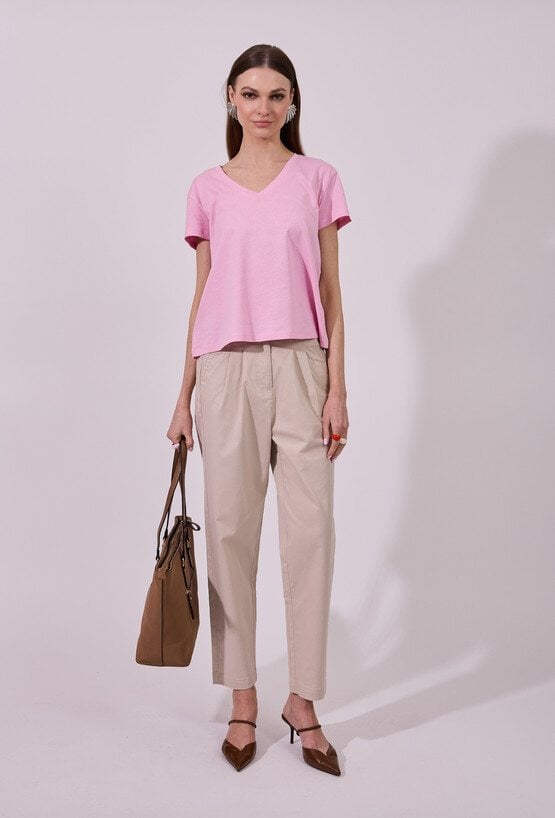 Spodnie damskie o prostym, swobodnym kroju. Model z wysokim stanem oraz zakładkami z przodu, które zapewniają komfort noszenia i eleganckie ułożenie na sylwetce. Klasyczne kieszenie oraz szlufki w pasie umożliwiają stylizację z paskiem, podkreślając talię. Modelka na zdjęciu ma 177 cm wzrostu i prezentuje rozmiar 36.