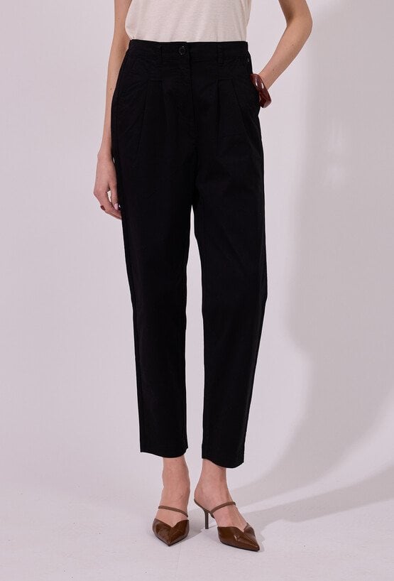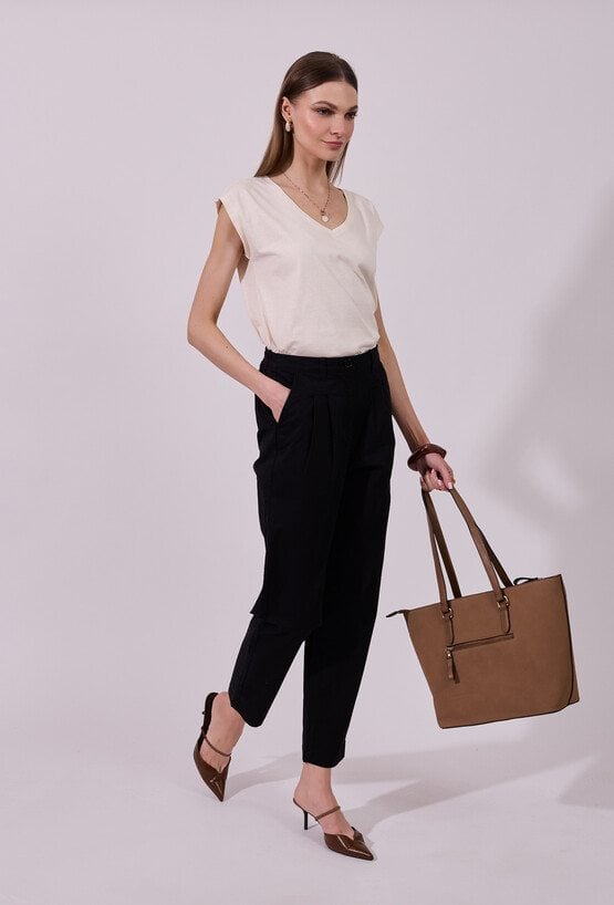 Spodnie damskie o prostym, swobodnym kroju. Model z wysokim stanem oraz zakładkami z przodu, które zapewniają komfort noszenia i eleganckie ułożenie na sylwetce. Klasyczne kieszenie oraz szlufki w pasie umożliwiają stylizację z paskiem, podkreślając talię. Modelka na zdjęciu ma 177 cm wzrostu i prezentuje rozmiar 36.