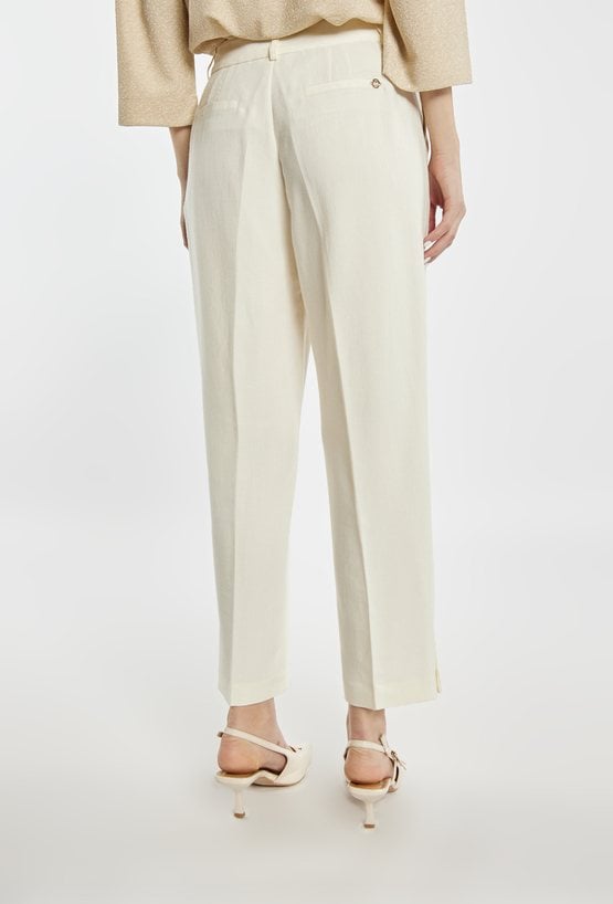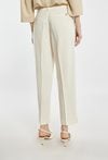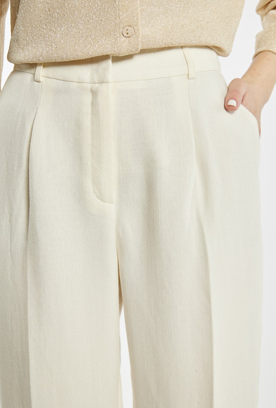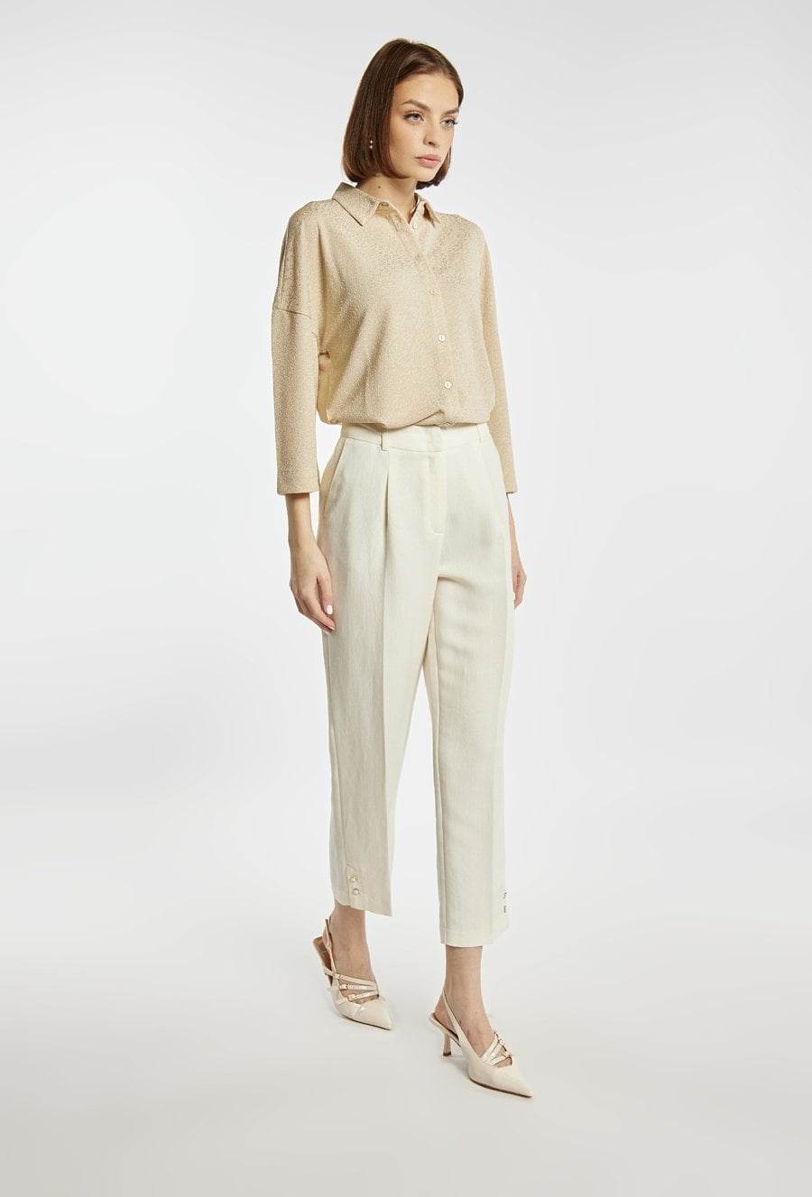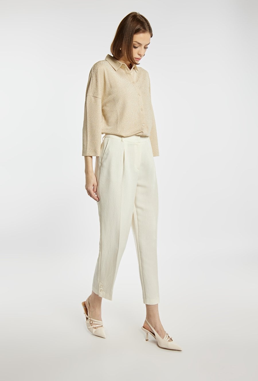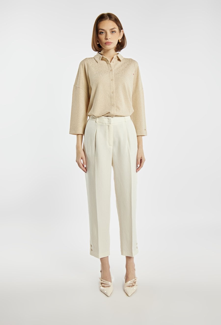 Spodnie damskie o eleganckim, klasycznym kroju. Model z prostą nogawką o długości przed kostkę. Spodnie damskie z dodatkiem wiskozy zapewniają komfort noszenia, przewiewność i przyjemne dopasowanie do sylwetki. Doskonale sprawdzą się w stylizacjach biurowych, wizytowych oraz w eleganckich zestawach na co dzień. Modelka na zdjęciu ma 177 cm wzrostu i prezentuje rozmiar 36.