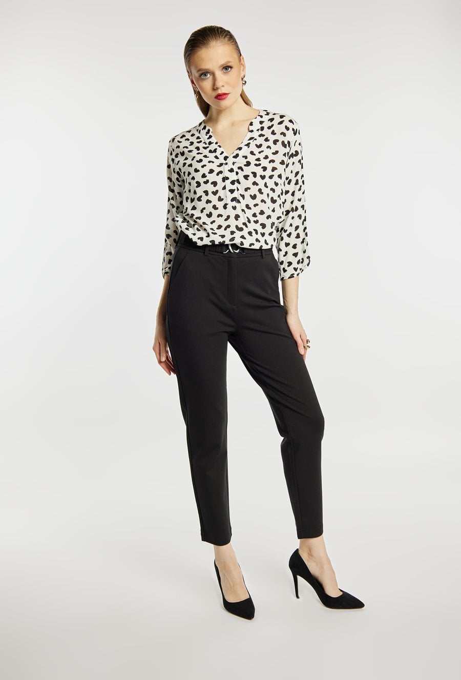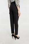 Spodnie damskie wykonane z eleganckiego, elastycznego materiału. Spodnie o zwężanej nogawce i wysokim stanie subtelnie podkreślają sylwetkę, zapewniając jednocześnie wygodę noszenia. Pasek z ozdobną klamrą dodaje im klasy, dzięki czemu model świetnie sprawdza się zarówno w stylizacjach biznesowych, jak i codziennych. Modelka na zdjęciu ma 177 cm wzrostu i prezentuje rozmiar 36.