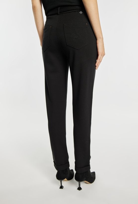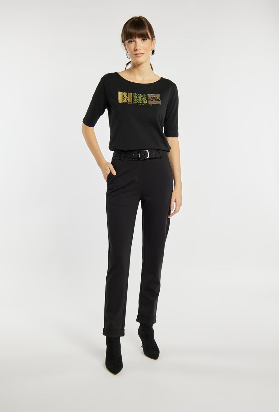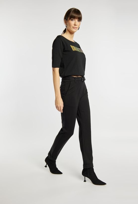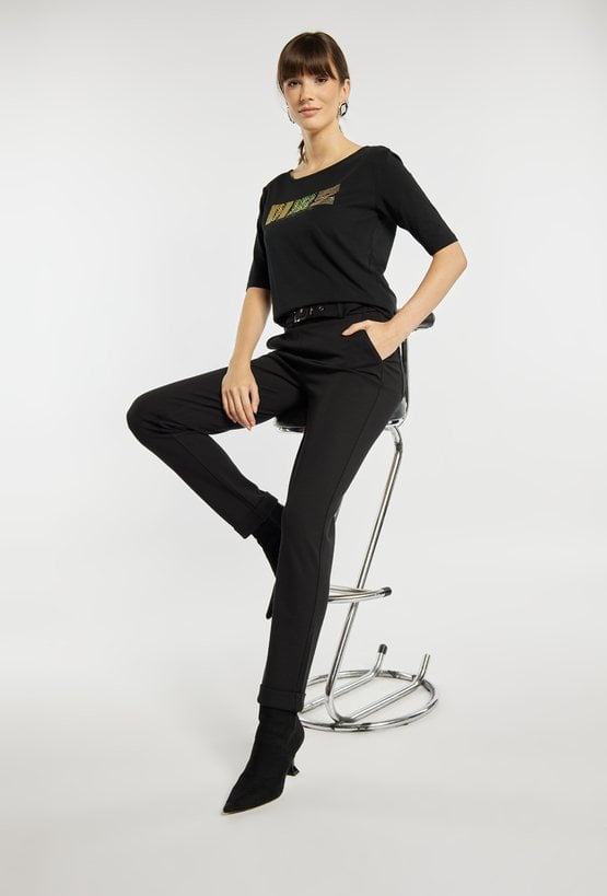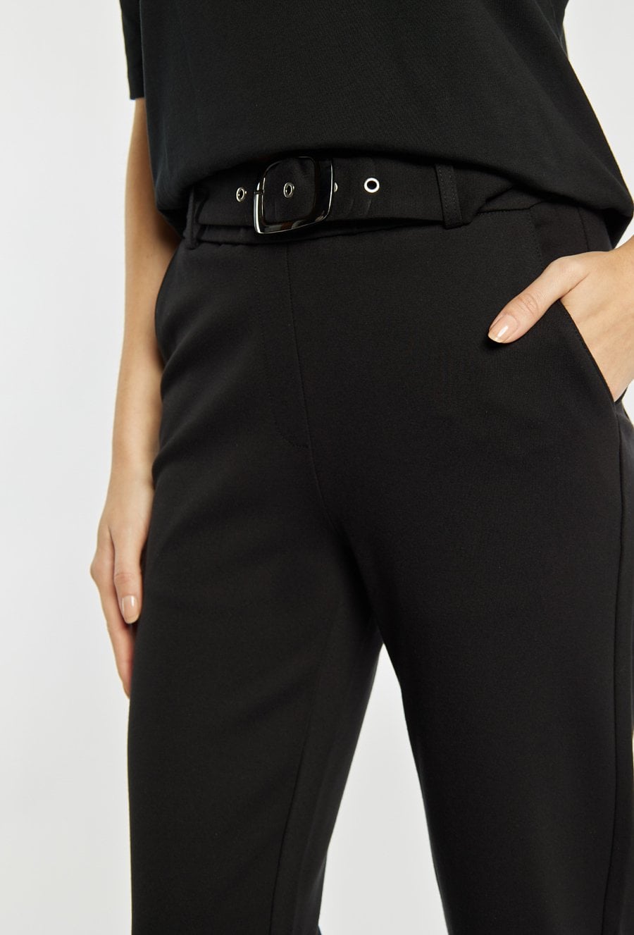 Spodnie damskie o eleganckim, lekko zwężanym kroju. Spodnie mają klasyczną długość, wywinięty dół nogawki oraz praktyczne kieszenie po bokach. Spodnie wyposażone są w pasek z klamrą, który podkreśla talię i dodaje całości bardziej dopracowanego charakteru. Idealne do stylizacji biurowych i codziennych. Modelka na zdjęciu ma 177 cm wzrostu i prezentuje rozmiar 36.