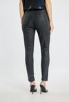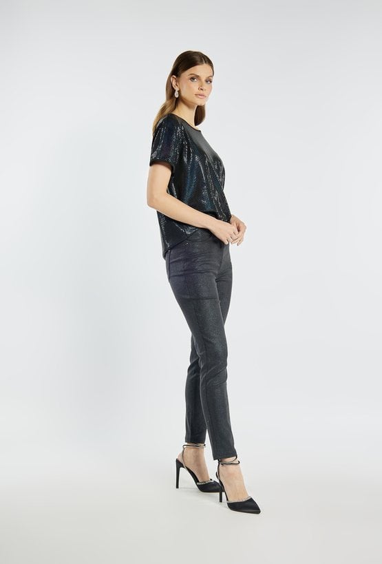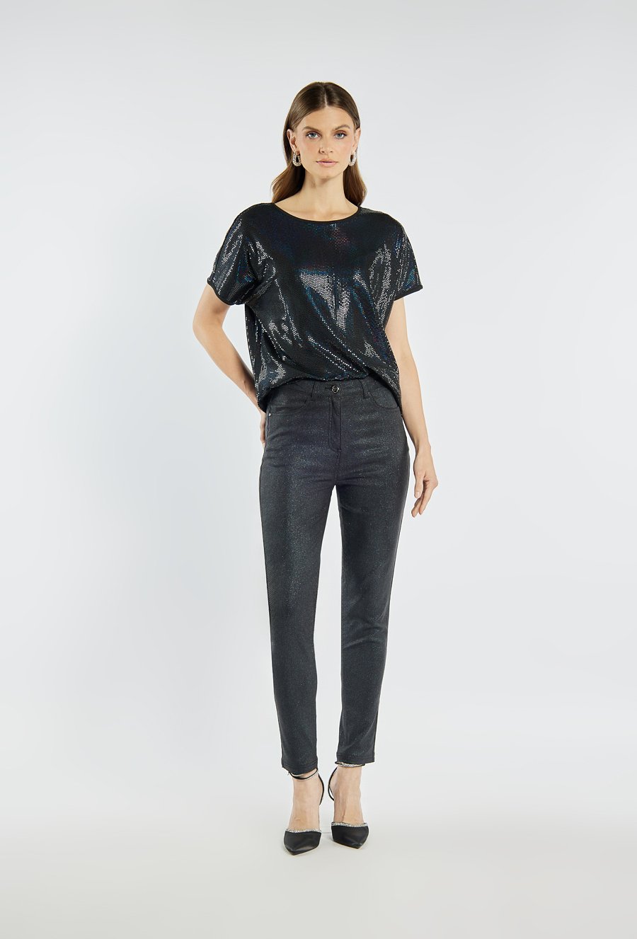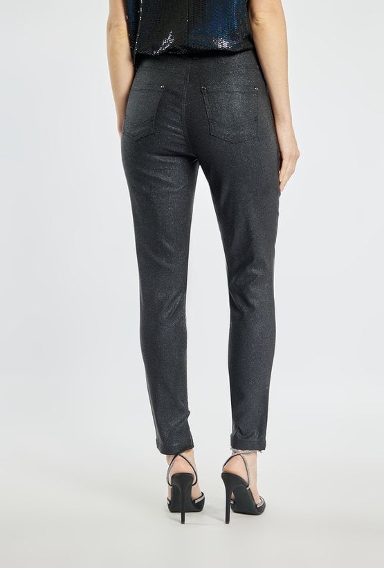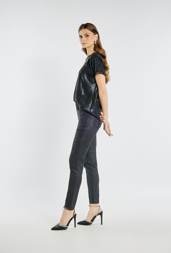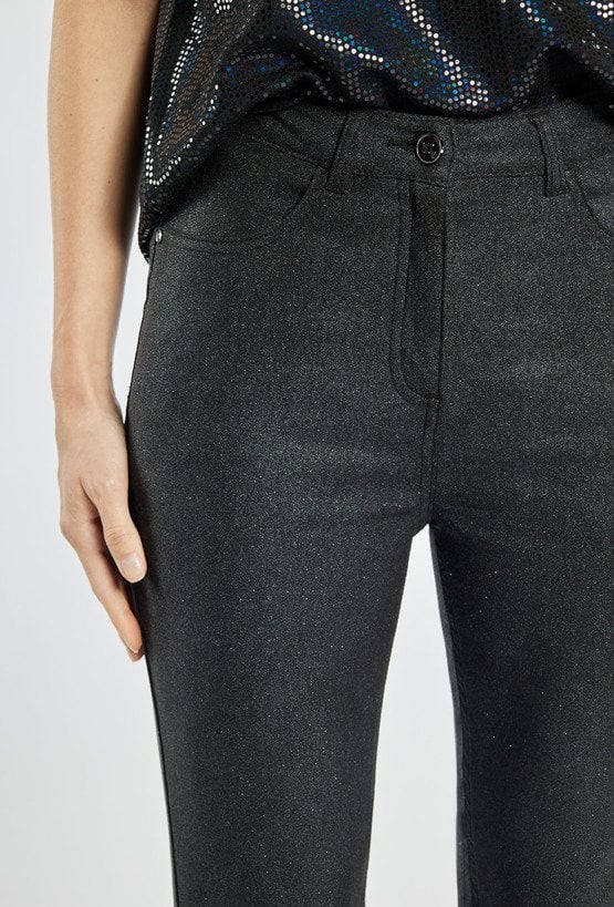 Stylowe spodnie o dopasowanym kroju z delikatnym połyskiem, idealne na sylwestrową noc i inne wyjątkowe okazje. Klasyczne zapięcie na guzik i suwak. Doskonale komponują się zarówno ze szpilkami, jak i z błyszczącą bluzką, tworząc efektowny, wieczorowy look. Modelka na zdjęciu ma 177 cm wzrostu i prezentuje rozmiar 36.