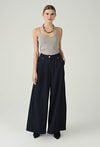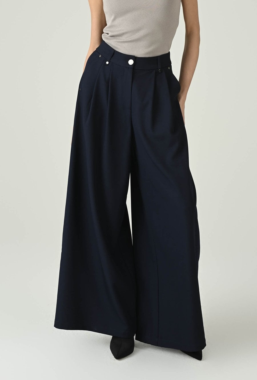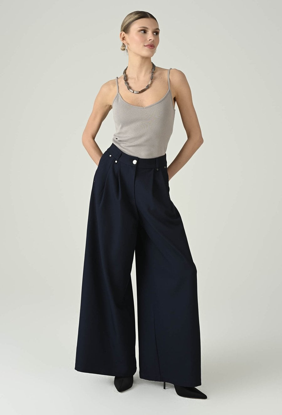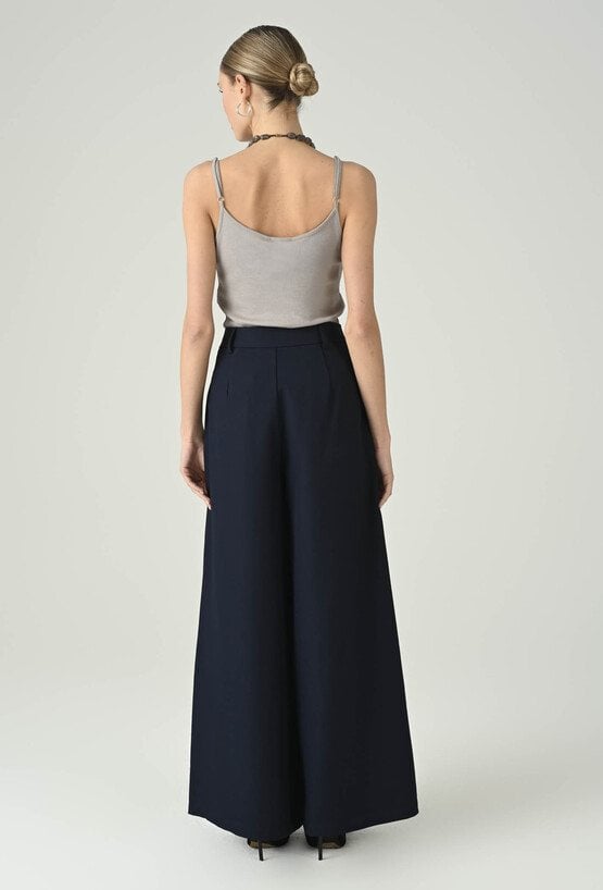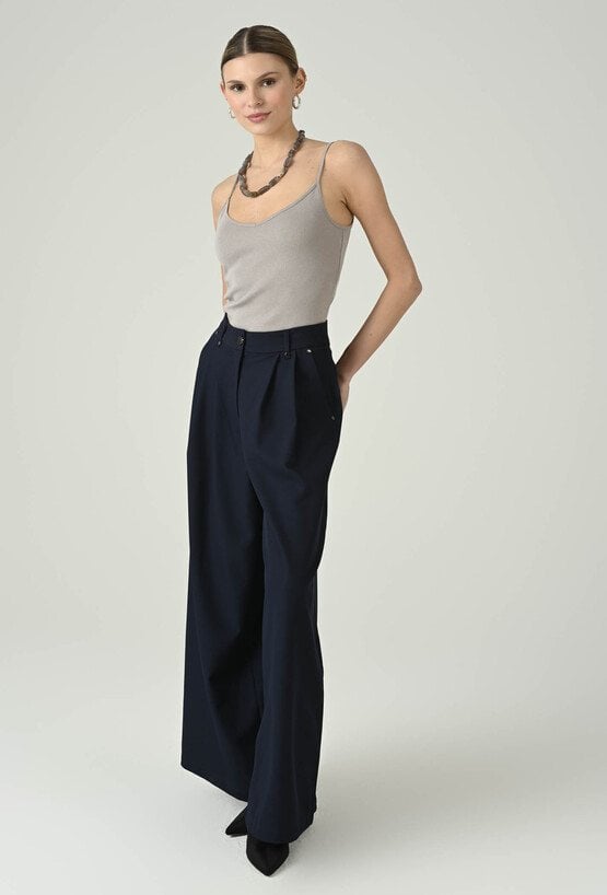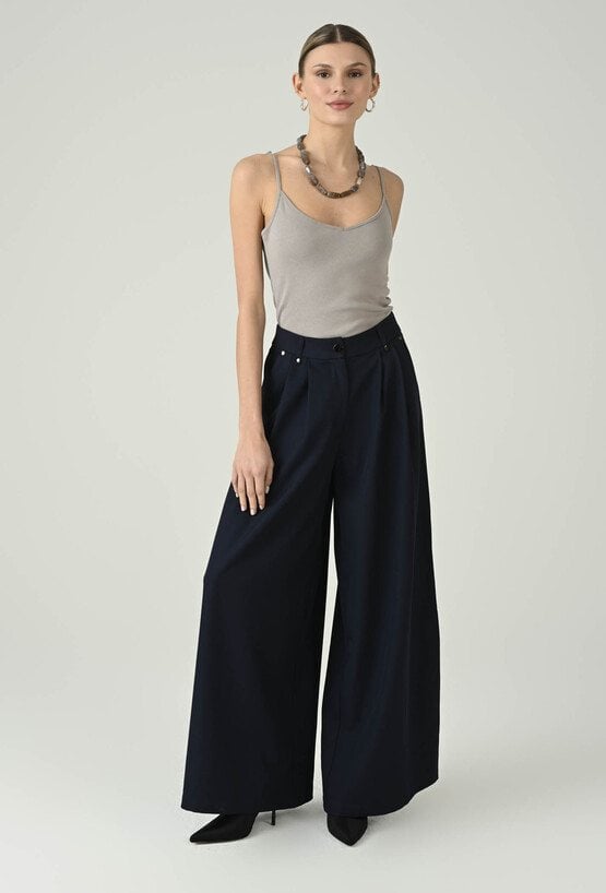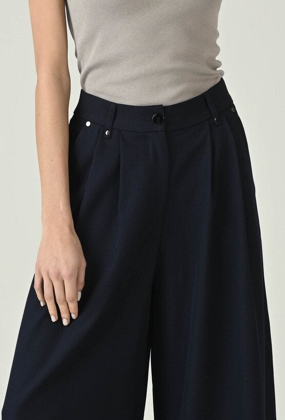 Eleganckie spodnie w głębokim granacie, które wyróżniają się szeroką nogawką i pięknie układającym się fasonem. Wysoki stan podkreśla talię i optycznie wydłuża nogi, a dopracowane detale przy pasie dodają całości nowoczesnego charakteru. Luźniejszy krój zapewnia swobodę ruchów i komfort przez cały dzień, dzięki czemu model sprawdzi się zarówno w stylizacjach do pracy, jak i na bardziej wyjątkowe okazje. Noś je z dopasowanym topem, koszulą lub marynarką, aby uzyskać efekt eleganckiej, kobiecej sylwetki.