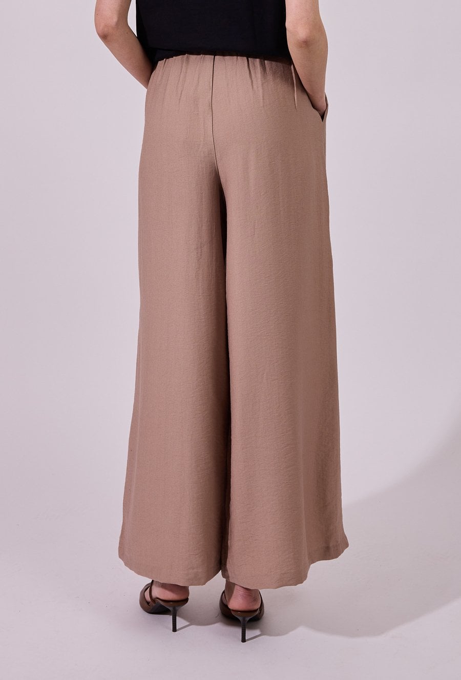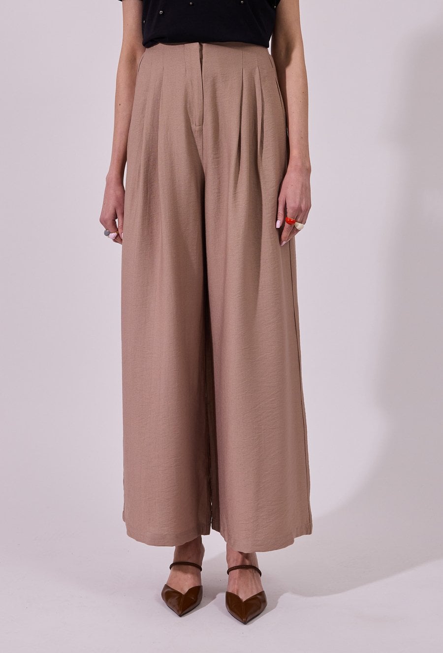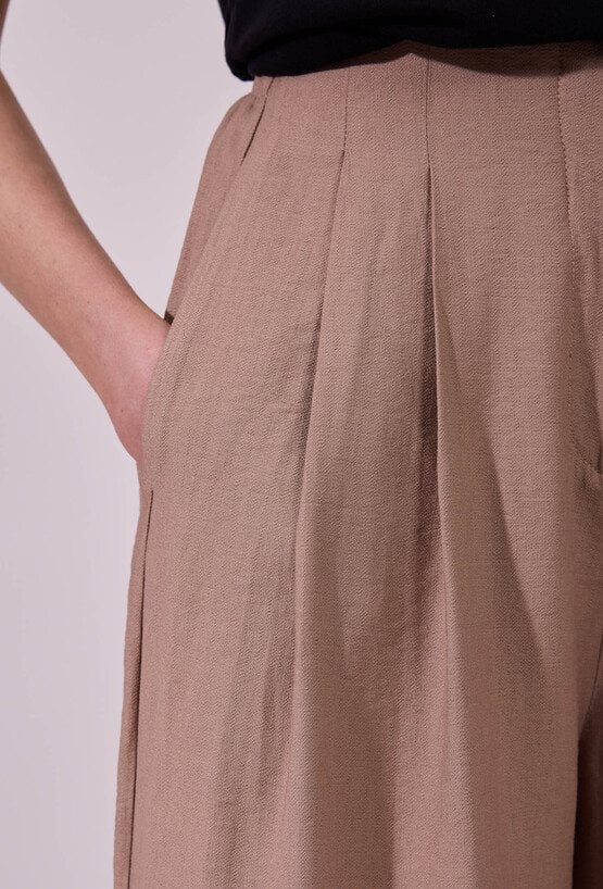Spodnie damskie o luźnym, szerokim kroju typu wide leg. Model z wysokim stanem. Minimalistyczny fason sprawia, że spodnie doskonale sprawdzą się zarówno w codziennych, jak i bardziej eleganckich stylizacjach. Modelka na zdjęciu ma 177 cm wzrostu i prezentuje rozmiar 36.